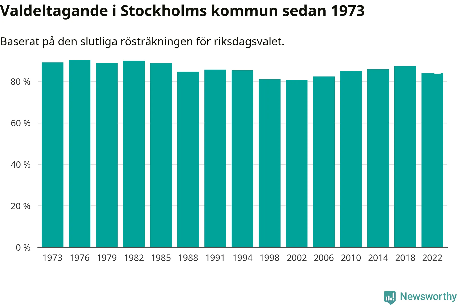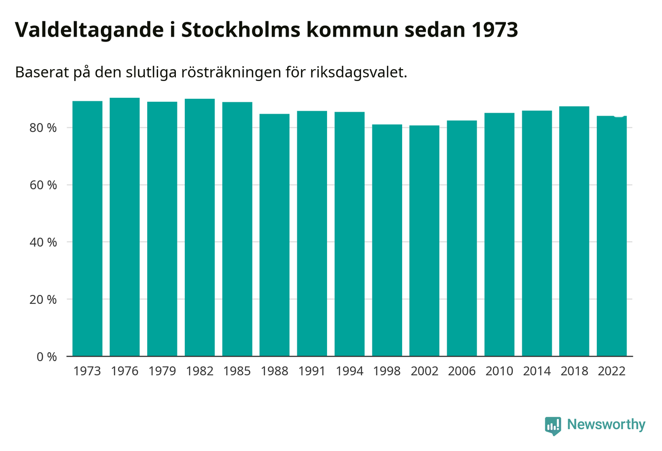 I hela riket landade valdeltagandet 2022 på 84,21 procent, att jämföra med 87,18 procent 2018.