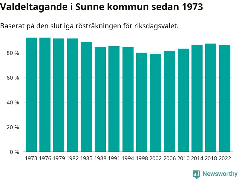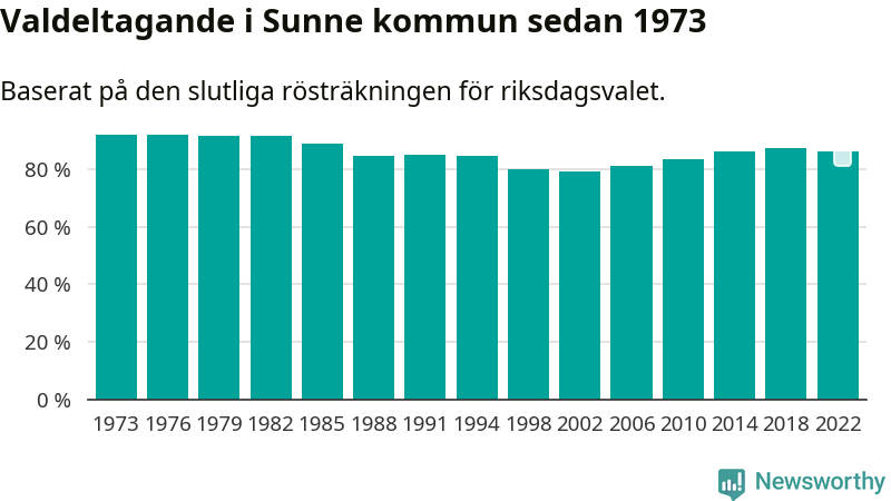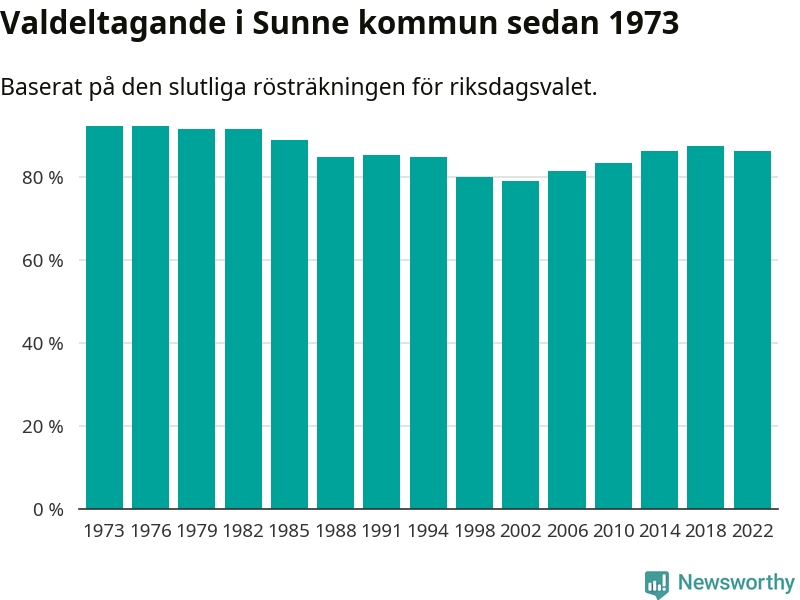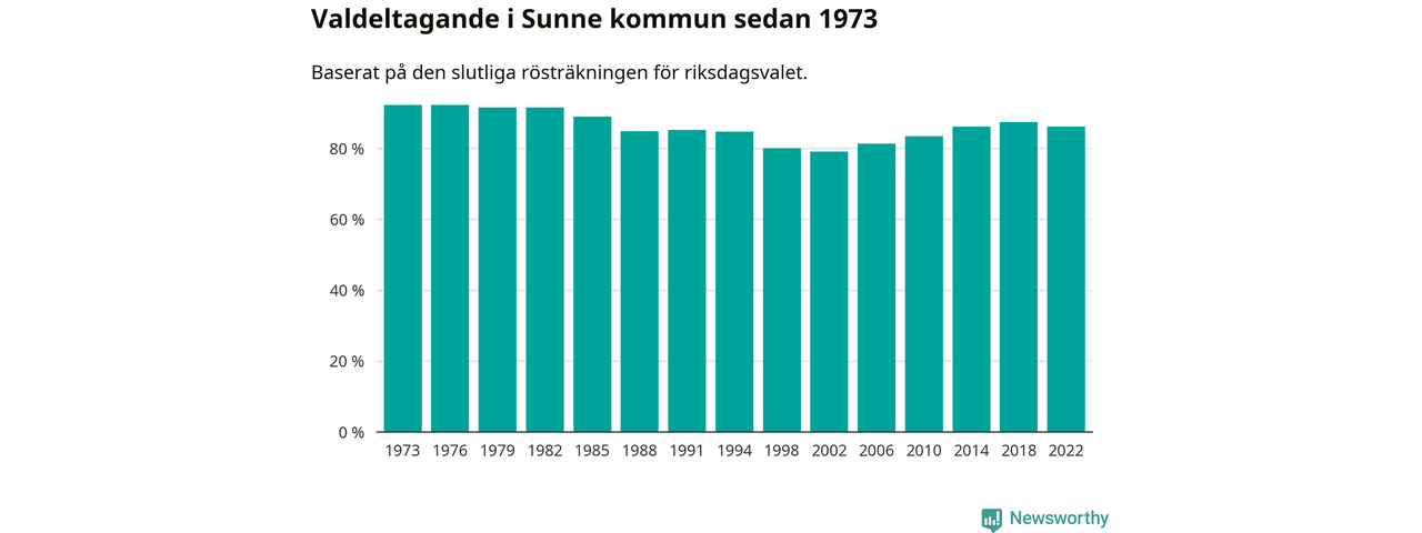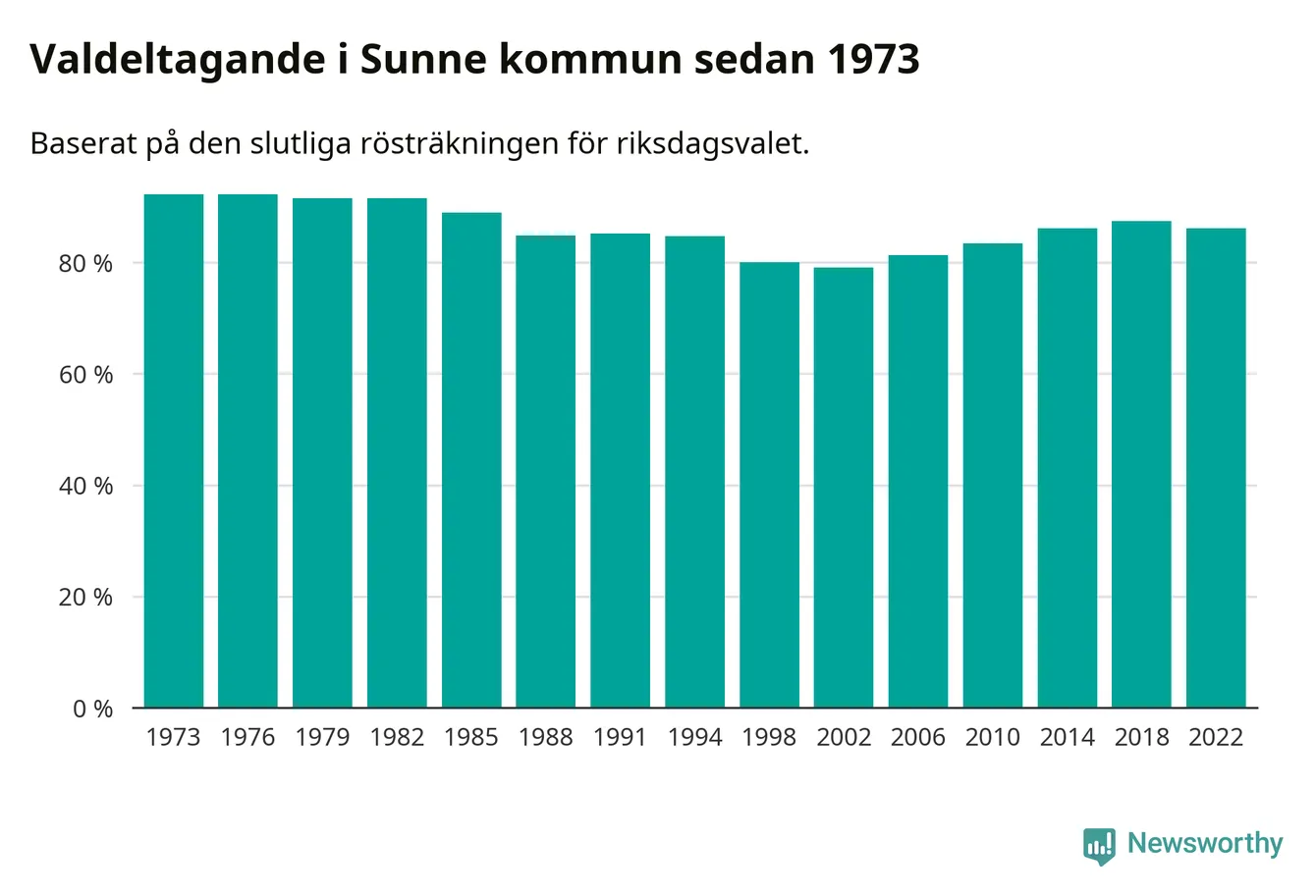 Sunne tillhör Värmlands läns valkrets. Där var valdeltagandet förra valet 85,2 procent. I hela riket landade valdeltagandet 2022 på 84,21 procent, att jämföra med 87,18 procent 2018.