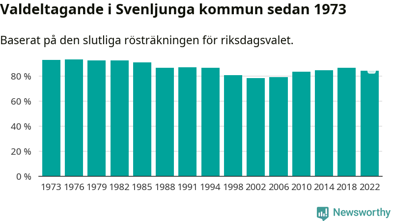Svenljunga tillhör Västra Götalands läns södra valkrets. Där var valdeltagandet förra valet 84,4 procent. I hela riket landade valdeltagandet 2022 på 84,21 procent, att jämföra med 87,18 procent 2018.