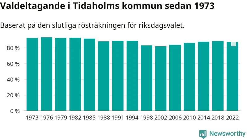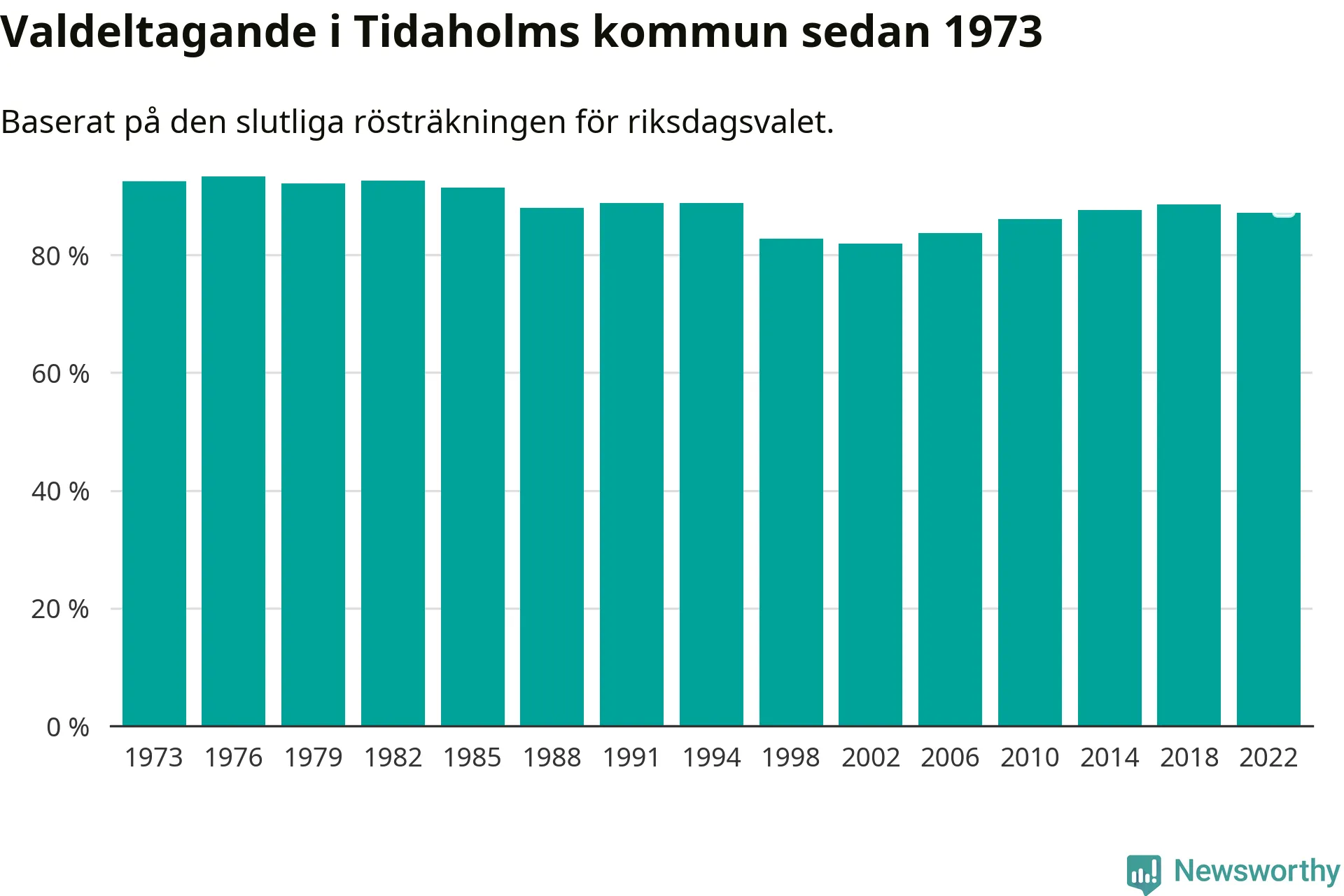 Tidaholm tillhör Västra Götalands läns östra valkrets. Där var valdeltagandet förra valet 86,1 procent. I hela riket landade valdeltagandet 2022 på 84,21 procent, att jämföra med 87,18 procent 2018.