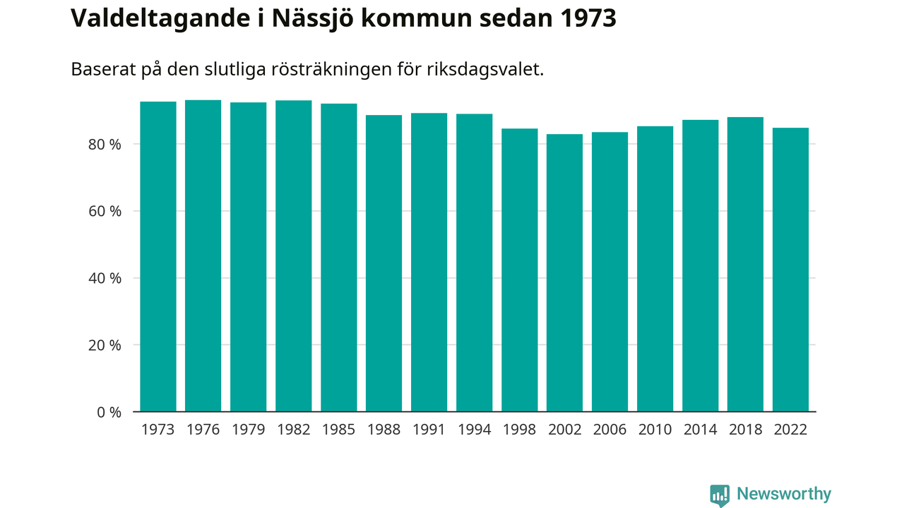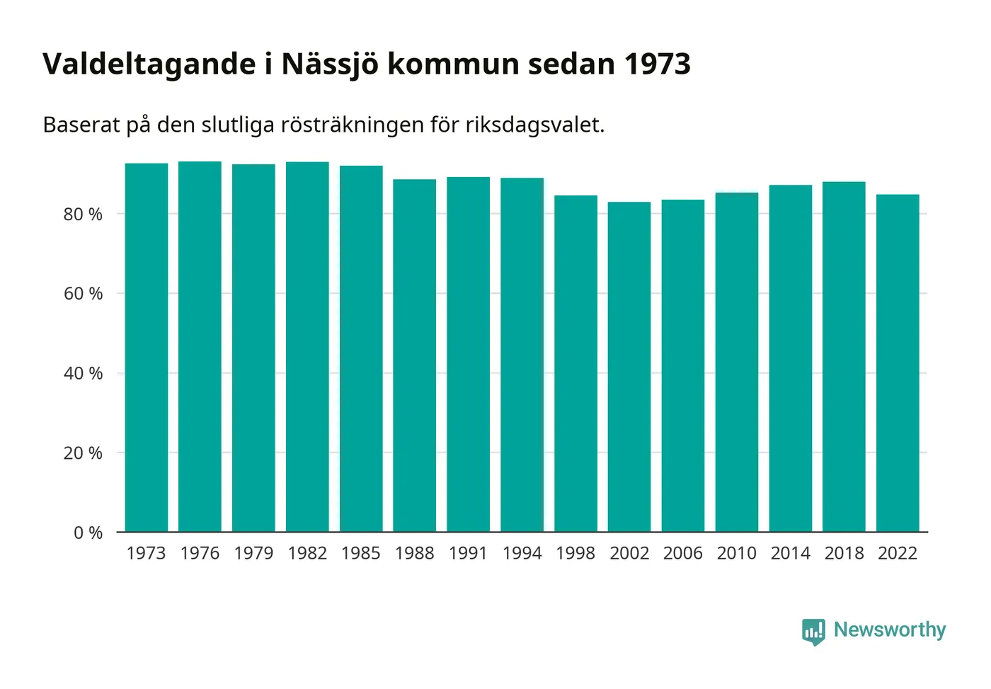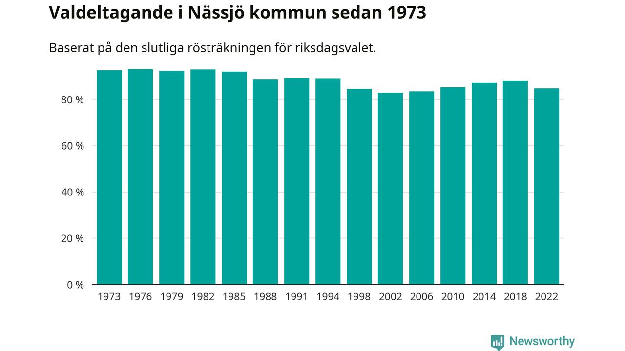 Nässjö tillhör Jönköpings läns valkrets. Där var valdeltagandet förra valet 85,3 procent. I hela riket landade valdeltagandet 2022 på 84,21 procent, att jämföra med 87,18 procent 2018.