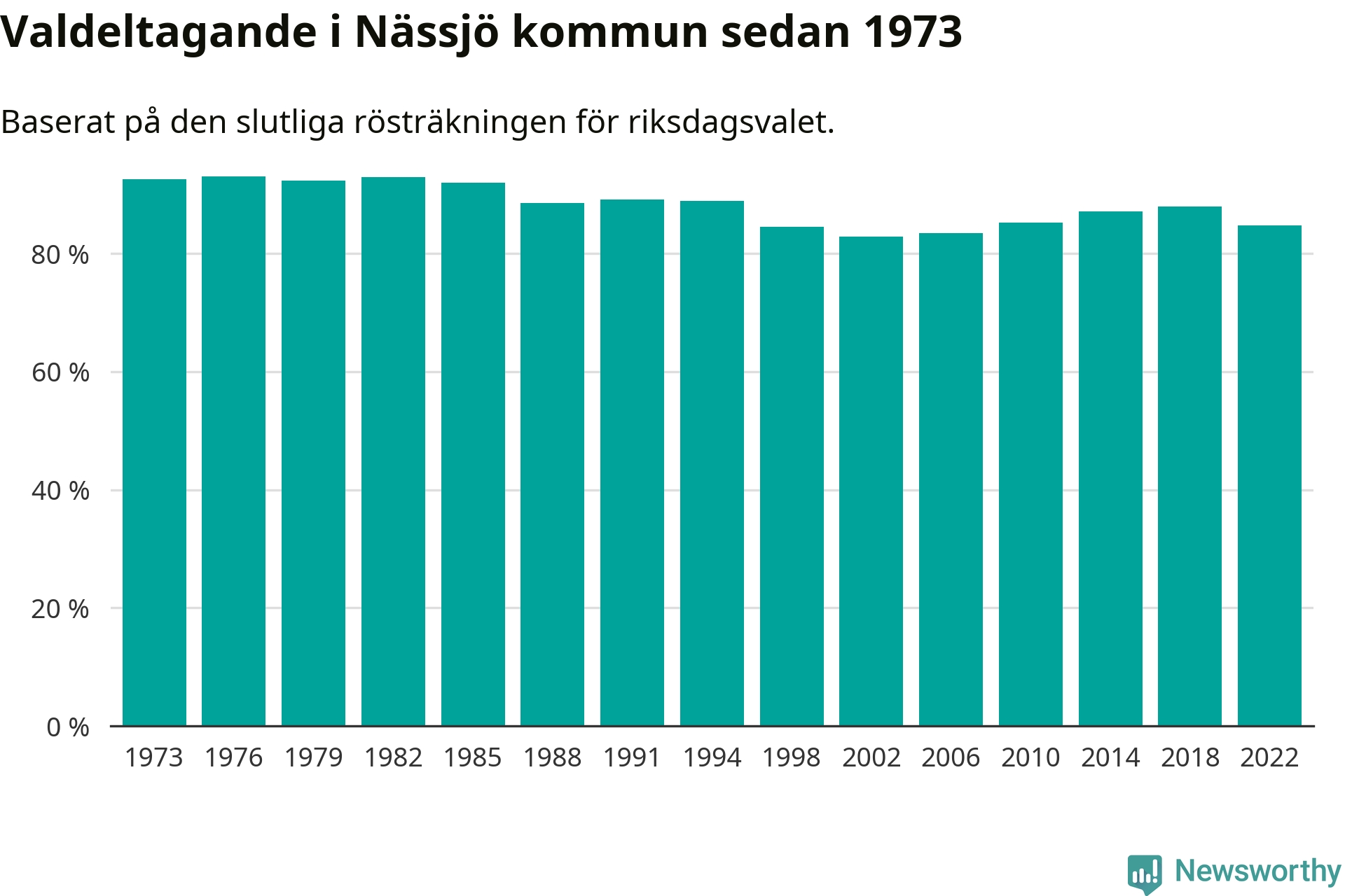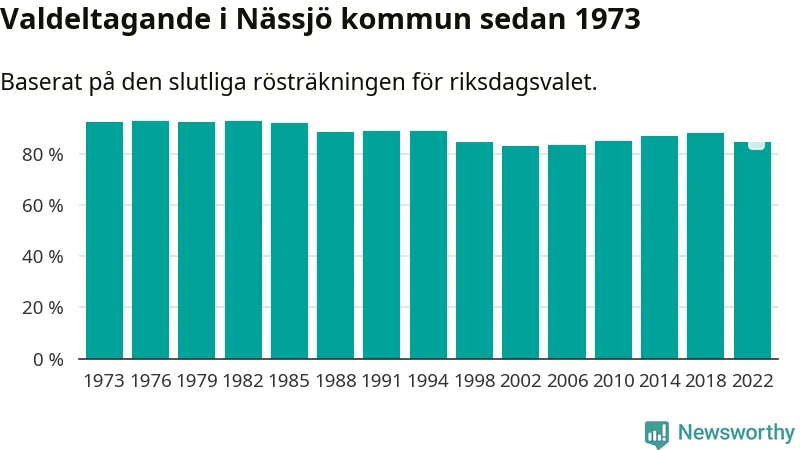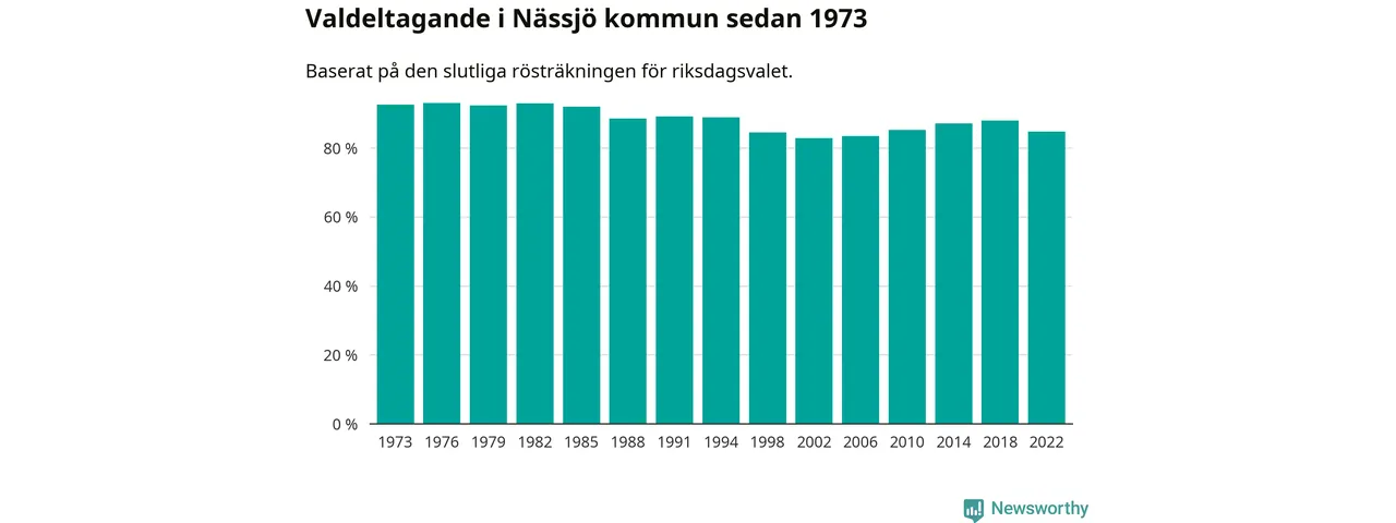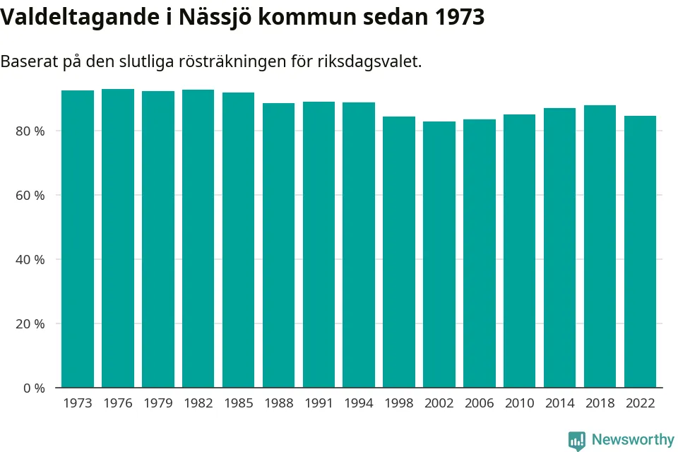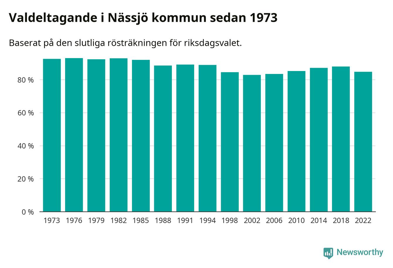 Nässjö tillhör Jönköpings läns valkrets. Där var valdeltagandet förra valet 85,3 procent. I hela riket landade valdeltagandet 2022 på 84,21 procent, att jämföra med 87,18 procent 2018.