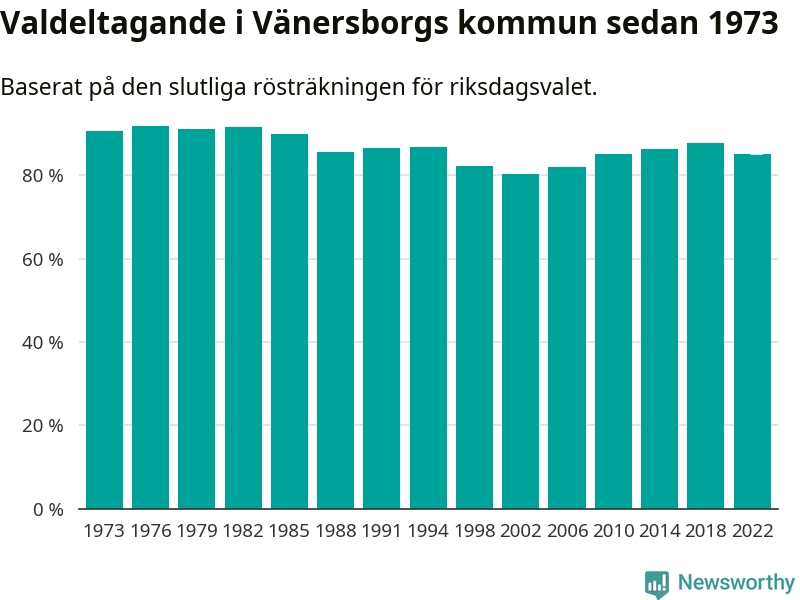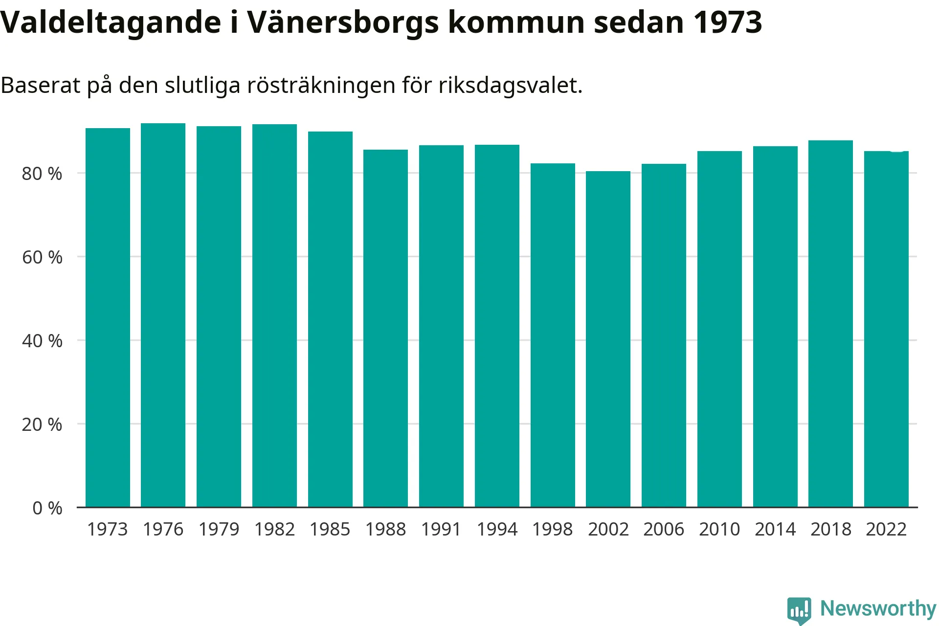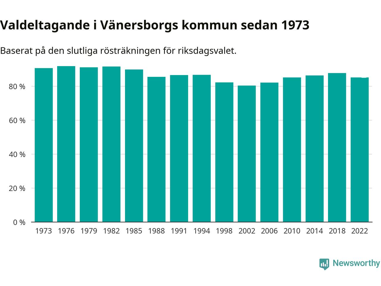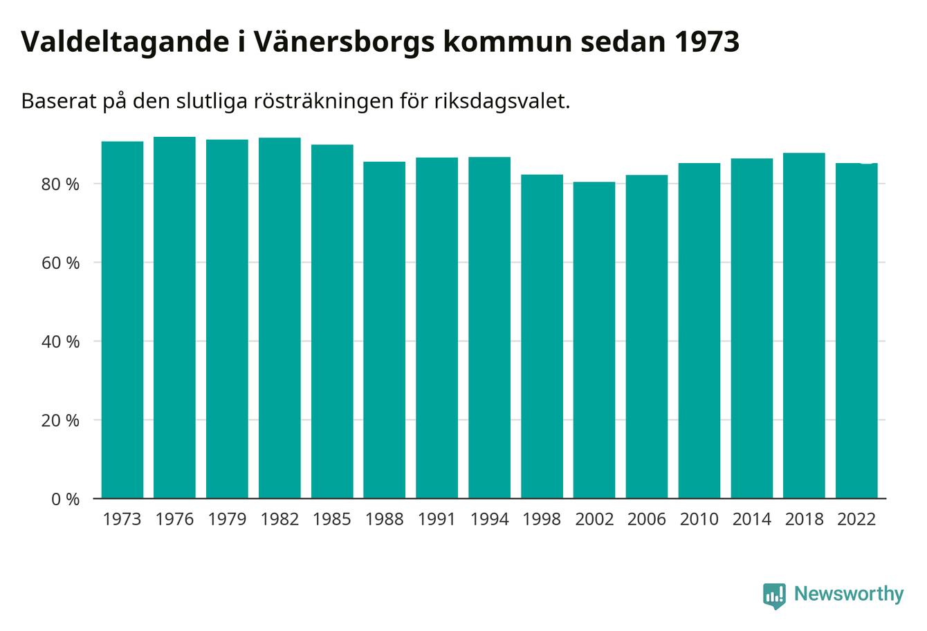 Vänersborg tillhör Västra Götalands läns norra valkrets. Där var valdeltagandet förra valet 84,4 procent. I hela riket landade valdeltagandet 2022 på 84,21 procent, att jämföra med 87,18 procent 2018.