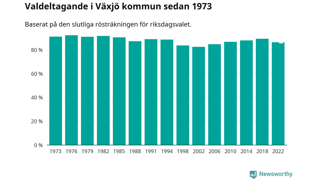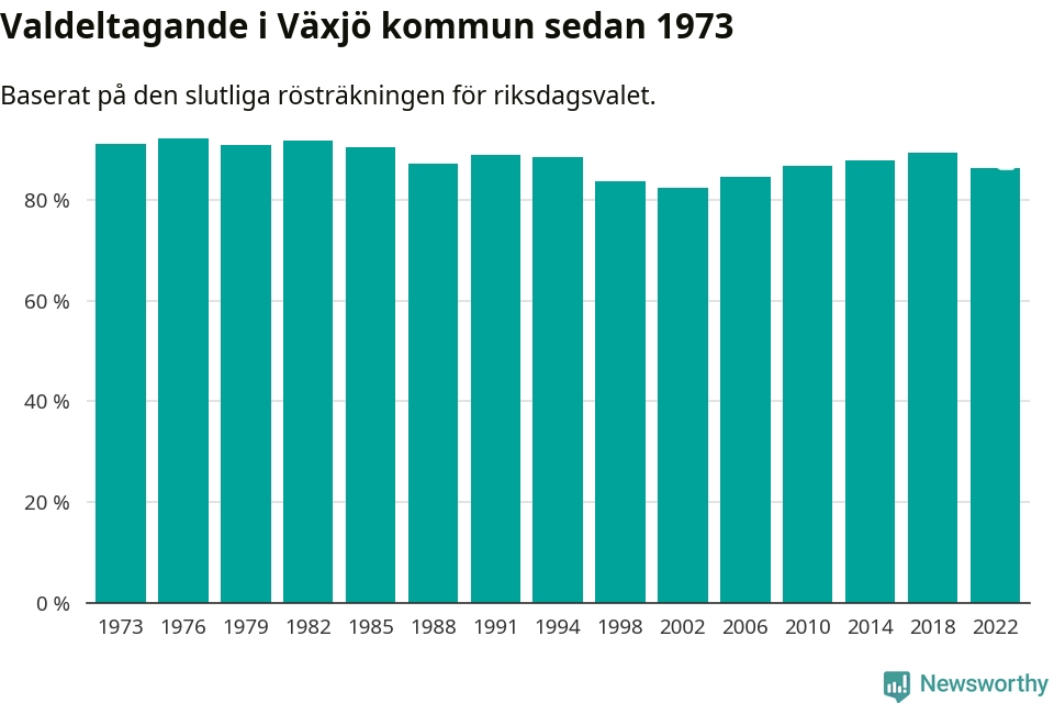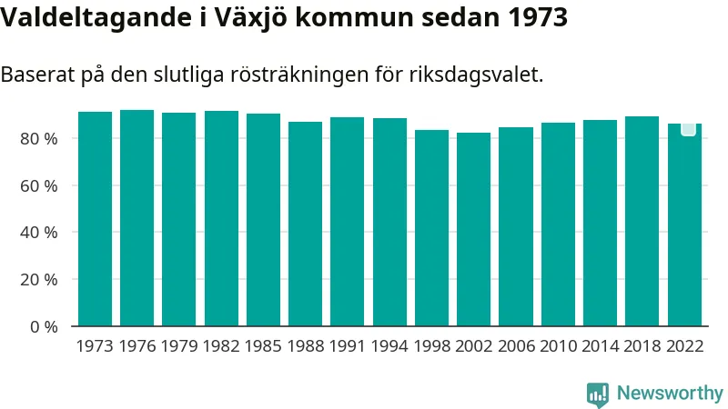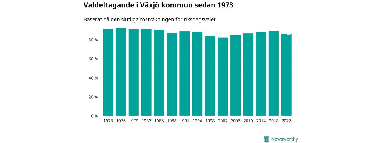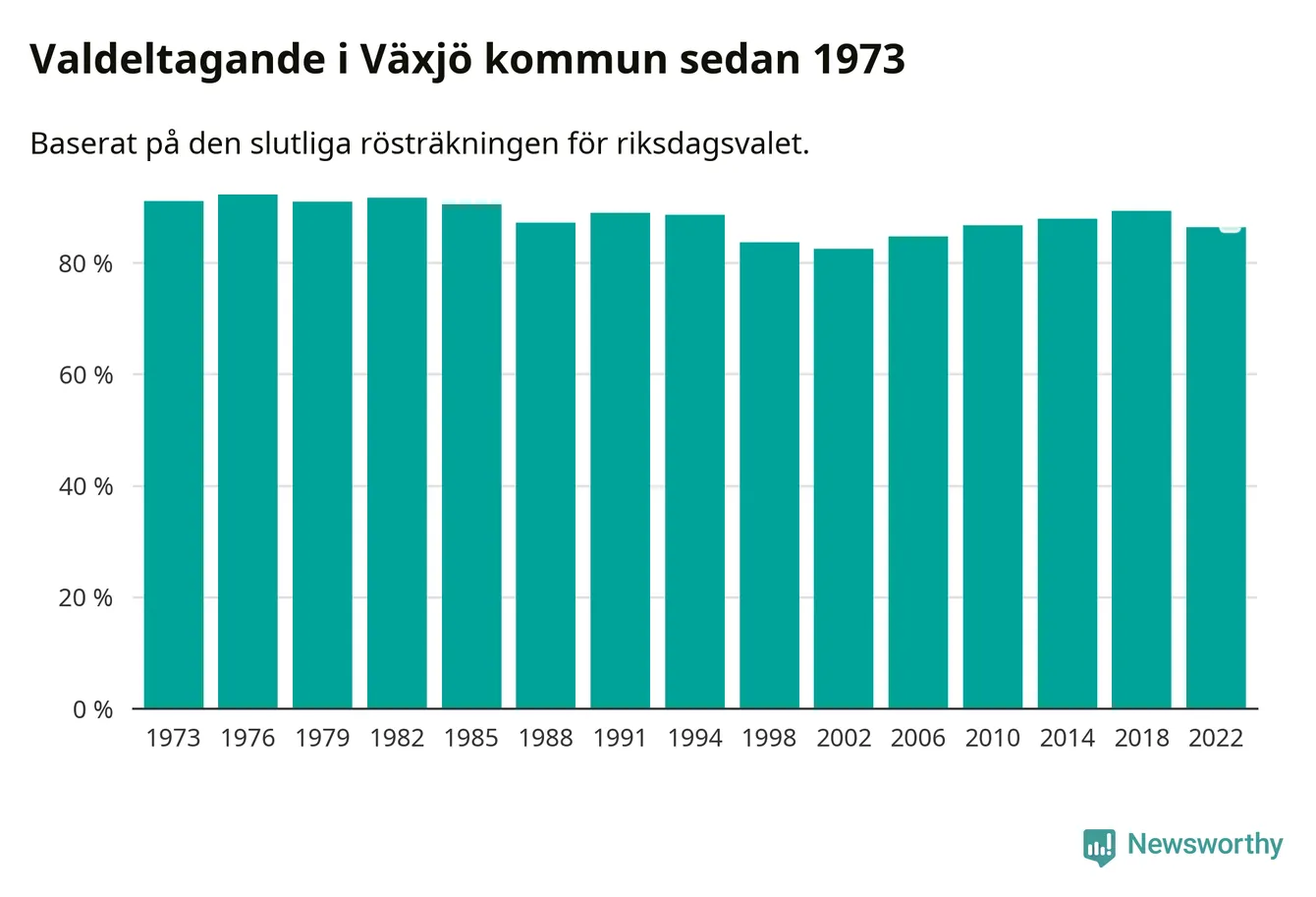 Växjö tillhör Kronobergs läns valkrets. Där var valdeltagandet förra valet 85,5 procent. I hela riket landade valdeltagandet 2022 på 84,21 procent, att jämföra med 87,18 procent 2018.