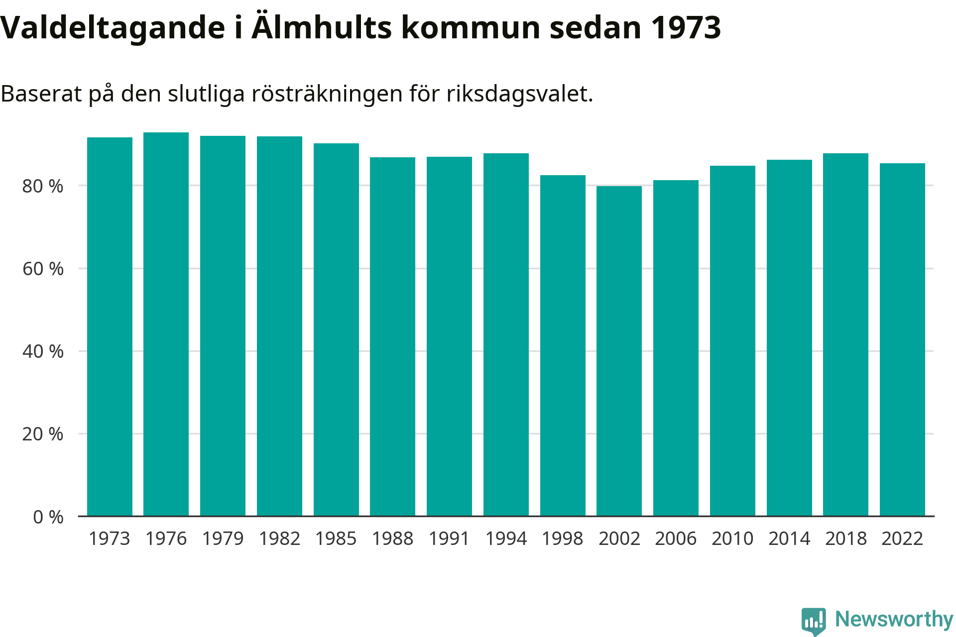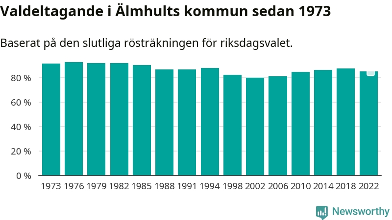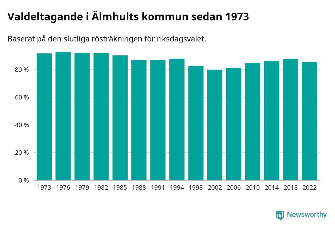 Älmhult tillhör Kronobergs läns valkrets. Där var valdeltagandet förra valet 85,5 procent. I hela riket landade valdeltagandet 2022 på 84,21 procent, att jämföra med 87,18 procent 2018.