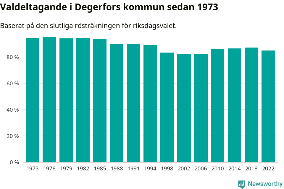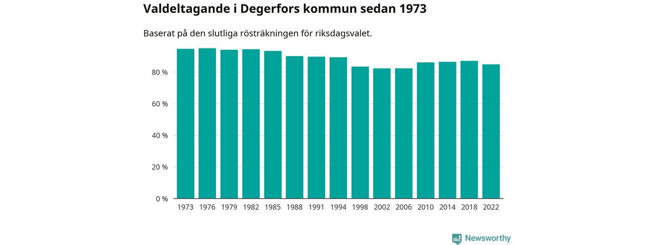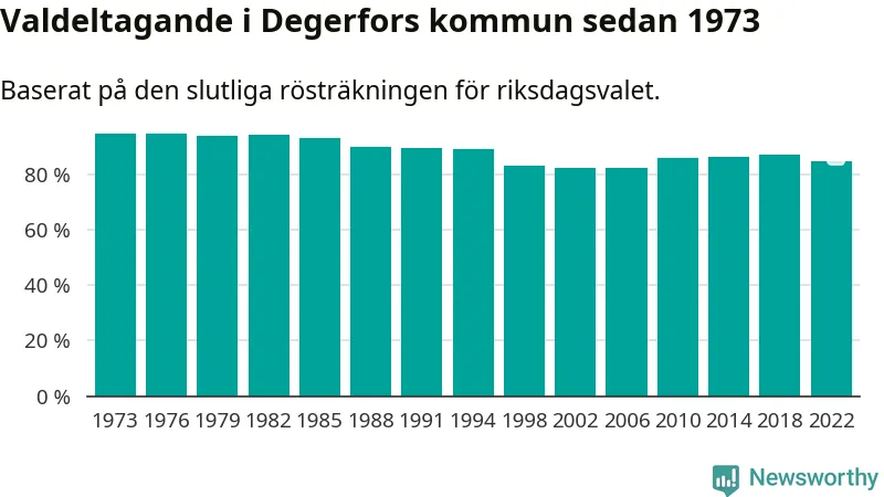 Degerfors tillhör Örebro läns valkrets. Där var valdeltagandet förra valet 84,7 procent. I hela riket landade valdeltagandet 2022 på 84,21 procent, att jämföra med 87,18 procent 2018.