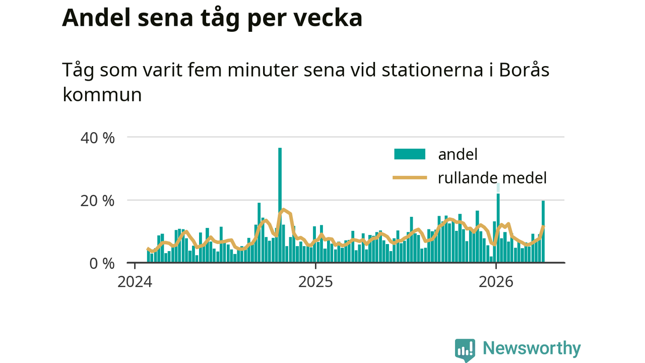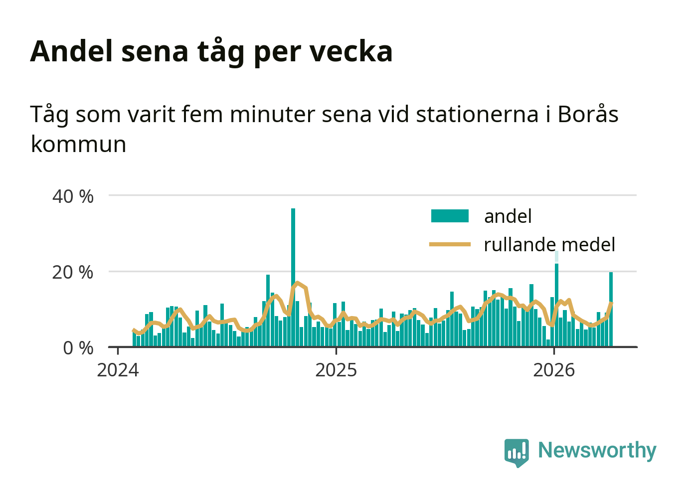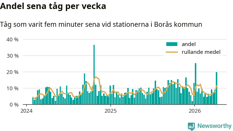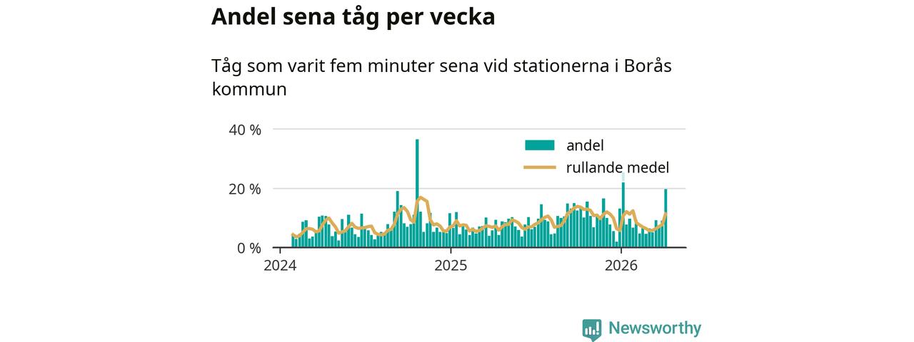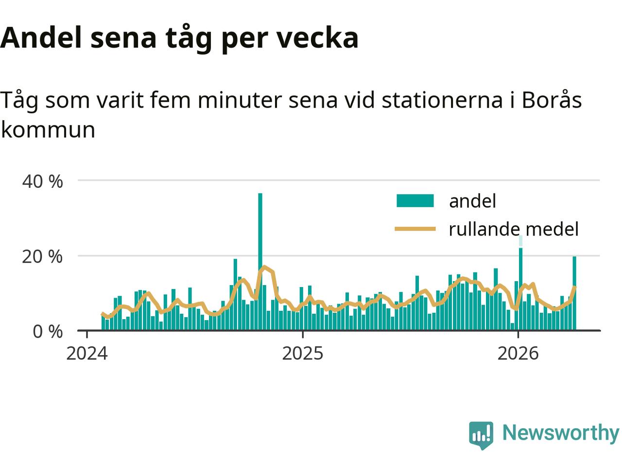 20 procent av tågen var sena när de passerade någon av de 6 stationerna i Borås under vecka 15. Det är fler än vanligt. En genomsnittlig vecka är motsvarande siffra åtta procent,