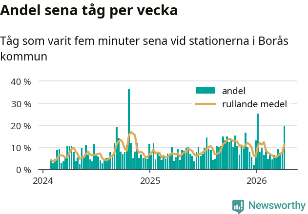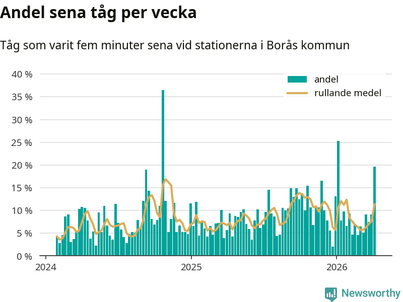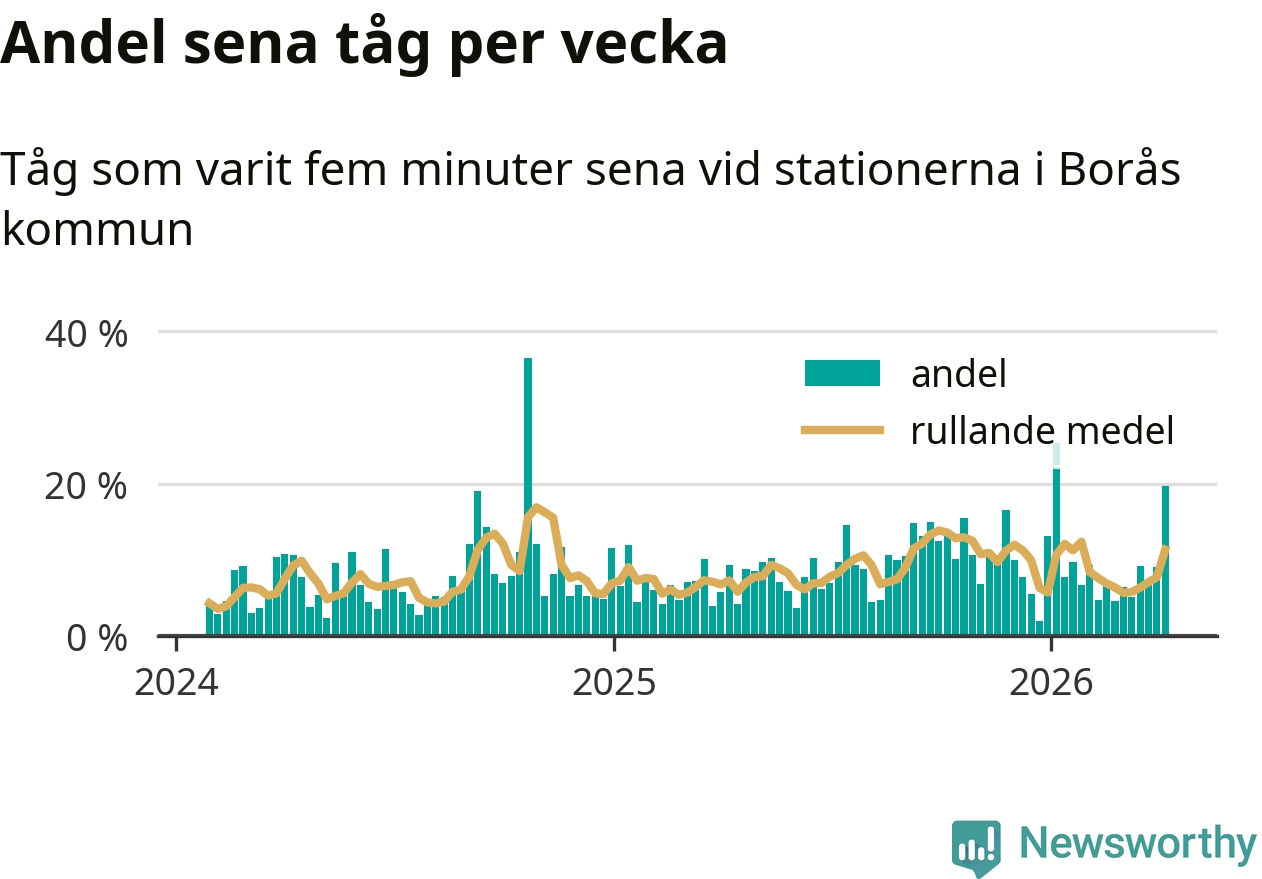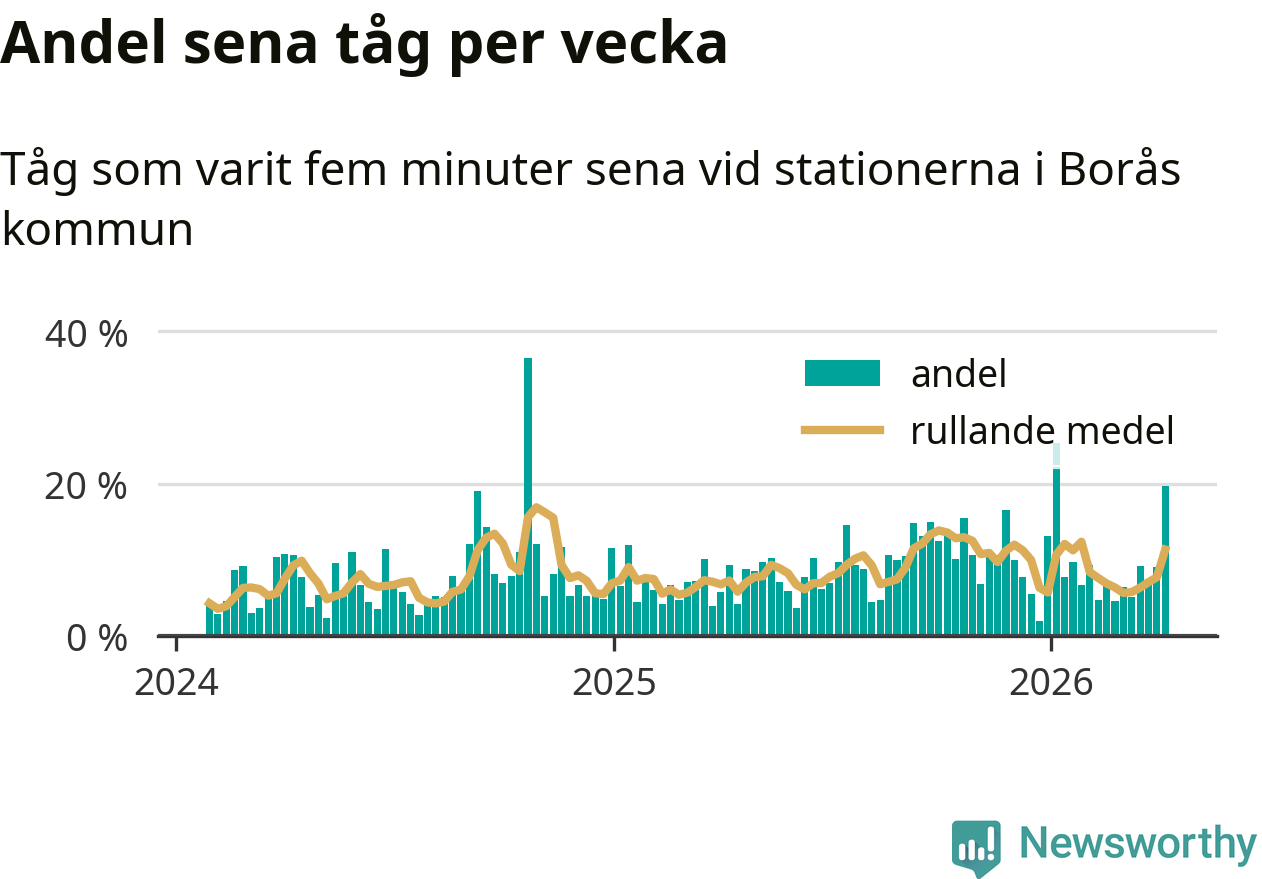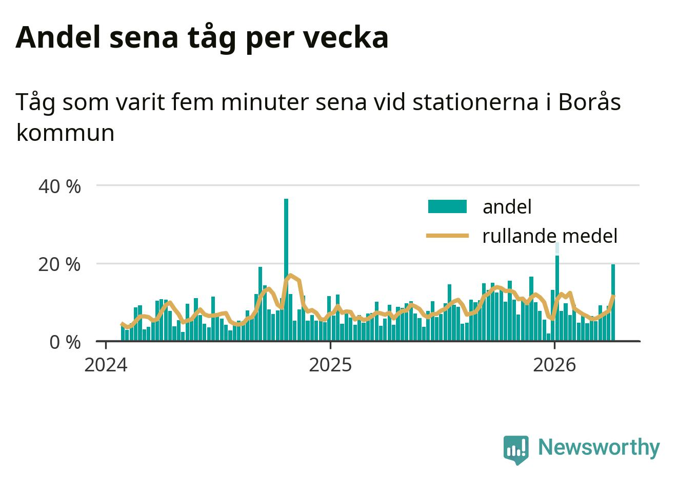 20 procent av tågen var sena när de passerade någon av de 6 stationerna i Borås under vecka 15. Det är fler än vanligt. En genomsnittlig vecka är motsvarande siffra åtta procent,