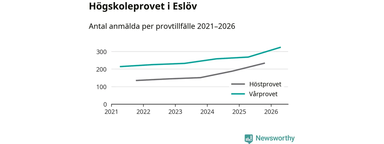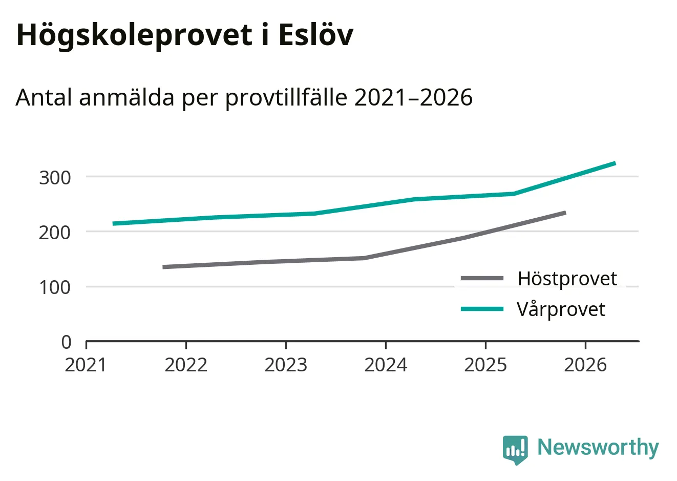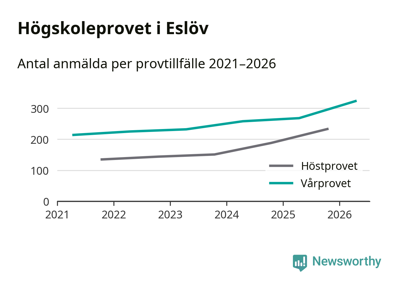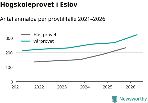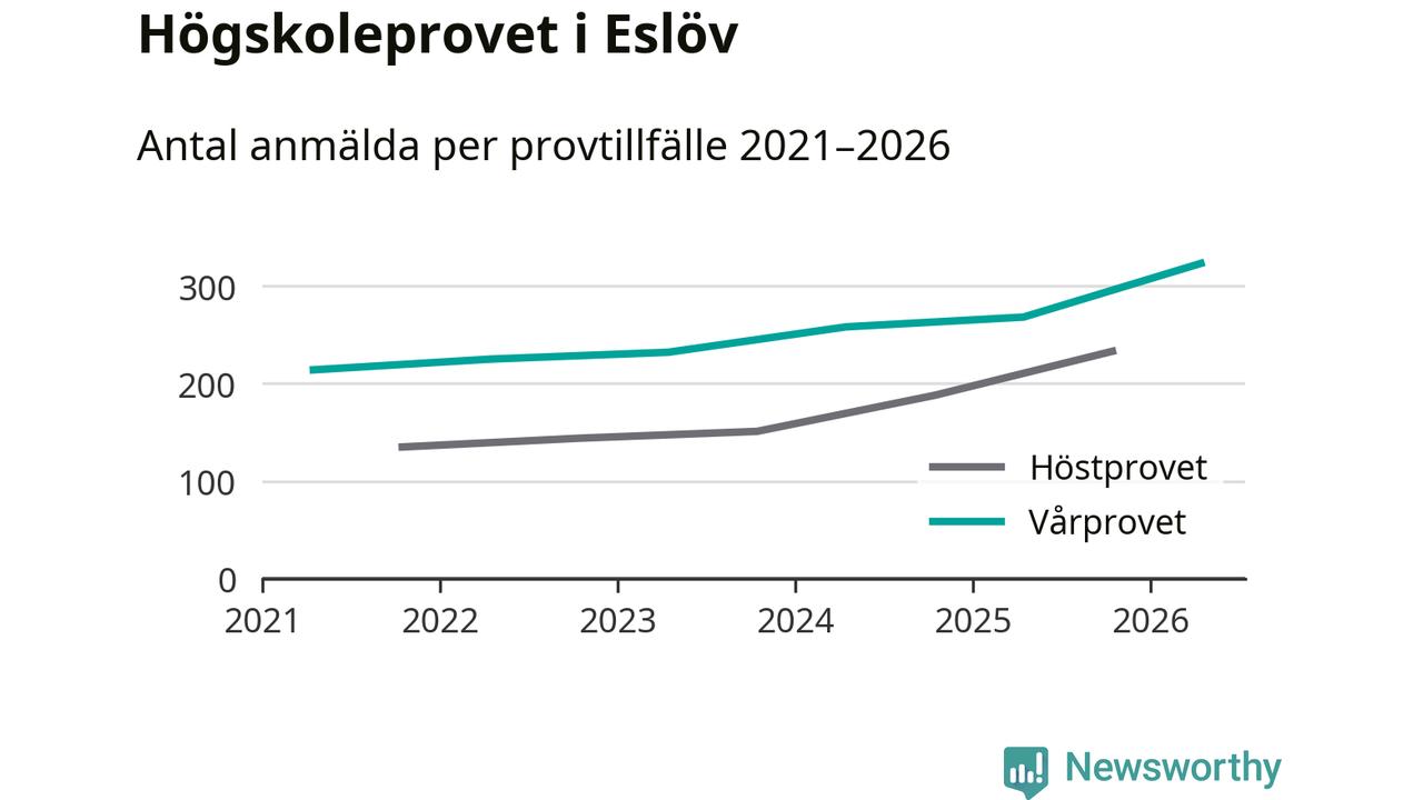 På lördag är det dags för högskoleprovet igen. Efter de begränsade provomgångarna under pandemin har antalet anmälda ökat varje år i Sverige, och i år är omkring 100 700 personer anmälda att delta någonstans i landet. För femte året i rad ökar antalet anmälda till vårens prov i Eslöv. På lördag är 323 personer anmälda, jämfört med 268 personer förra våren.