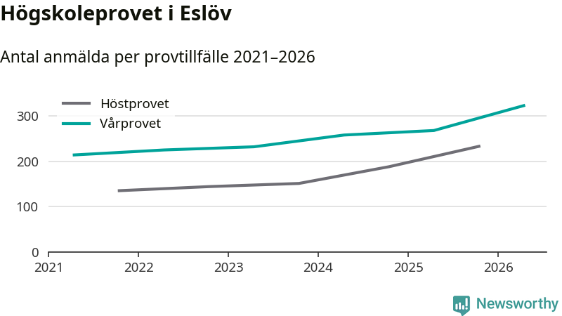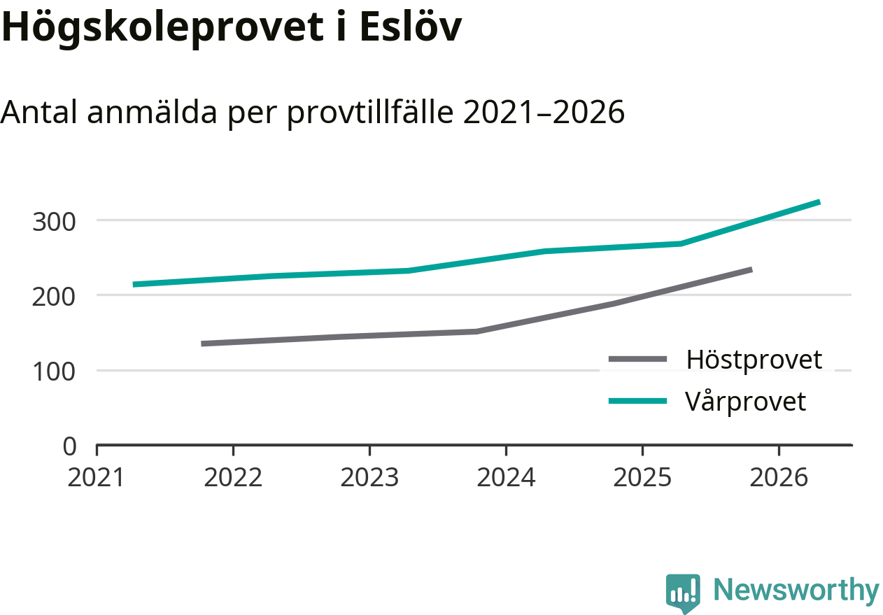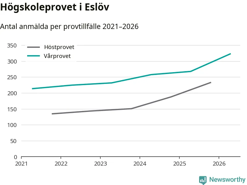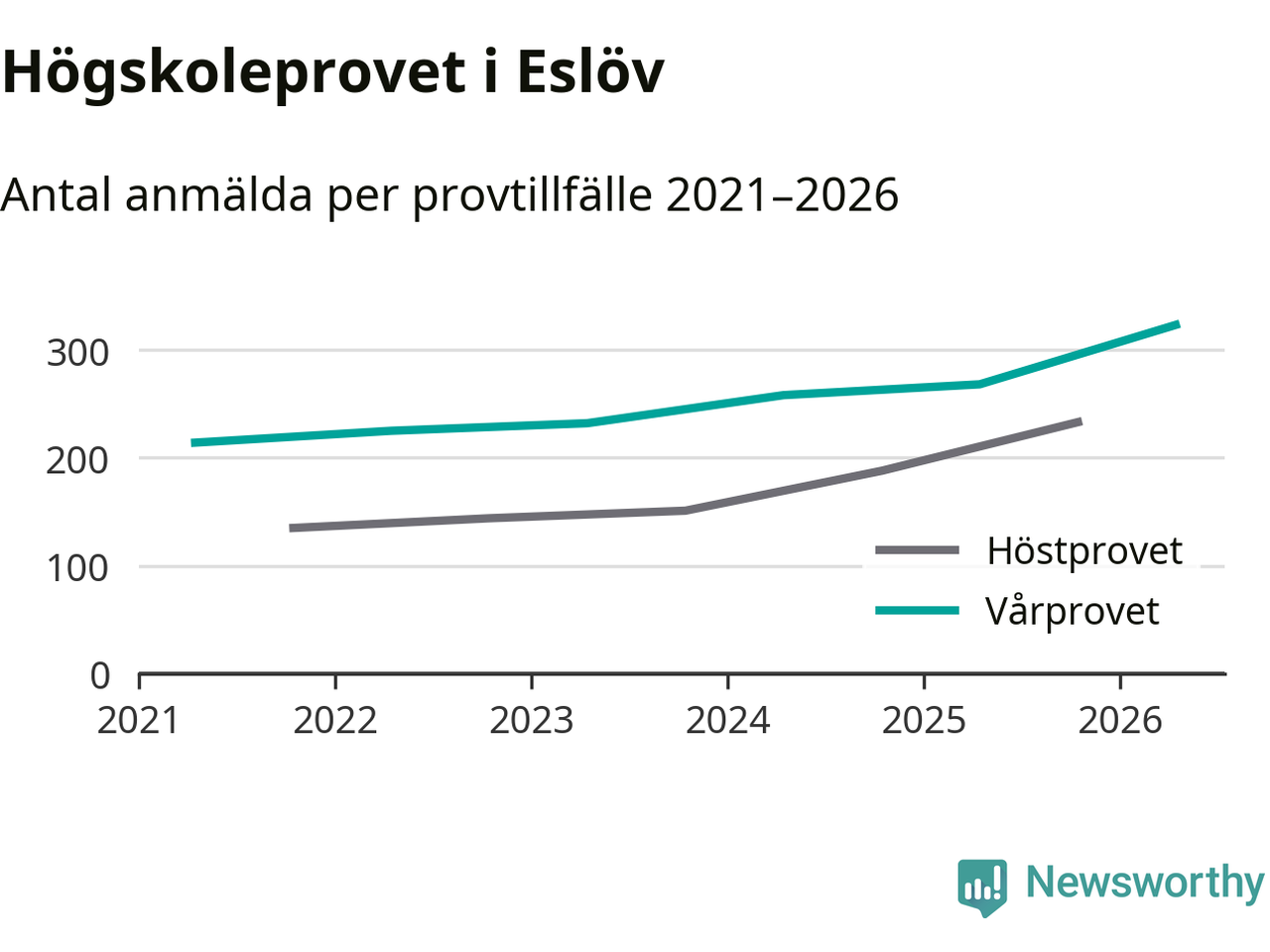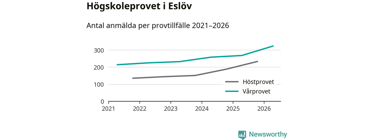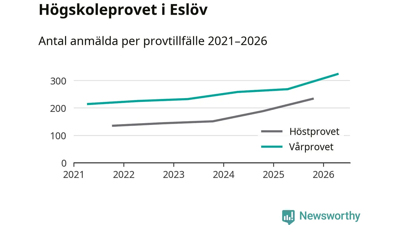 På lördag är det dags för högskoleprovet igen. Efter de begränsade provomgångarna under pandemin har antalet anmälda ökat varje år i Sverige, och i år är omkring 100 700 personer anmälda att delta någonstans i landet. För femte året i rad ökar antalet anmälda till vårens prov i Eslöv. På lördag är 323 personer anmälda, jämfört med 268 personer förra våren.