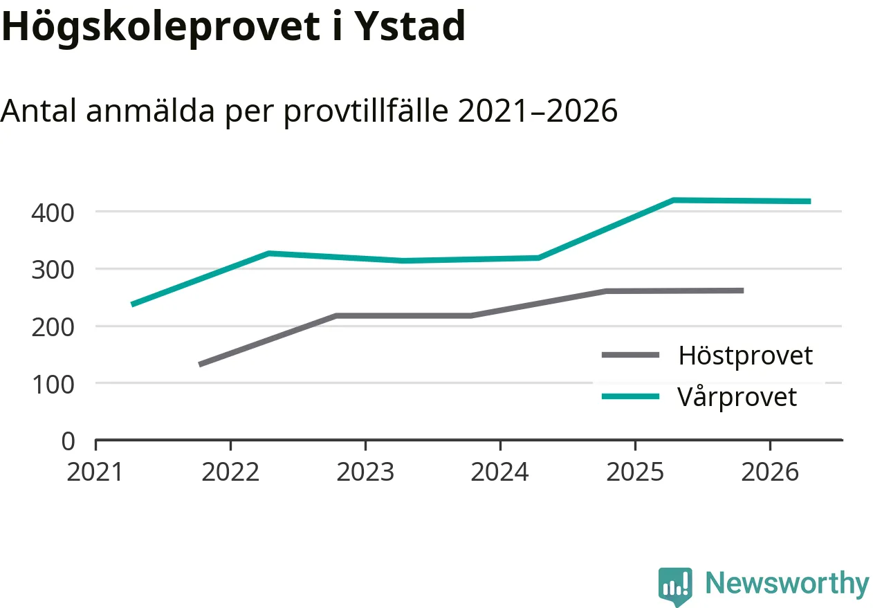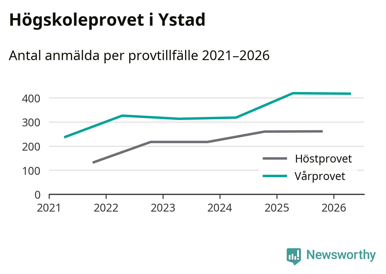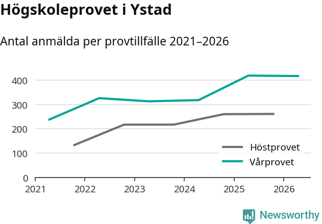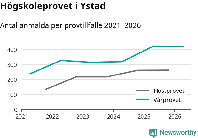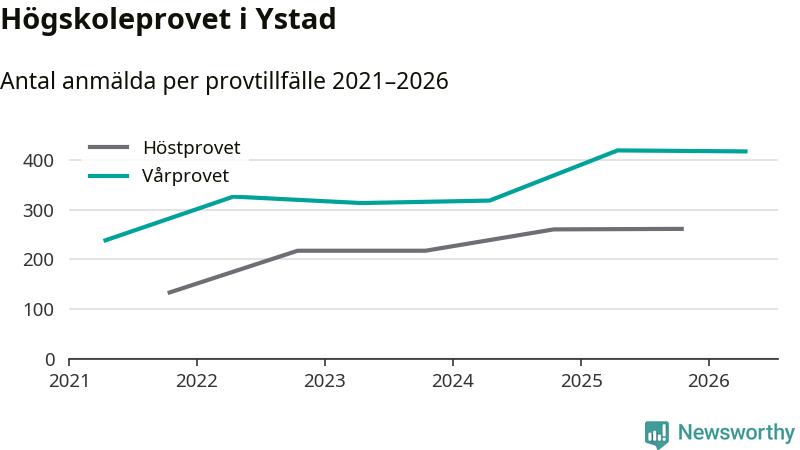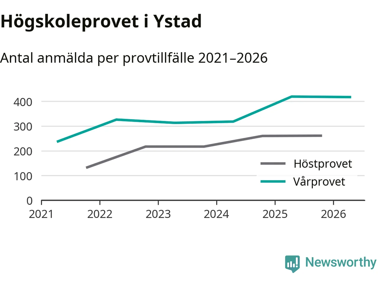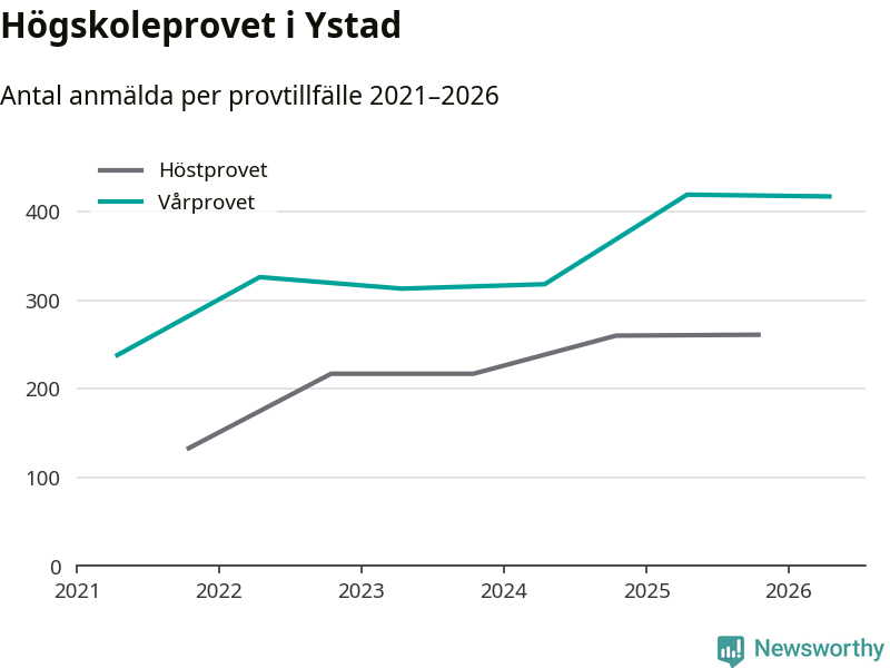 På lördag är det dags för högskoleprovet igen. Efter de begränsade provomgångarna under pandemin har antalet anmälda ökat varje år i Sverige, och i år är omkring 100 700 personer anmälda att delta någonstans i landet. På lördag är 417 personer anmälda att skriva högskoleprovet i Ystad. Förra våren var motsvarande siffra 419 personer.