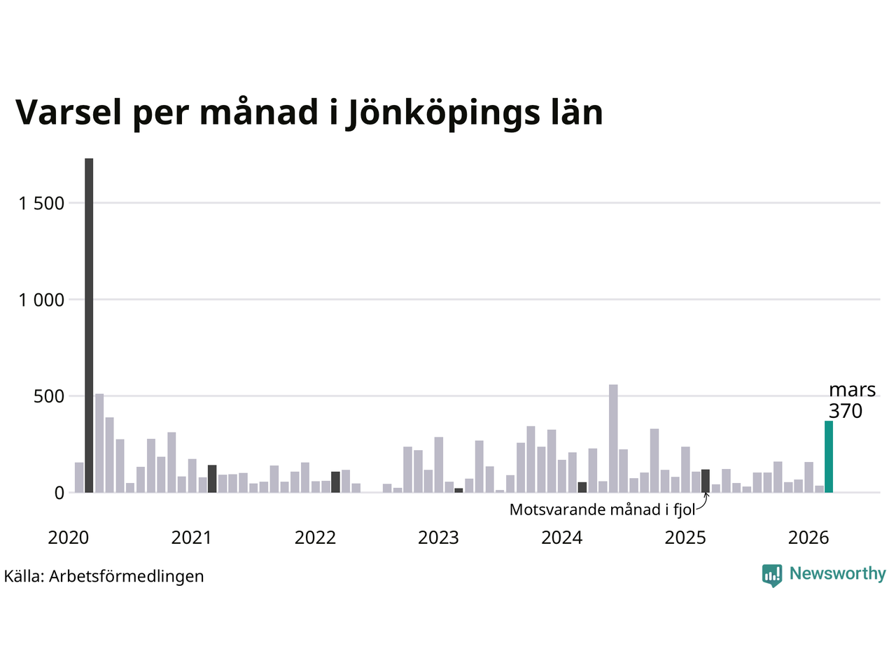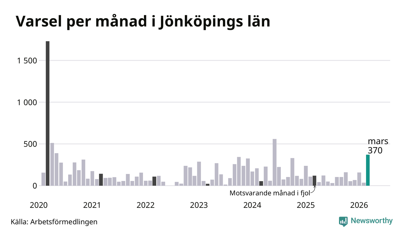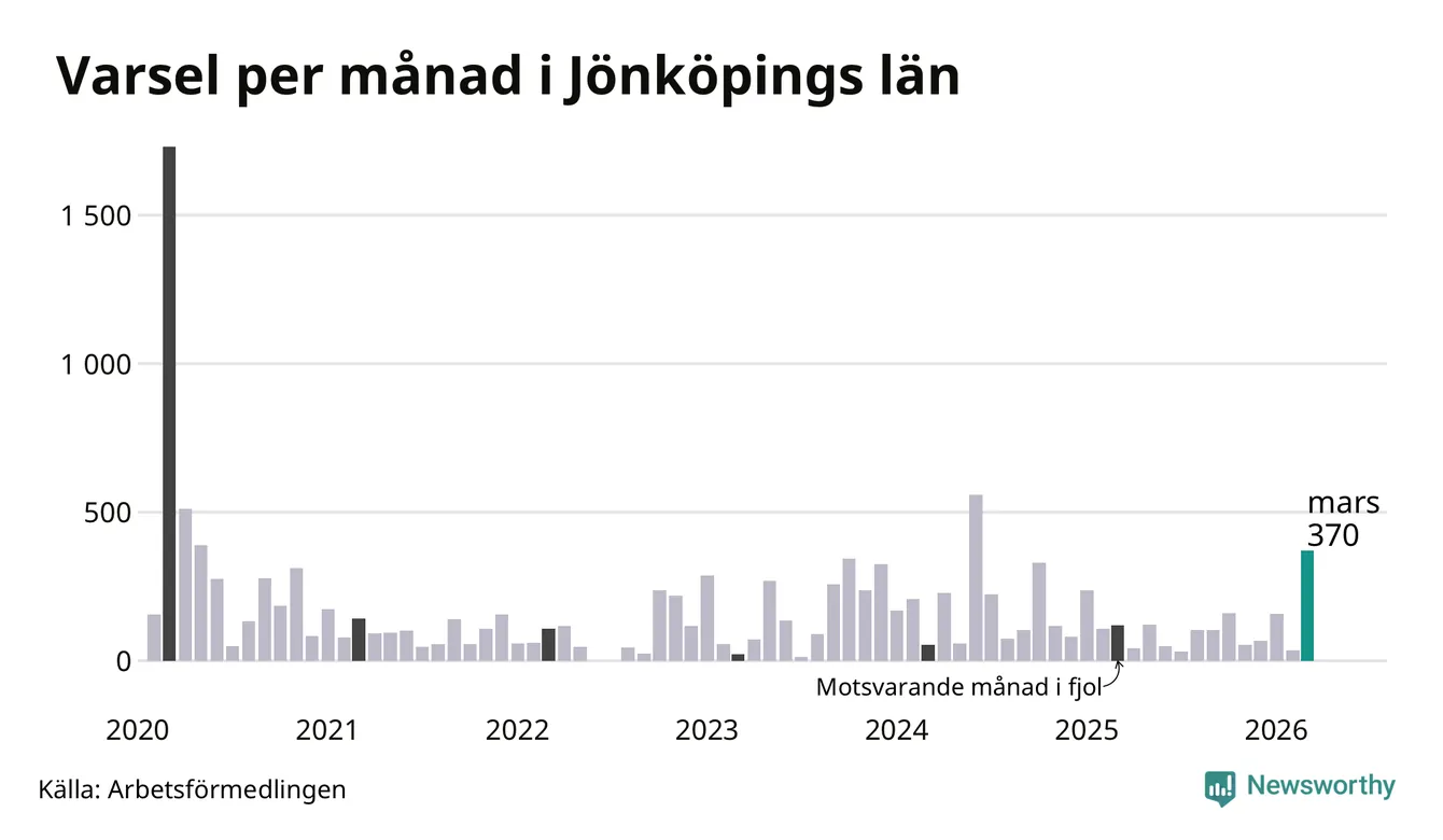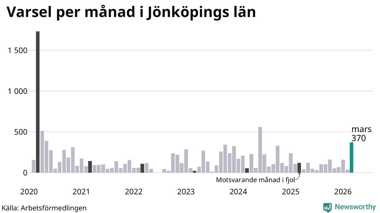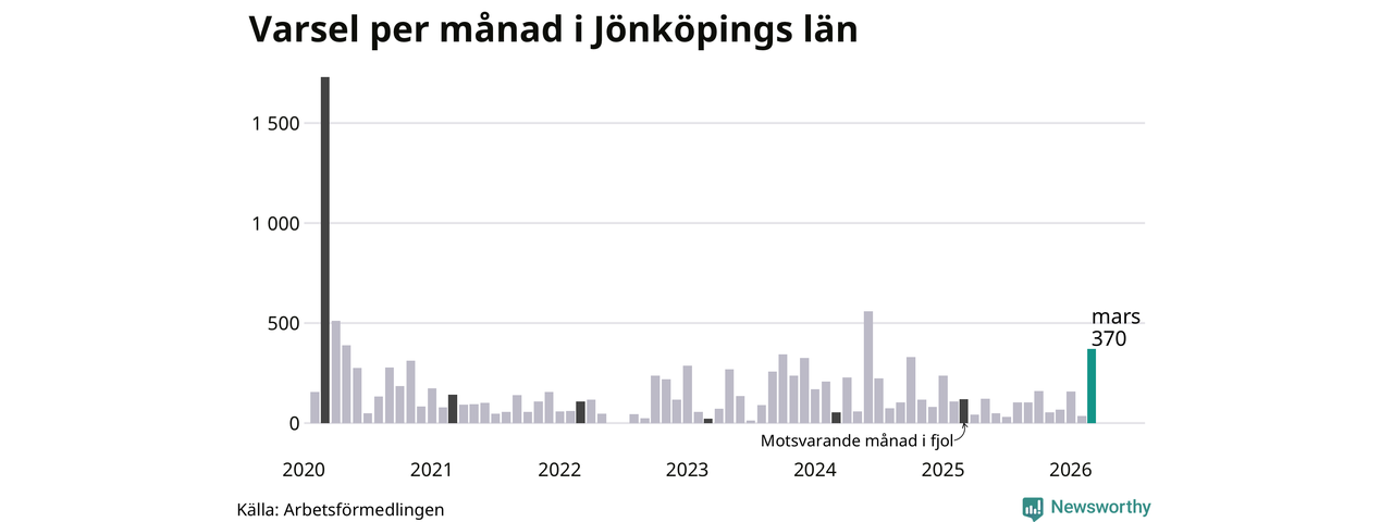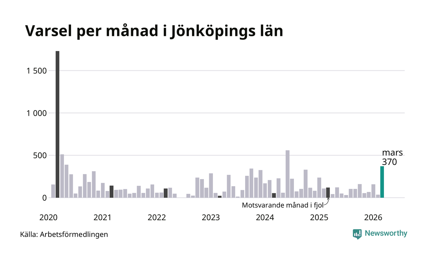 370 personer varslades om uppsägning i Jönköpings län under mars 2026. Det är 335 fler än i februari och den högsta siffran sedan juni 2024. Däremot är det fortfarande betydligt färre än i början av pandemin, i mars 2020, då 1 729 personer varslades i Jönköpings län. Sett över de tre senaste månaderna har totalt 562 varsel rapporterats i Jönköpings län, vilket är 97 fler än motsvarande period 2025.