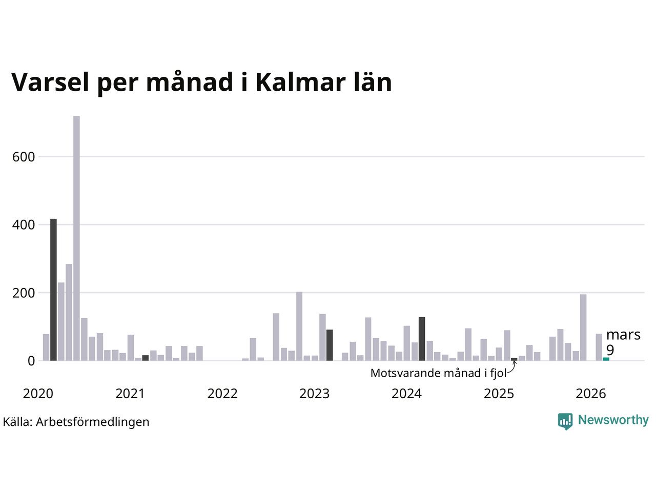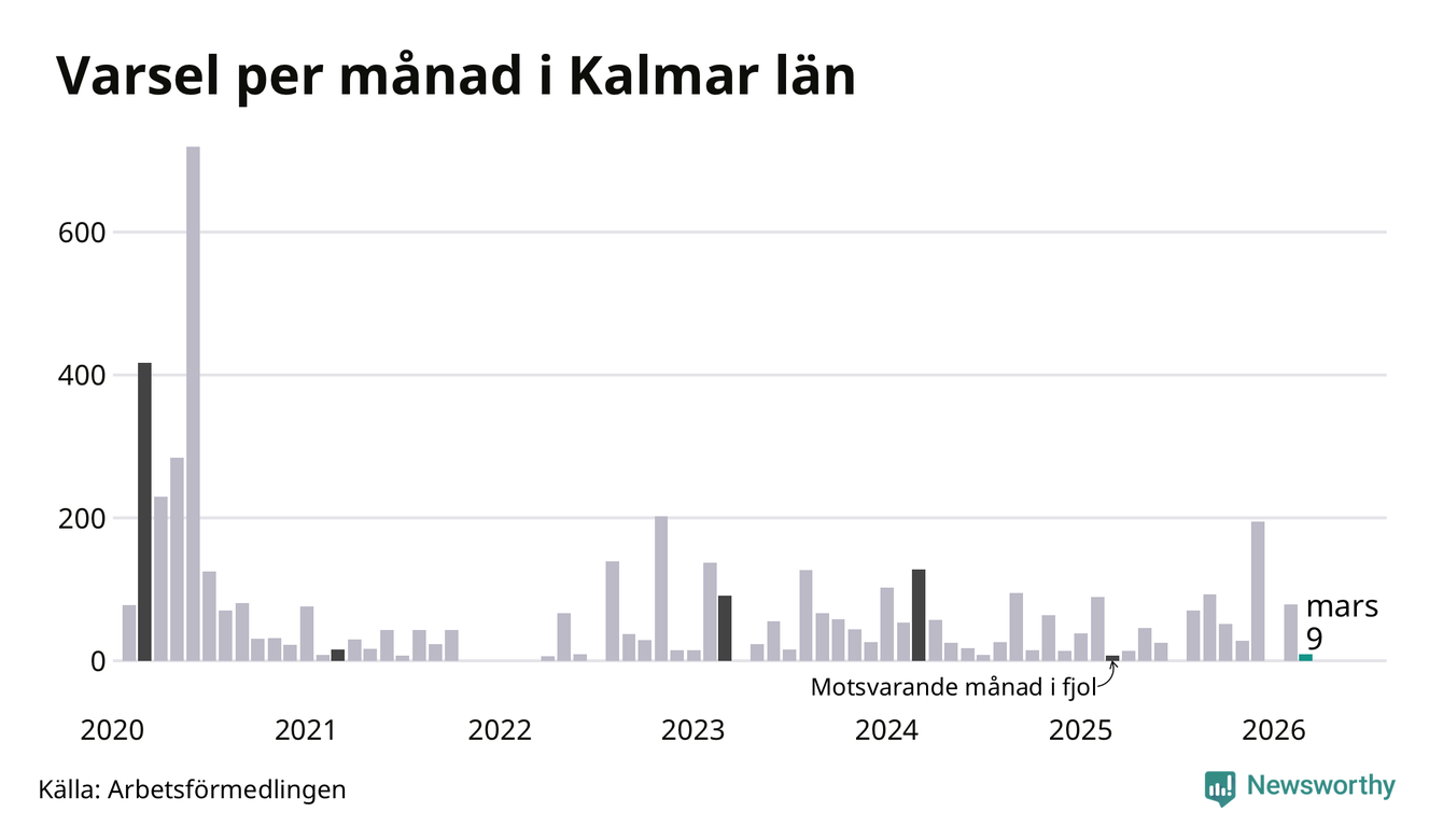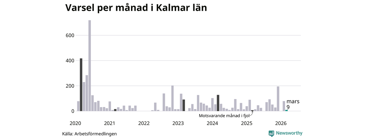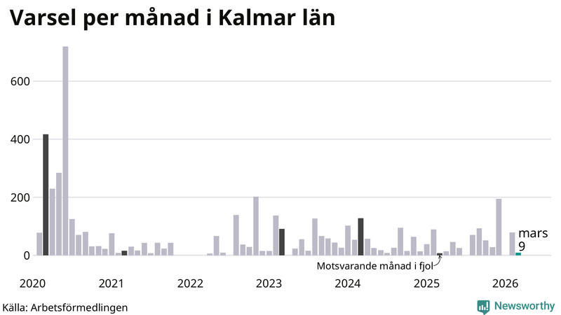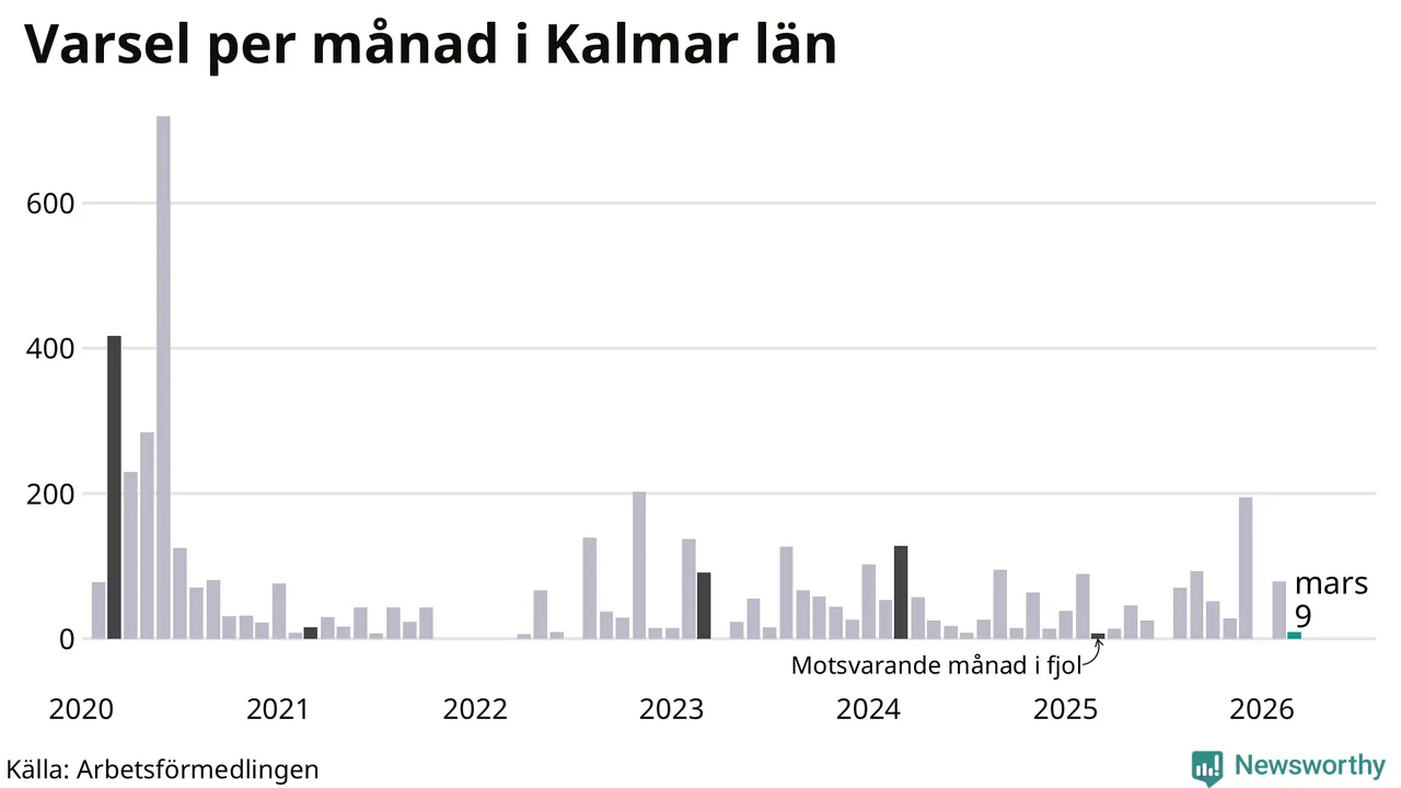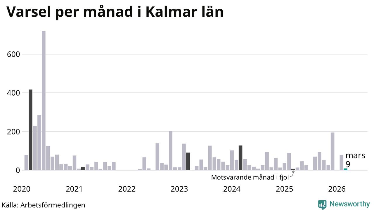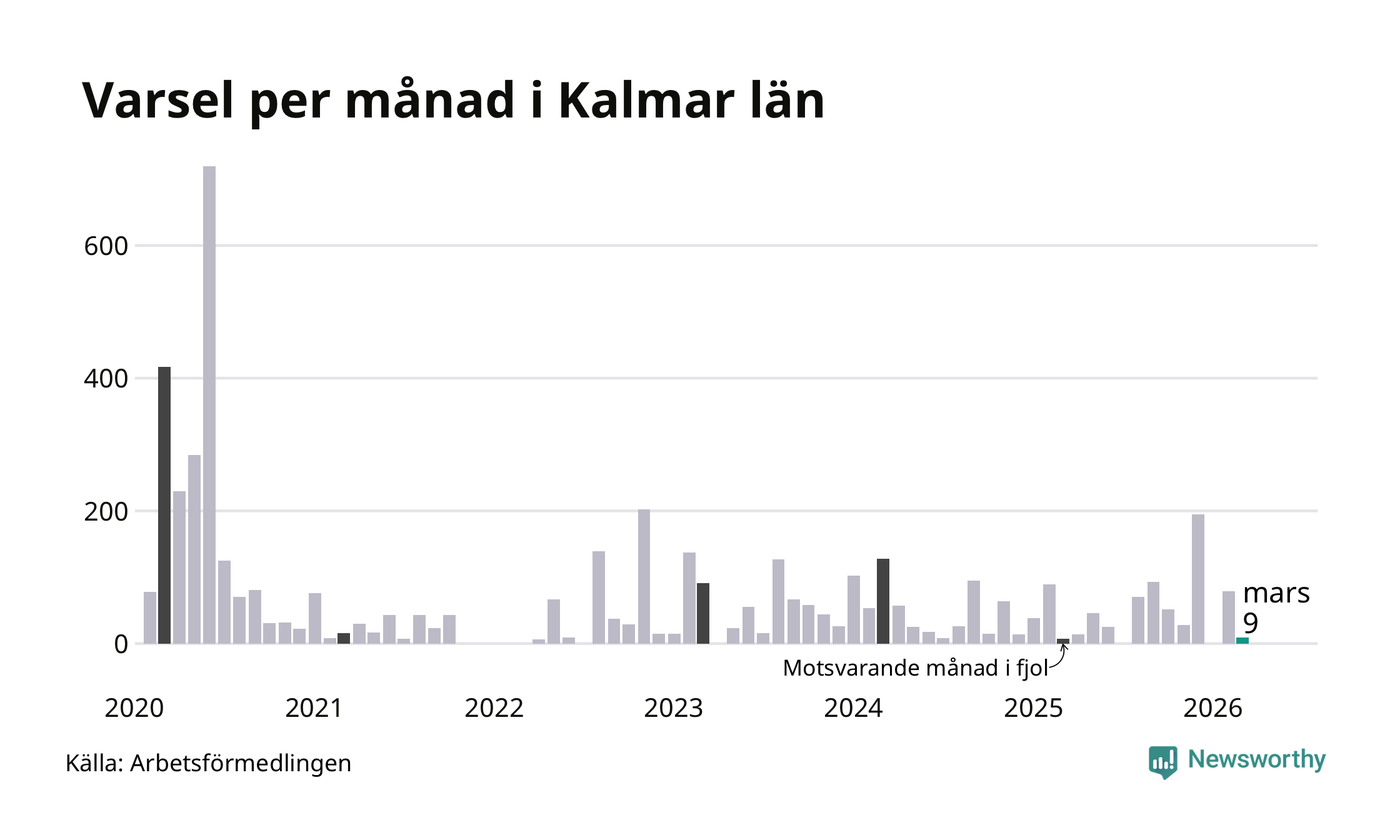 Nio personer varslades om uppsägning i Kalmar län under mars 2026. Det är 70 färre än i februari. För ett år sedan var antalet varsel sju i länet. Sett över de tre senaste månaderna har totalt 88 varsel rapporterats i Kalmar län, vilket är 46 färre än motsvarande period 2025. I början av pandemin, i juni 2020, varslades som mest 719 personer under en månad i Kalmar län.