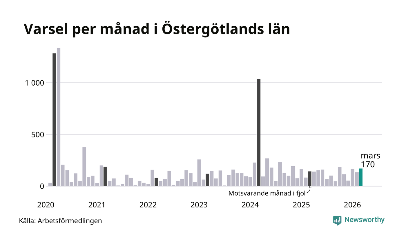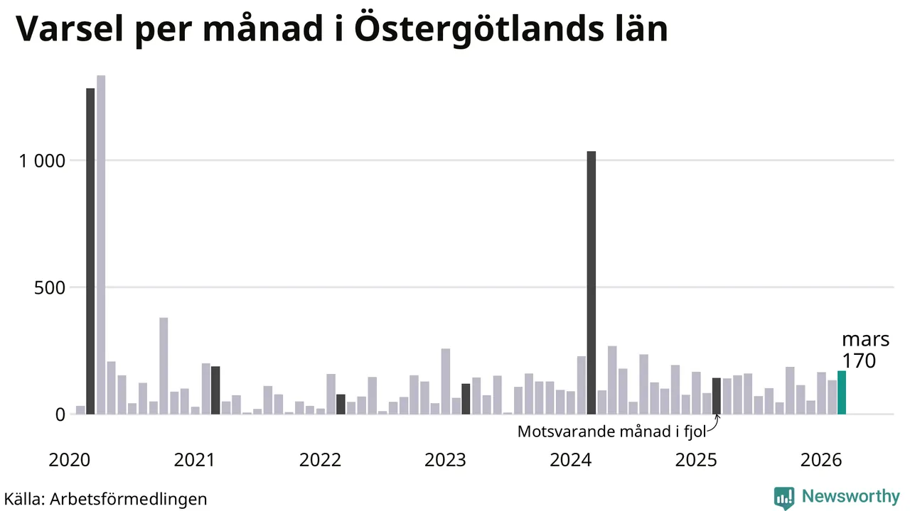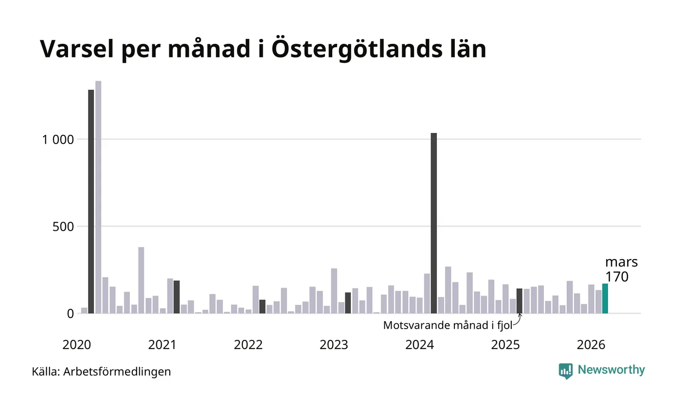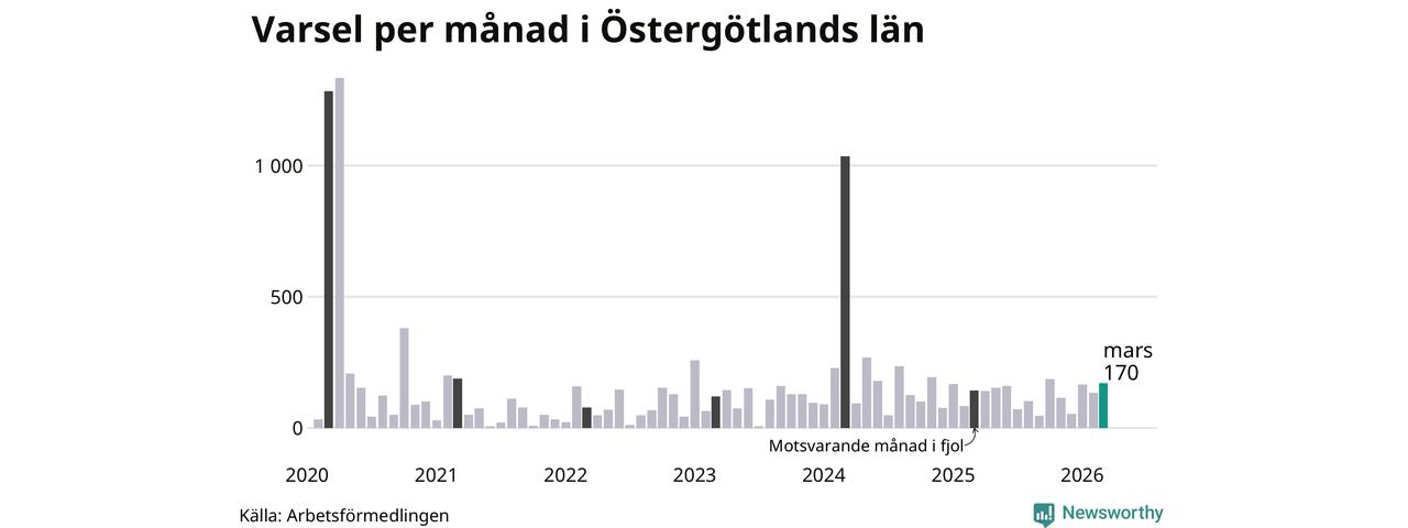 170 personer varslades om uppsägning i Östergötland under mars 2026. Det är 36 fler än i februari. För ett år sedan var antalet varsel 143 i länet. Sett över de tre senaste månaderna har totalt 469 varsel rapporterats i Östergötland, vilket är 75 fler än motsvarande period 2025. I början av pandemin, i april 2020, varslades som mest 1 333 personer under en månad i Östergötland.