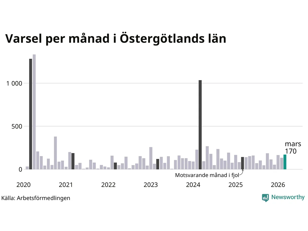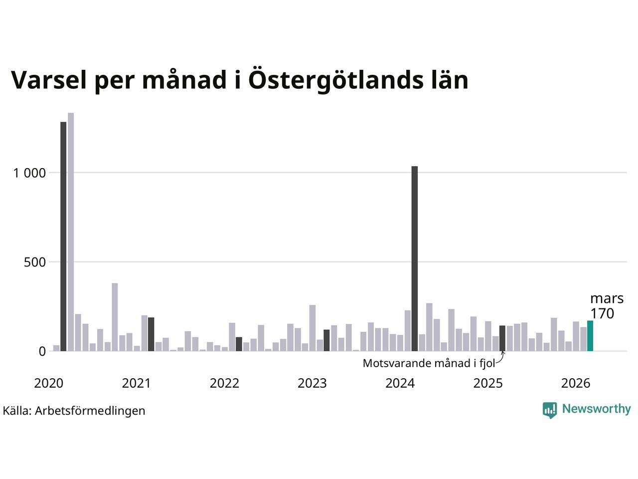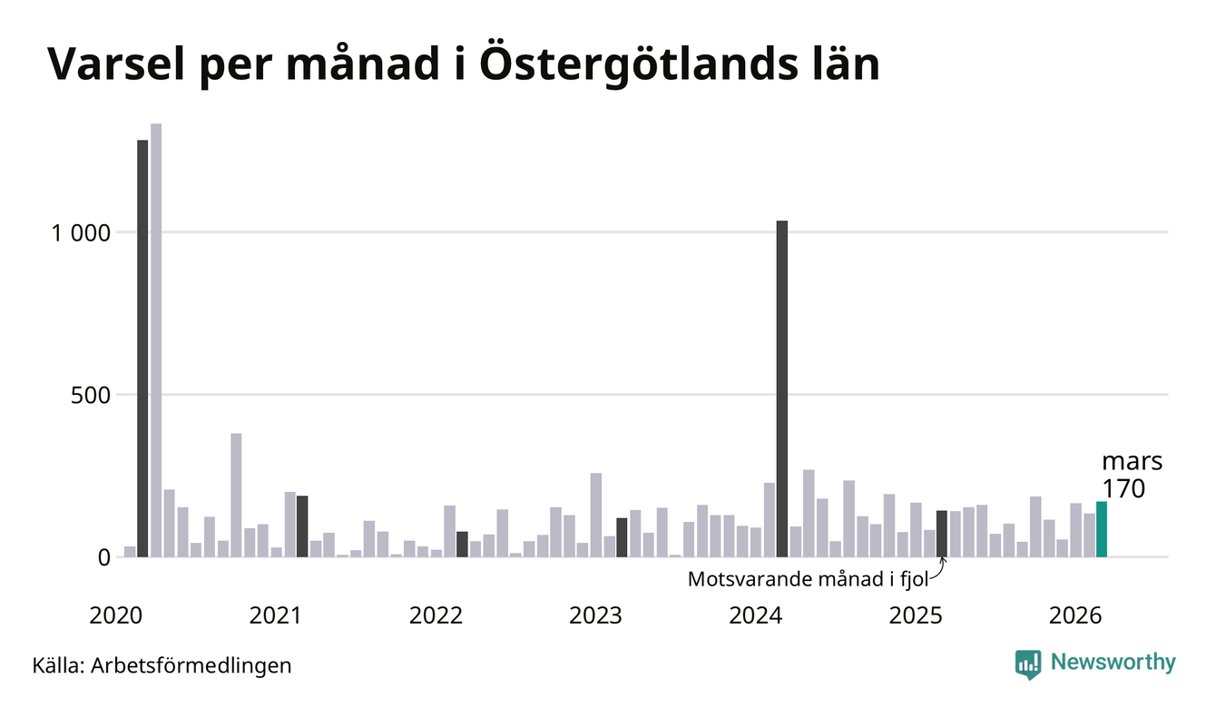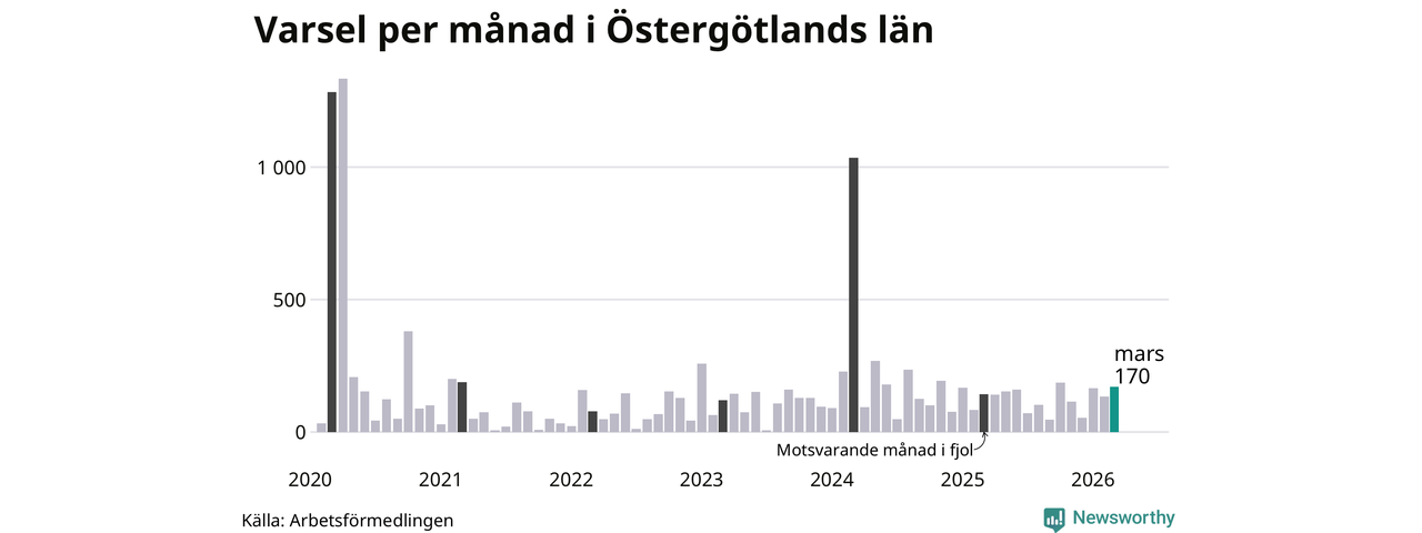 170 personer varslades om uppsägning i Östergötland under mars 2026. Det är 36 fler än i februari. För ett år sedan var antalet varsel 143 i länet. Sett över de tre senaste månaderna har totalt 469 varsel rapporterats i Östergötland, vilket är 75 fler än motsvarande period 2025. I början av pandemin, i april 2020, varslades som mest 1 333 personer under en månad i Östergötland.