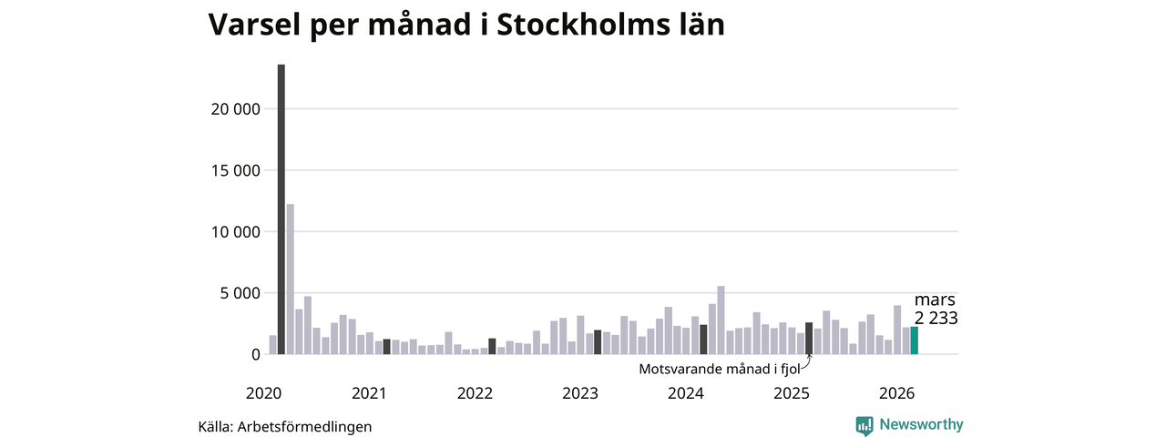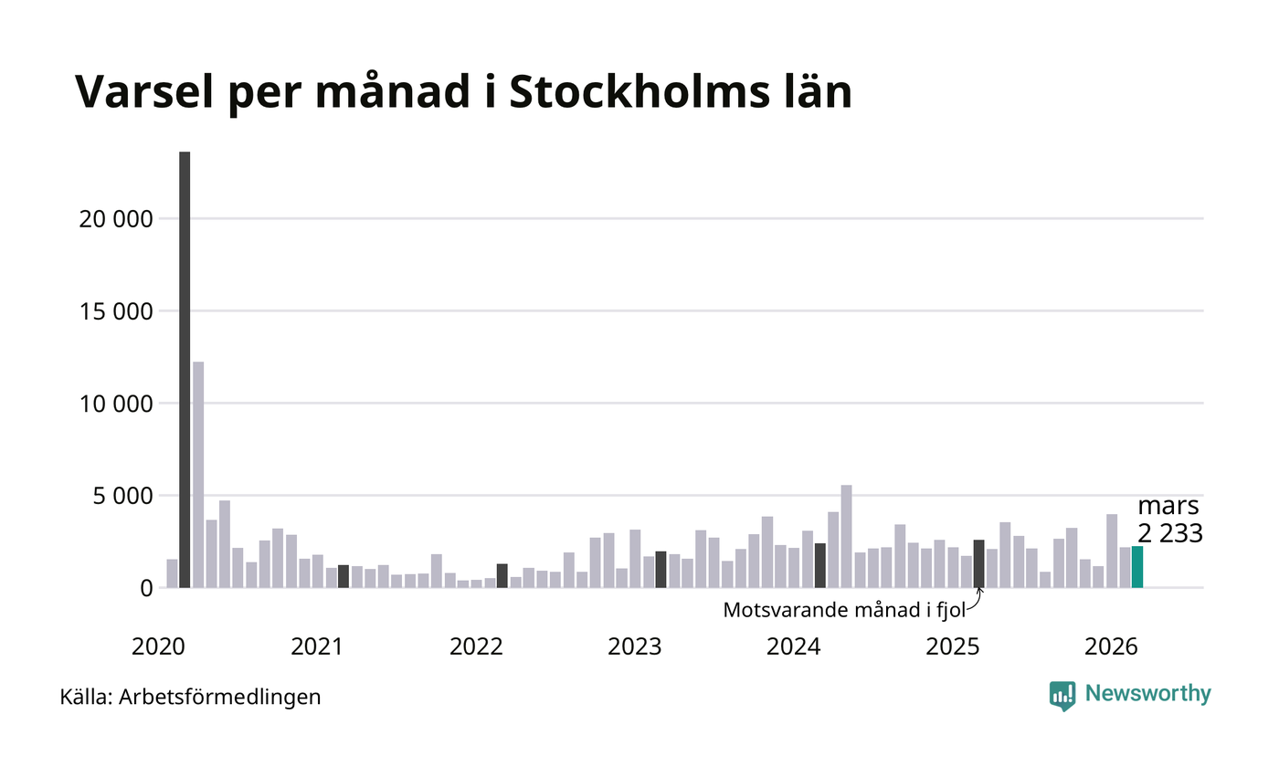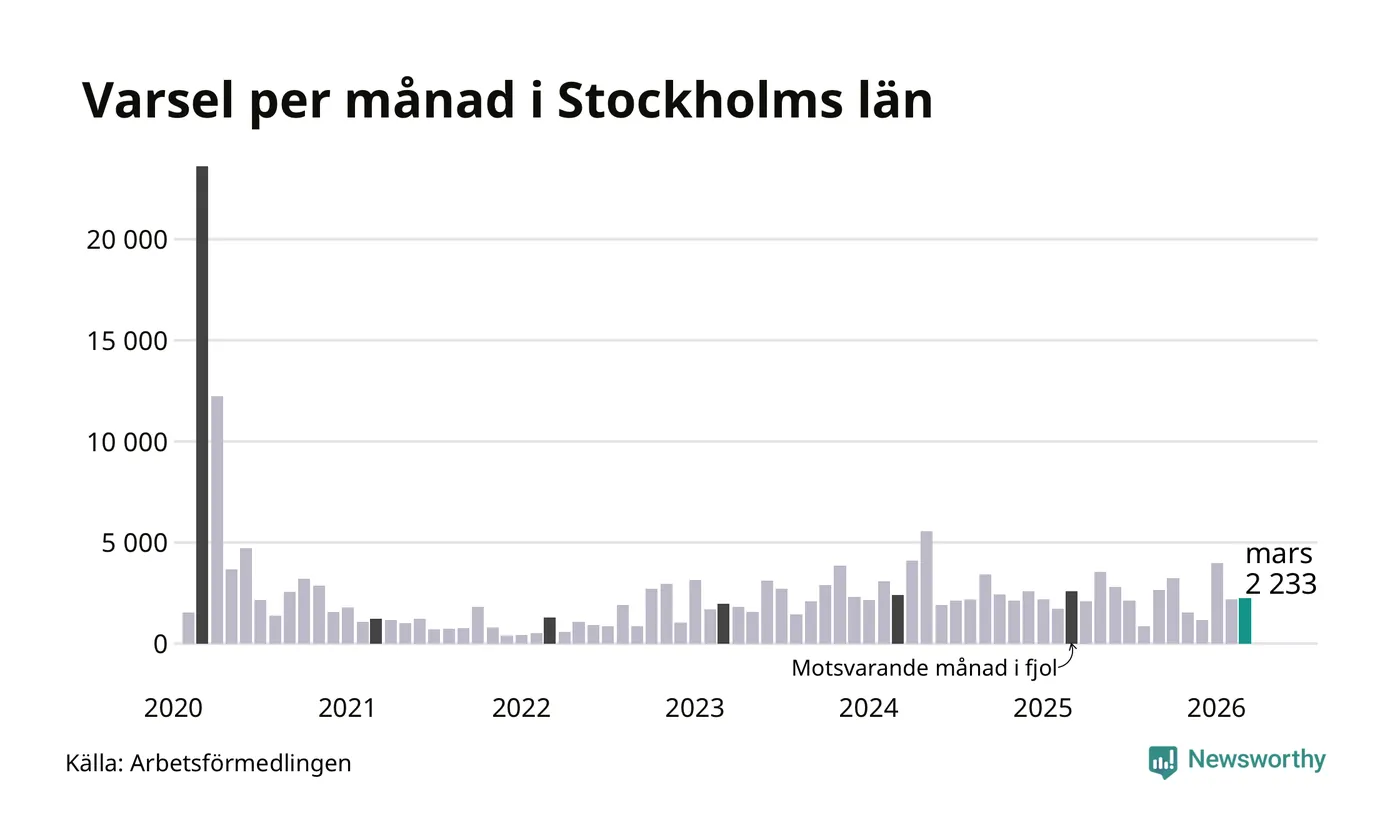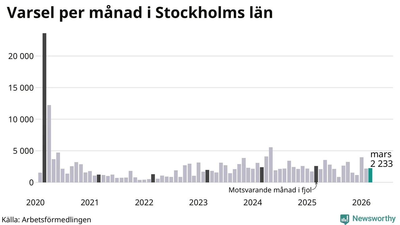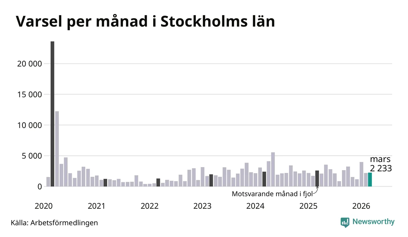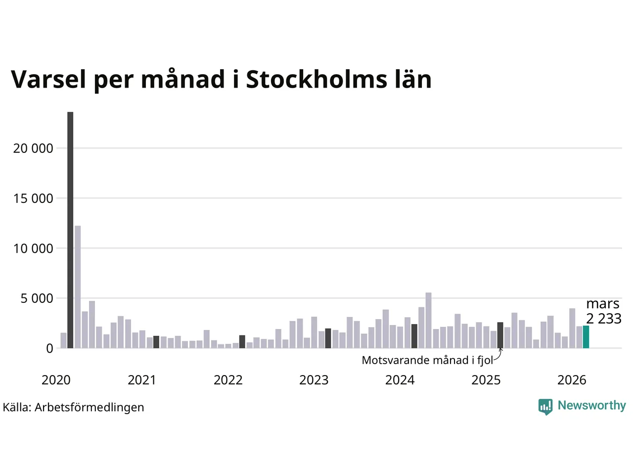 2 233 personer varslades om uppsägning i Stockholms län under mars 2026. Det är 45 fler än i februari. För ett år sedan var antalet varsel 2 598 i länet. Sett över de tre senaste månaderna har totalt 8 406 varsel rapporterats i Stockholms län, vilket är 1 894 fler än motsvarande period 2025. I början av pandemin, i mars 2020, varslades som mest 23 595 personer under en månad i Stockholms län.