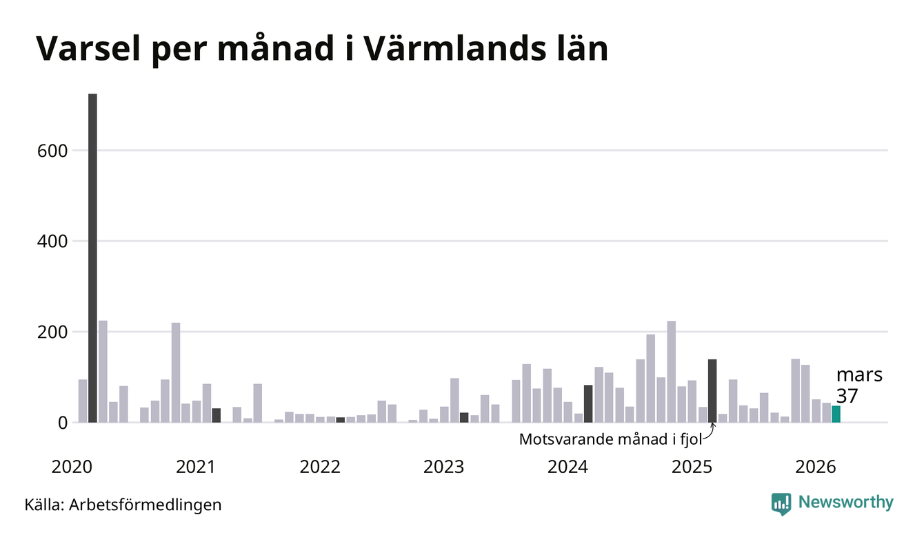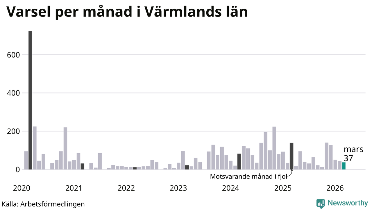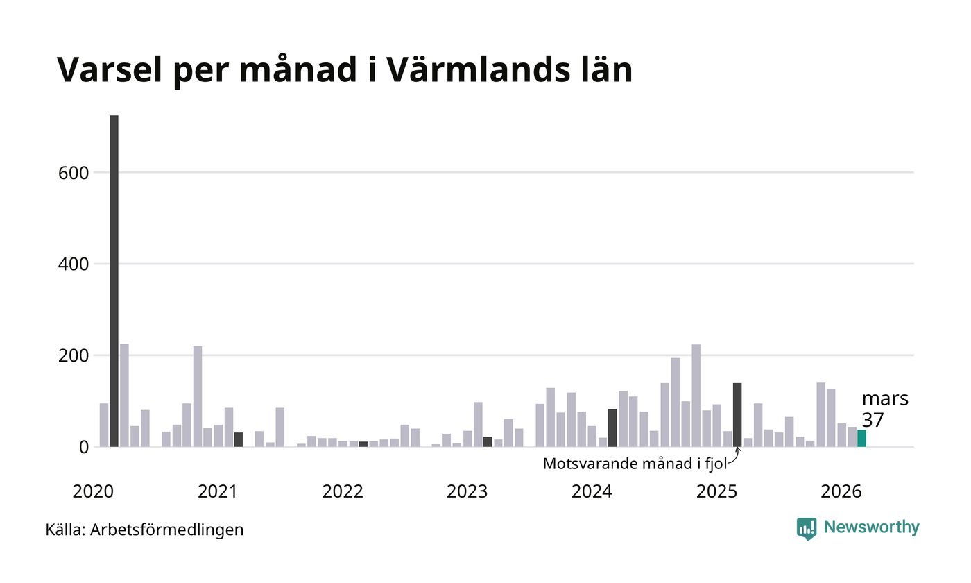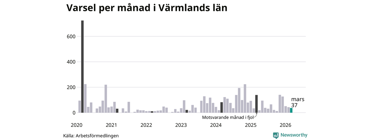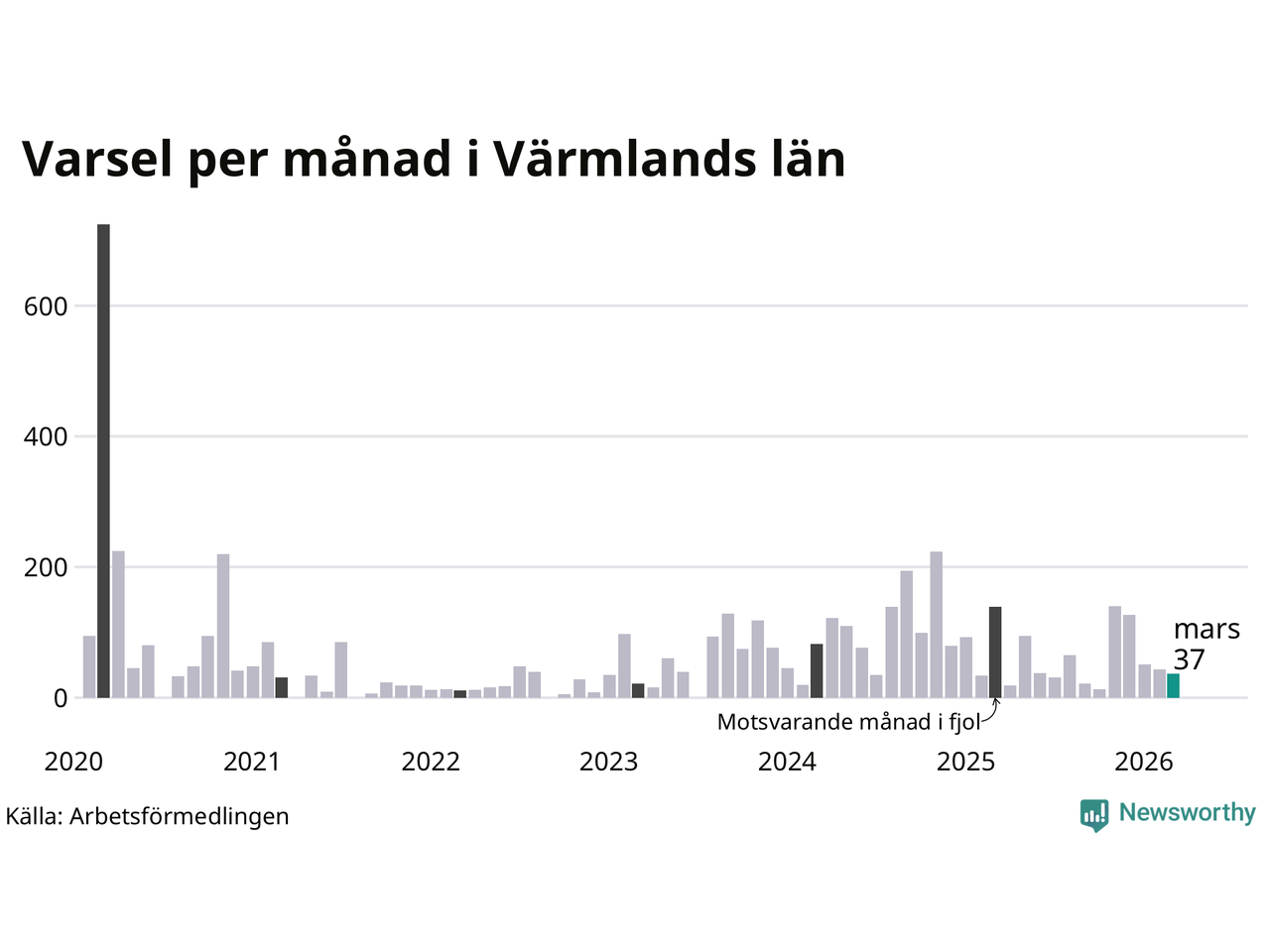 37 personer varslades om uppsägning i Värmland under mars 2026. Det är sex färre än i februari. För ett år sedan var antalet varsel 139 i länet. Sett över de tre senaste månaderna har totalt 131 varsel rapporterats i Värmland, vilket är 135 färre än motsvarande period 2025. I början av pandemin, i mars 2020, varslades som mest 724 personer under en månad i Värmland.