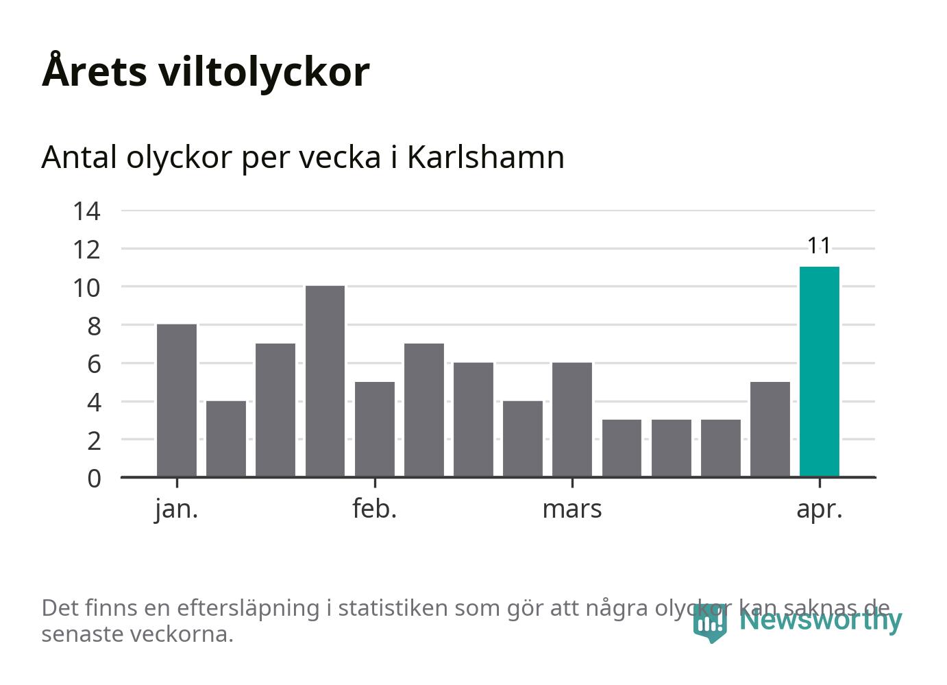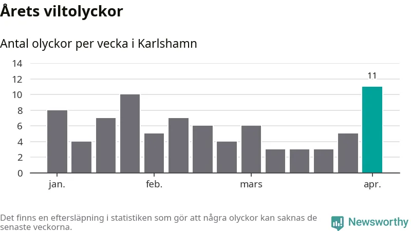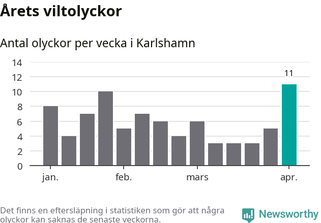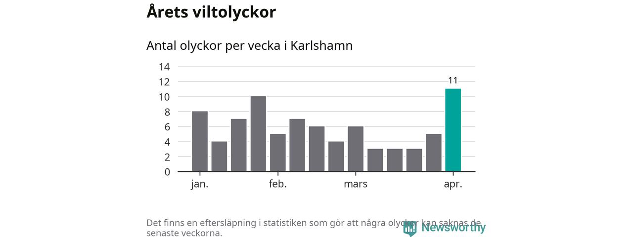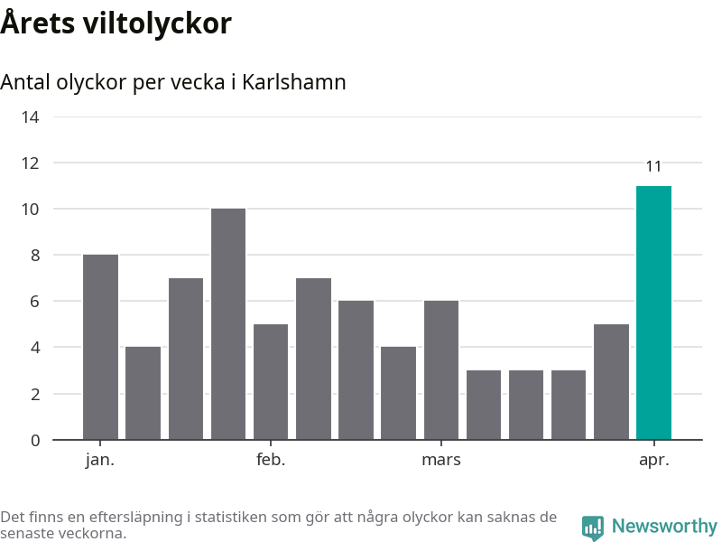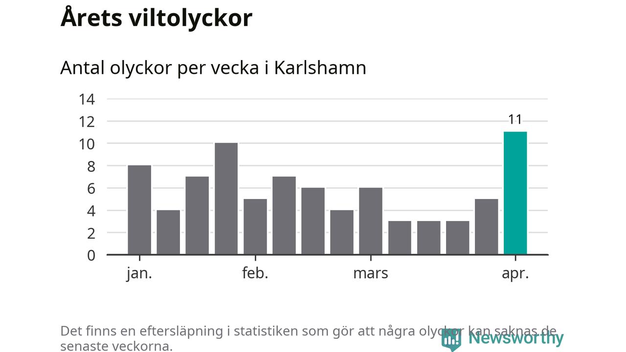 Under vecka 14 rapporterades elva viltolyckor in i Karlshamns kommun. Det är det största antalet på en enskild vecka hittills i år.