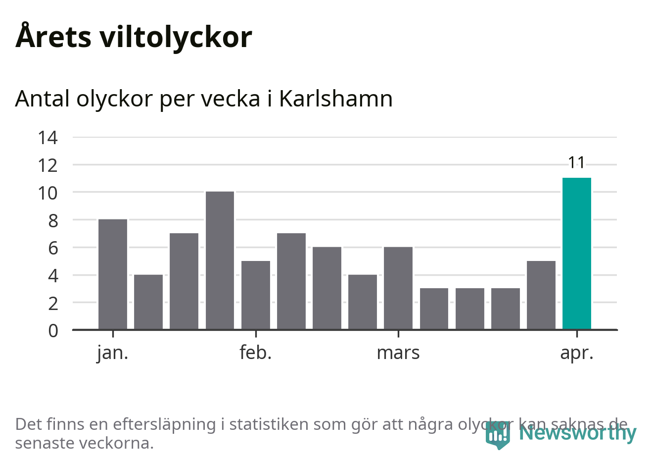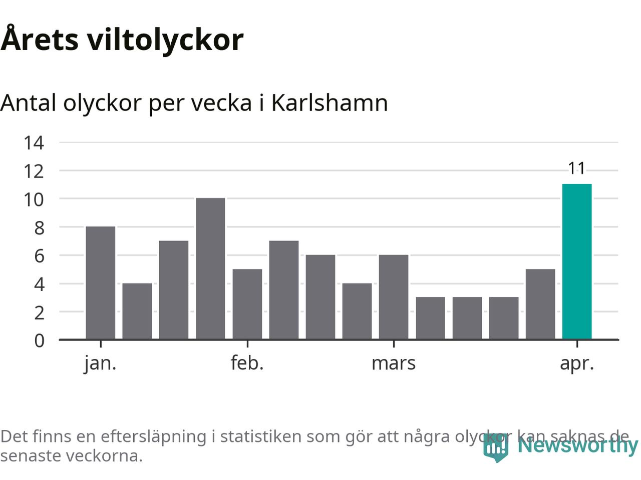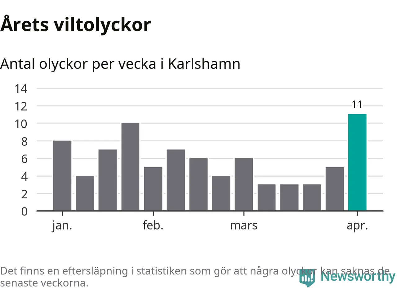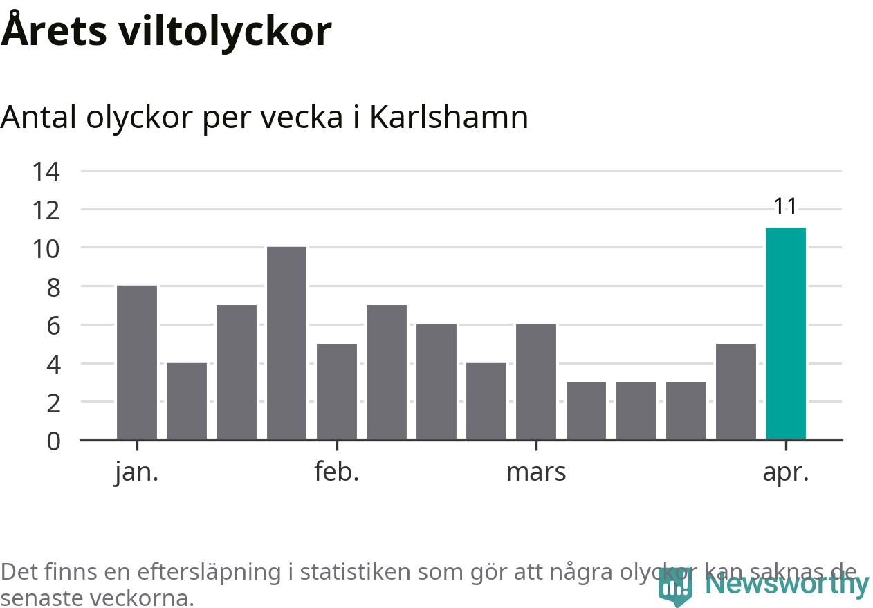 Under vecka 14 rapporterades elva viltolyckor in i Karlshamns kommun. Det är det största antalet på en enskild vecka hittills i år.