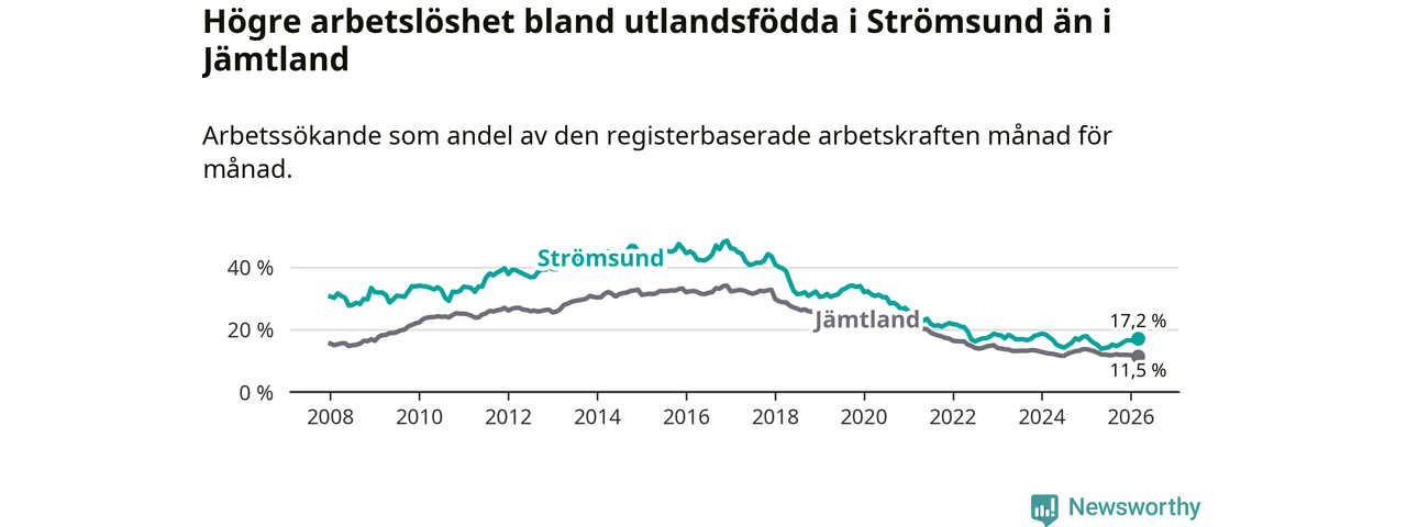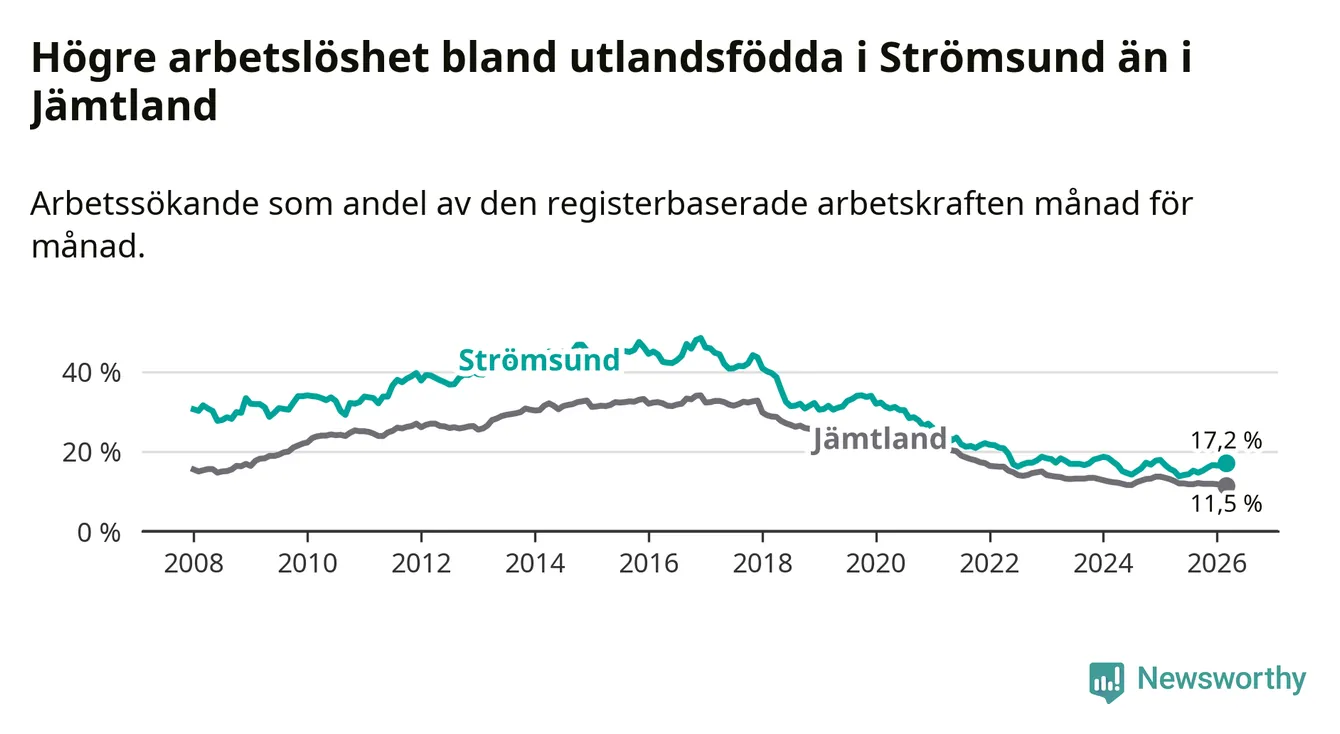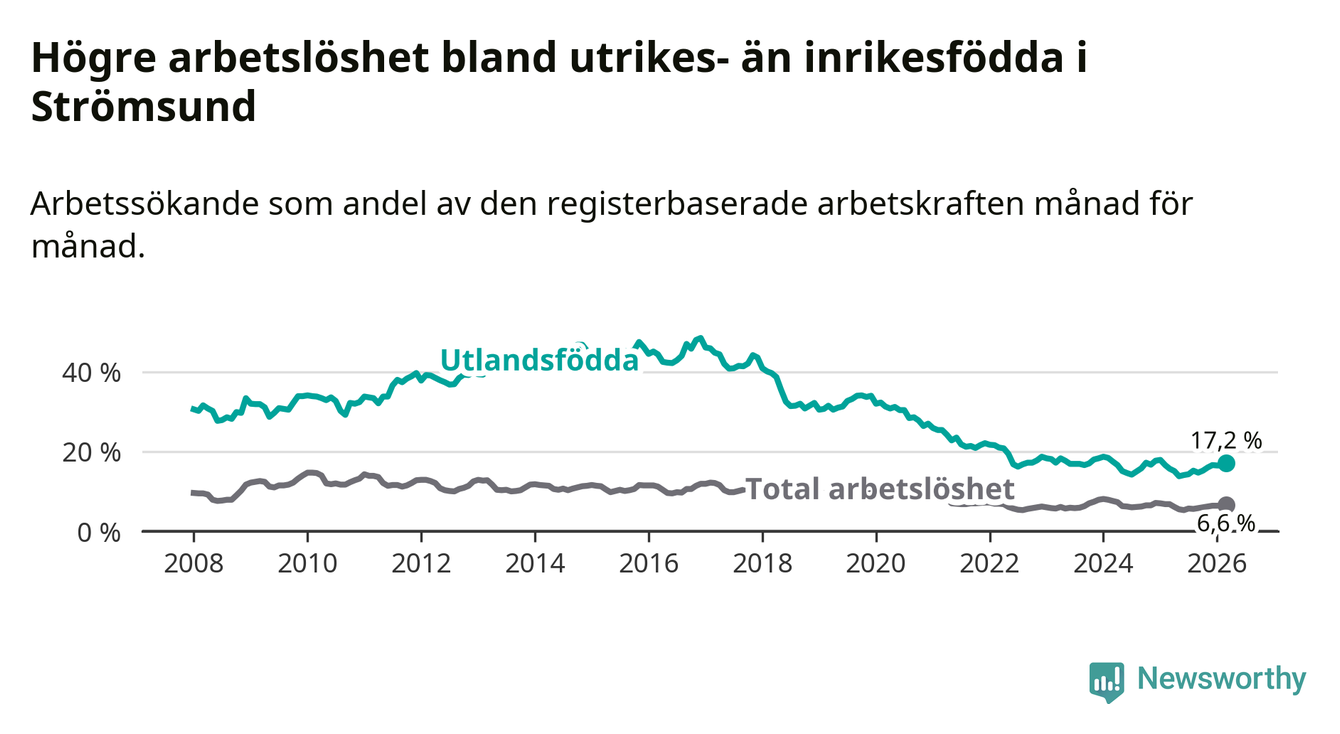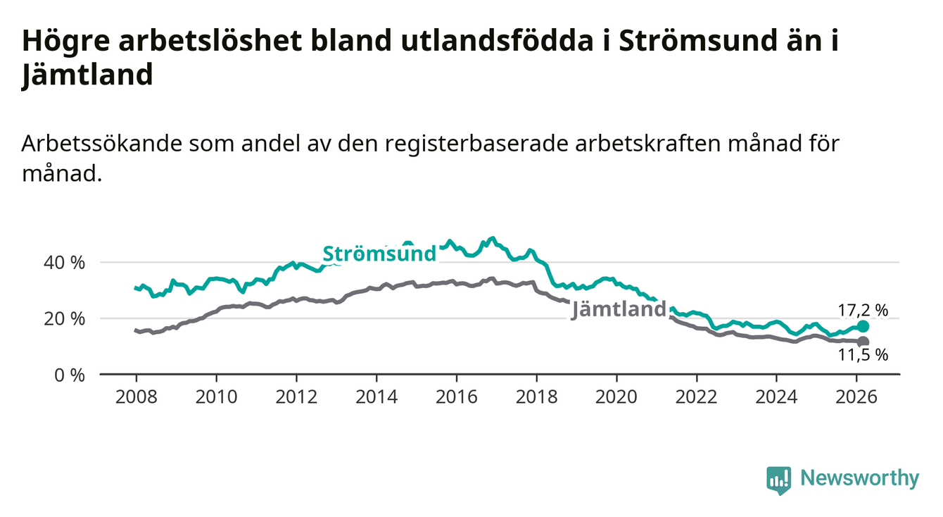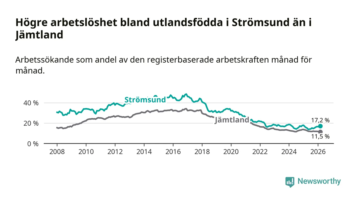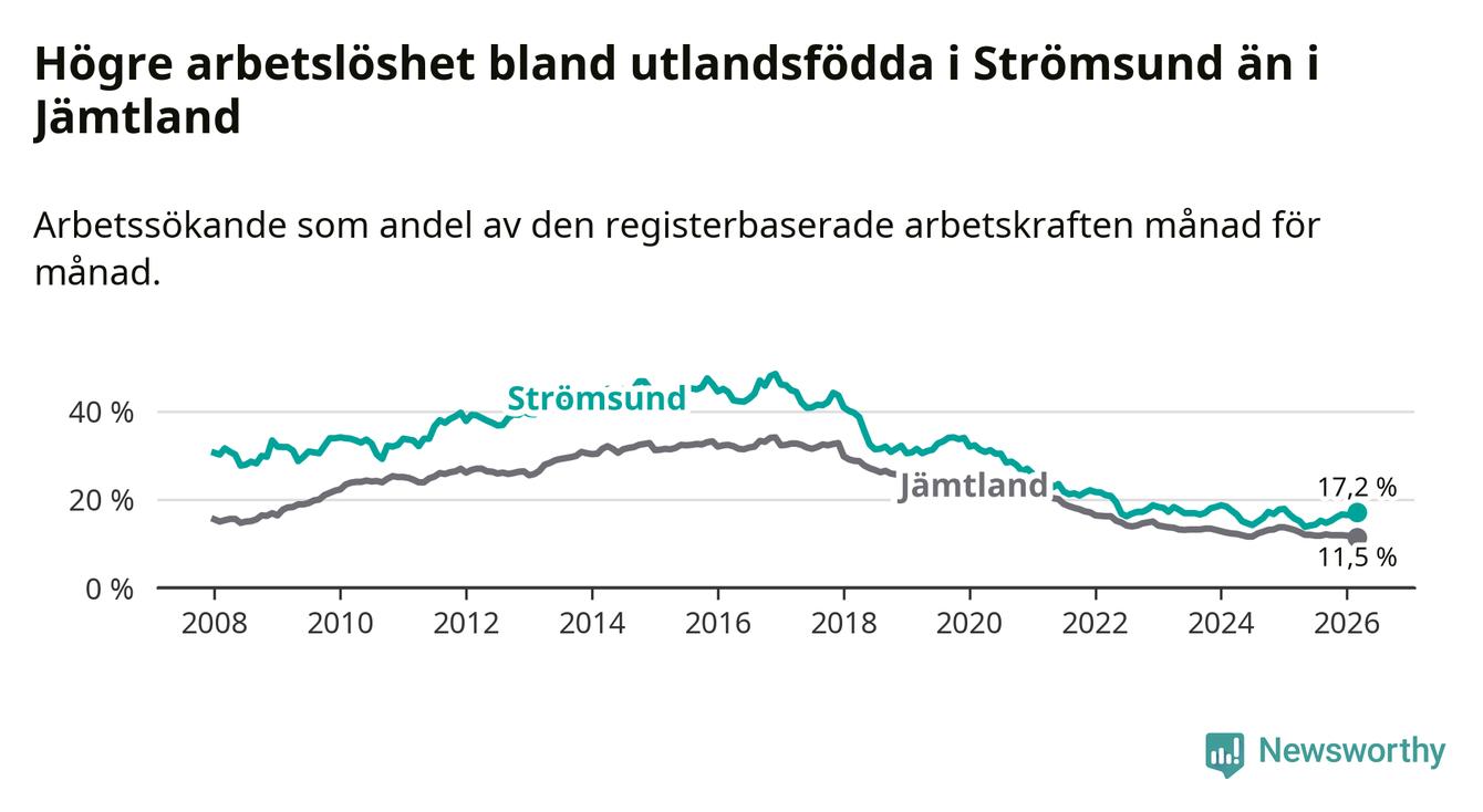 Arbetslösheten bland utlandsfödda var 17,2 procent i Strömsund under mars månad, motsvarande 118 av 686 personer. Det är 1,5 procentenheter fler än vid samma tidpunkt i fjol (+12 om man räknar personer). Den senaste månadens uppgång innebär ett trendbrott. Under de sex föregående månaderna hade arbetslösheten bland utlandsfödda varit lägre än motsvarande tidpunkt året innan.