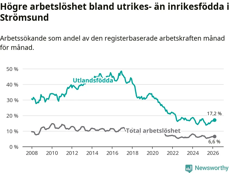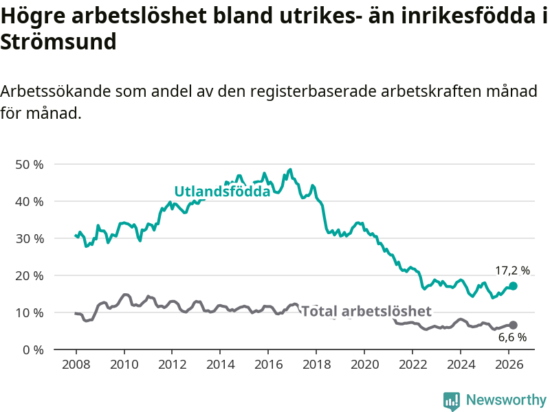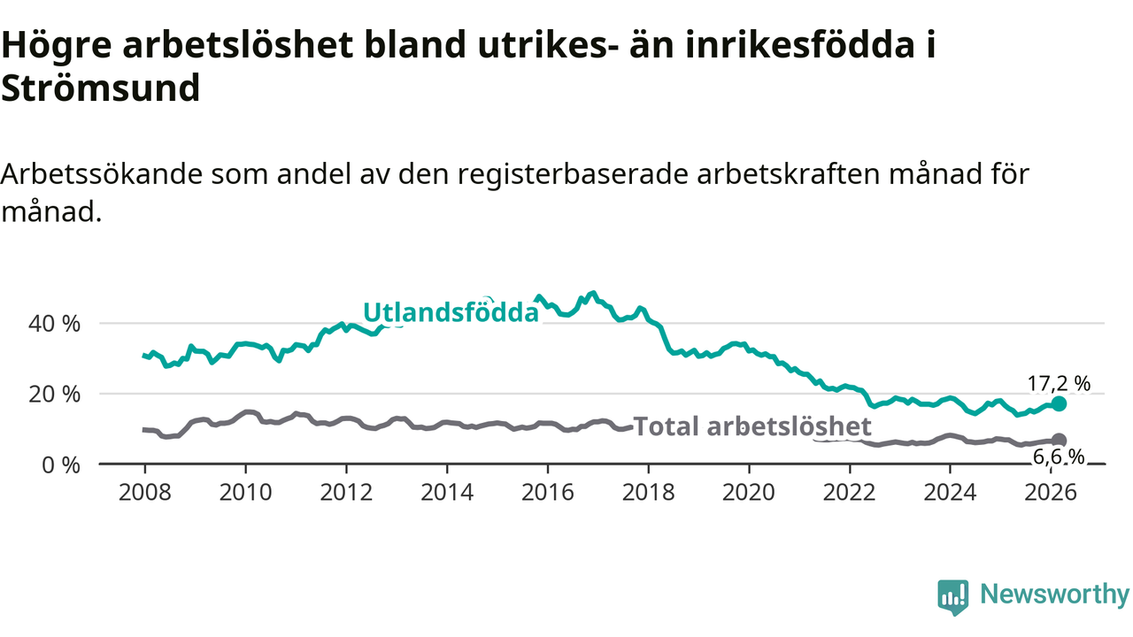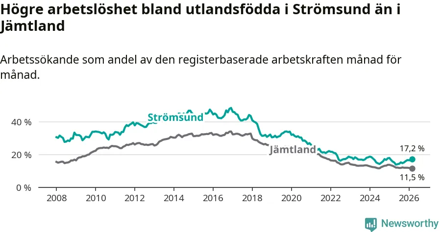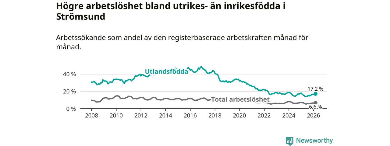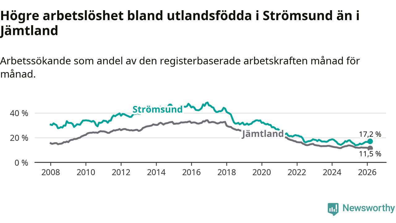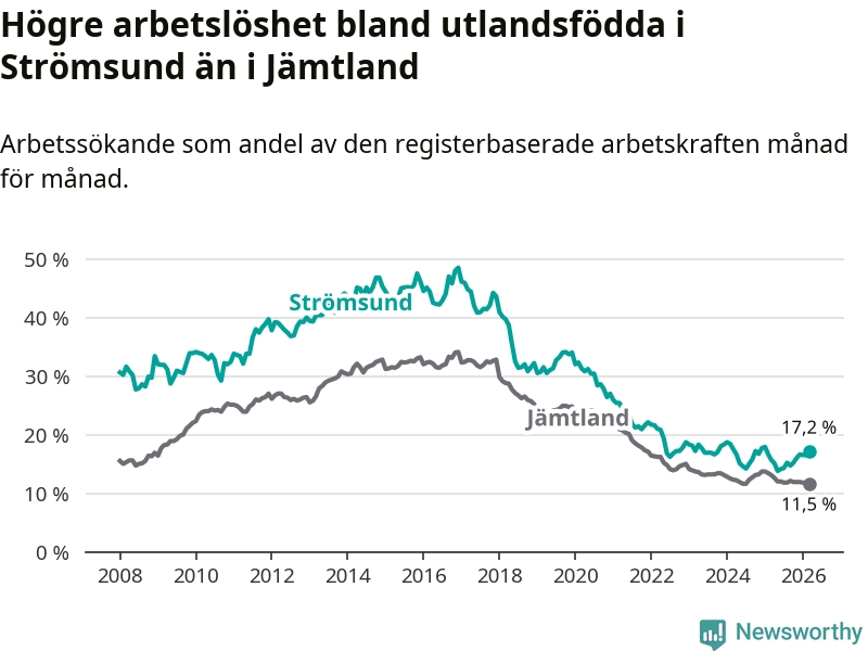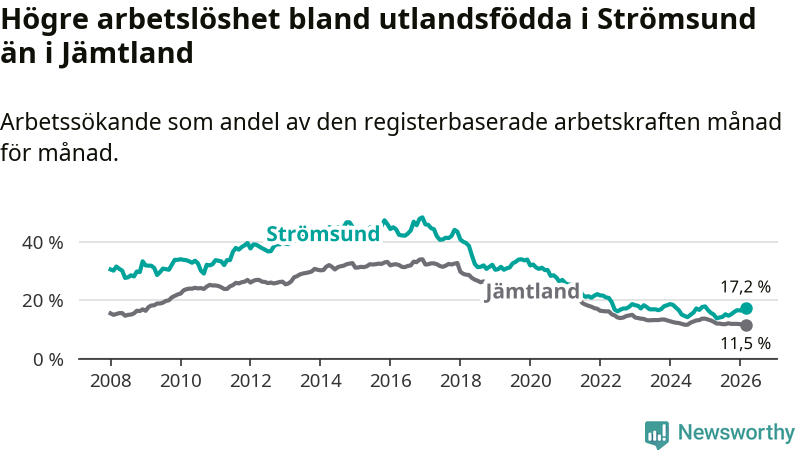 Arbetslösheten bland utlandsfödda var 17,2 procent i Strömsund under mars månad, motsvarande 118 av 686 personer. Det är 1,5 procentenheter fler än vid samma tidpunkt i fjol (+12 om man räknar personer). Den senaste månadens uppgång innebär ett trendbrott. Under de sex föregående månaderna hade arbetslösheten bland utlandsfödda varit lägre än motsvarande tidpunkt året innan.