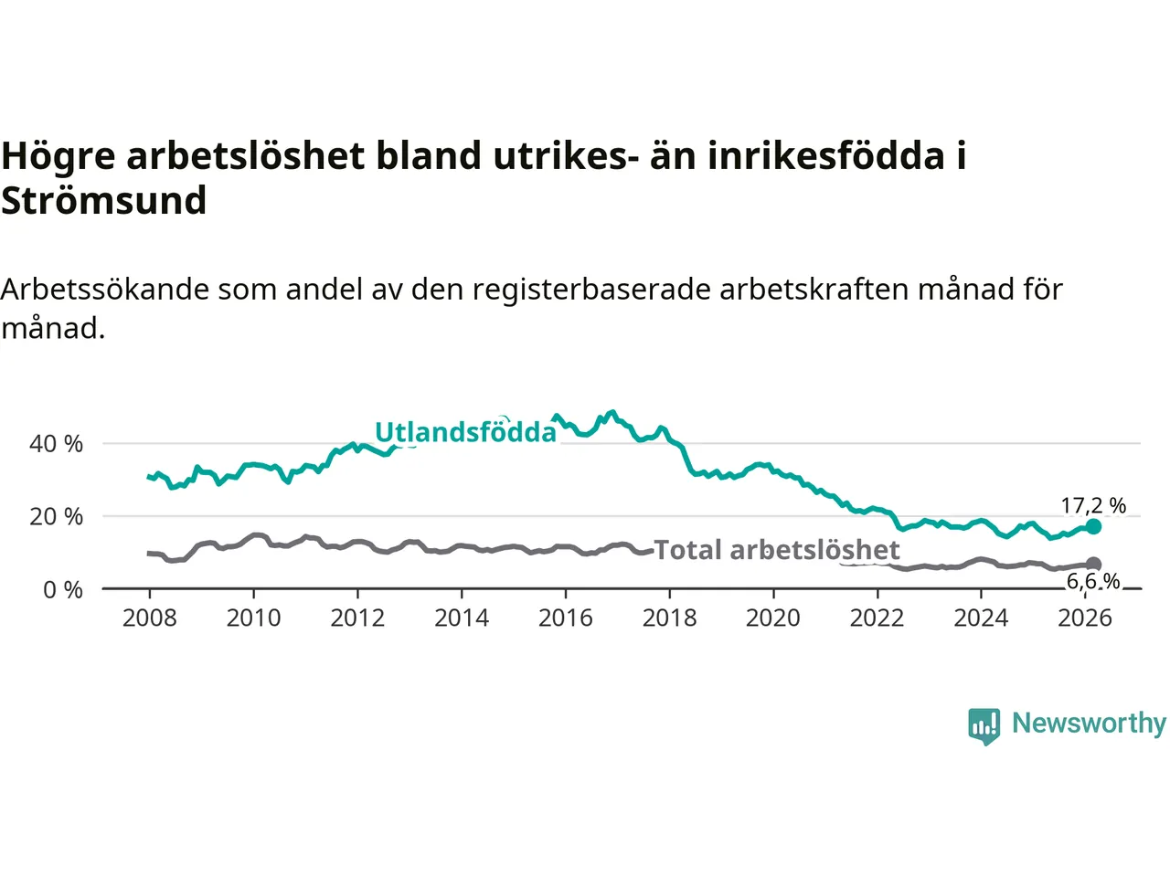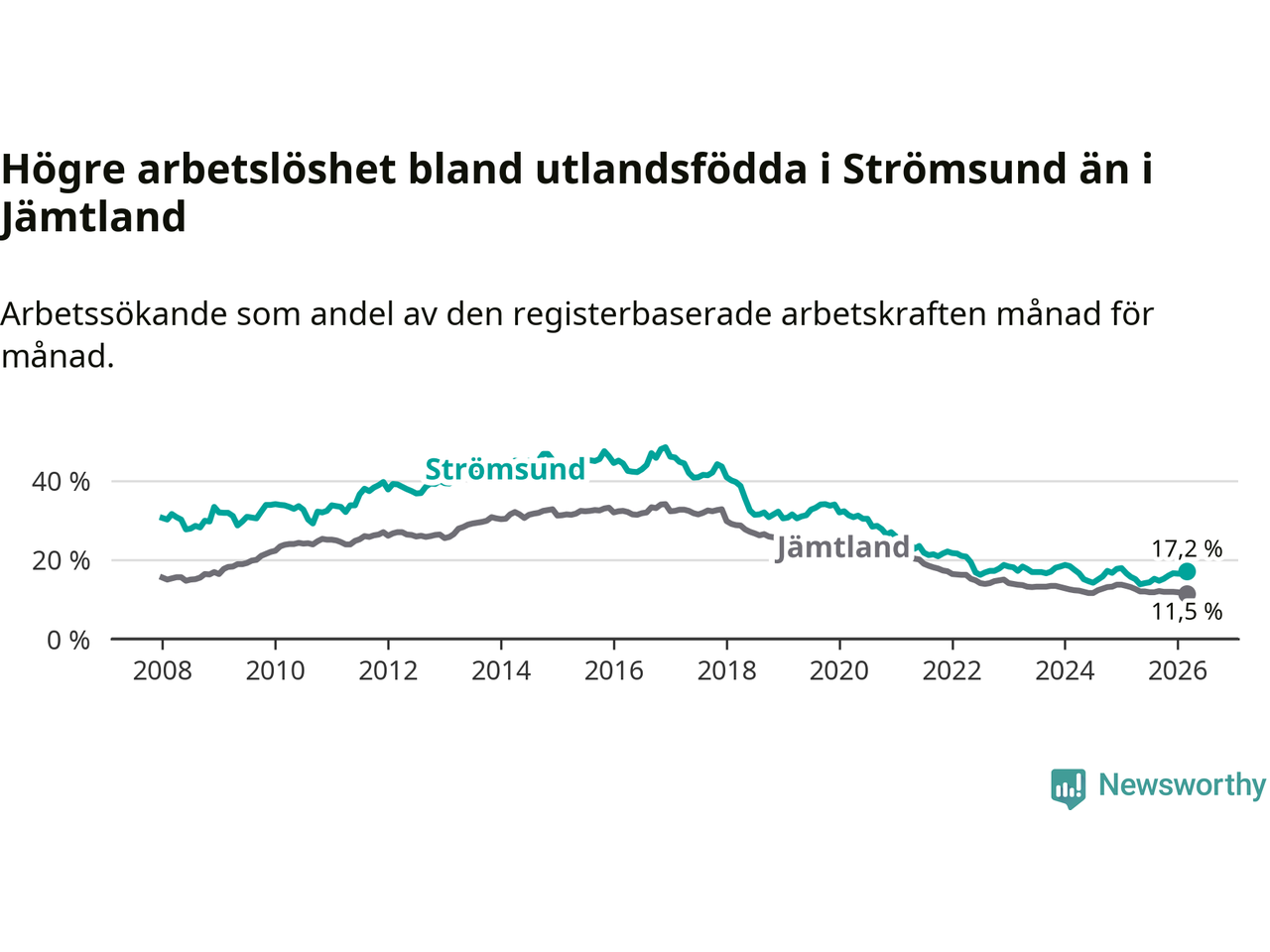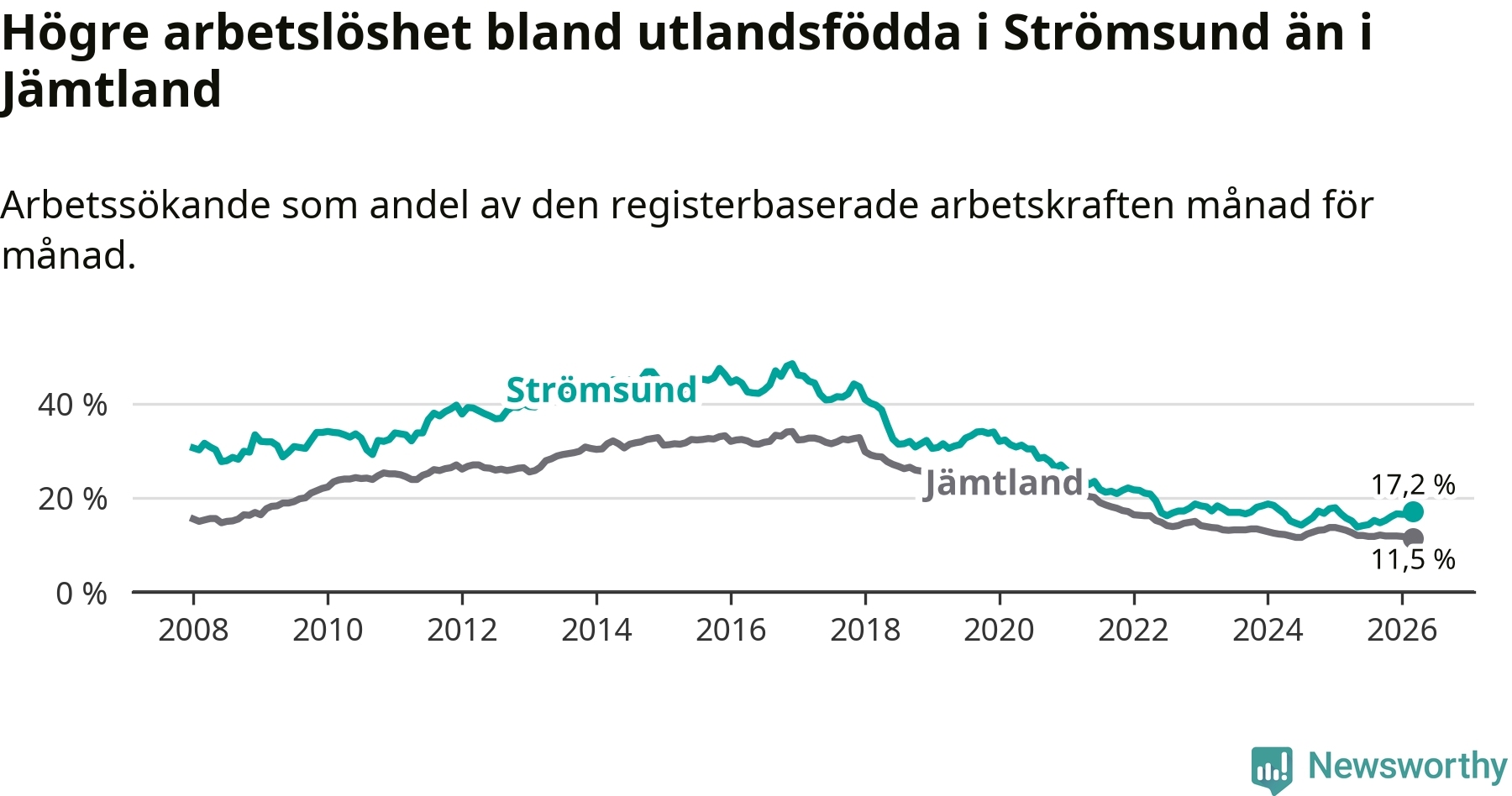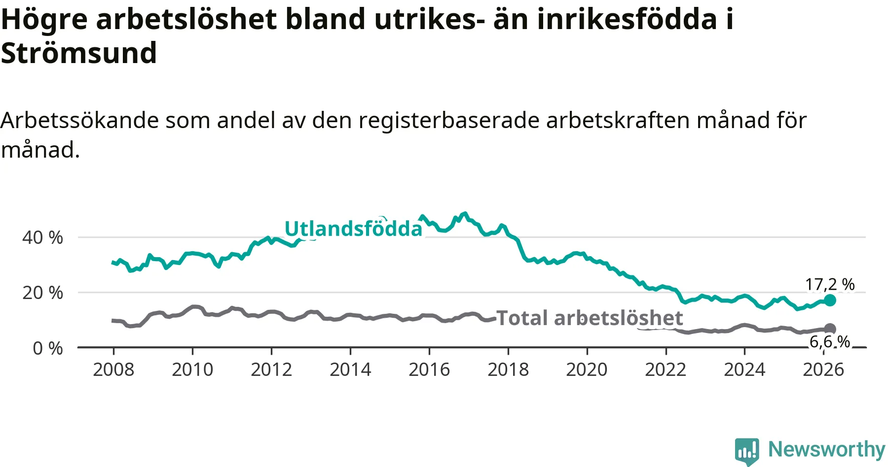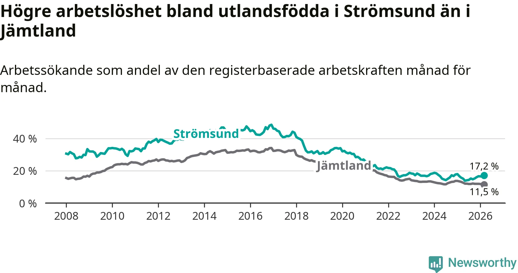 Arbetslösheten bland utlandsfödda var 17,2 procent i Strömsund under mars månad, motsvarande 118 av 686 personer. Det är 1,5 procentenheter fler än vid samma tidpunkt i fjol (+12 om man räknar personer). Den senaste månadens uppgång innebär ett trendbrott. Under de sex föregående månaderna hade arbetslösheten bland utlandsfödda varit lägre än motsvarande tidpunkt året innan.
