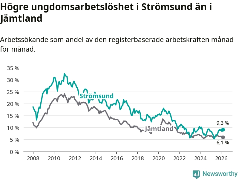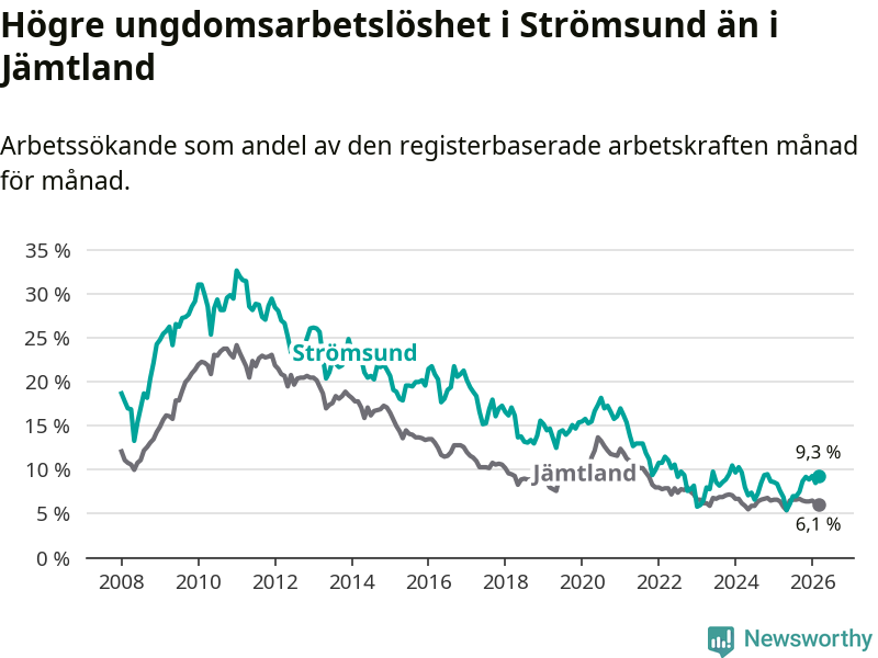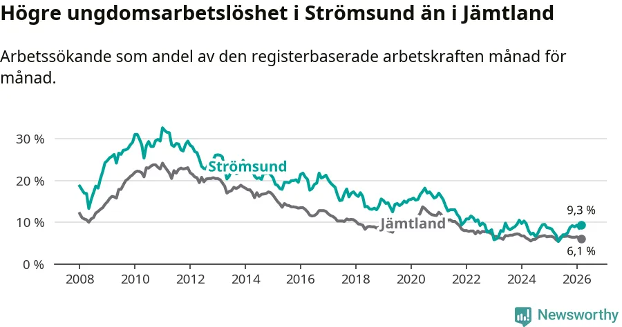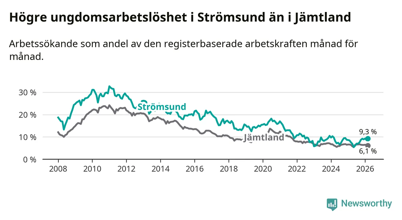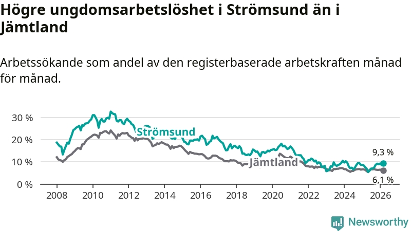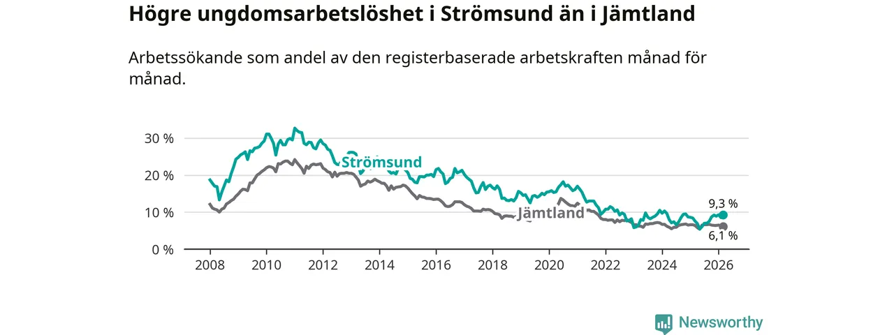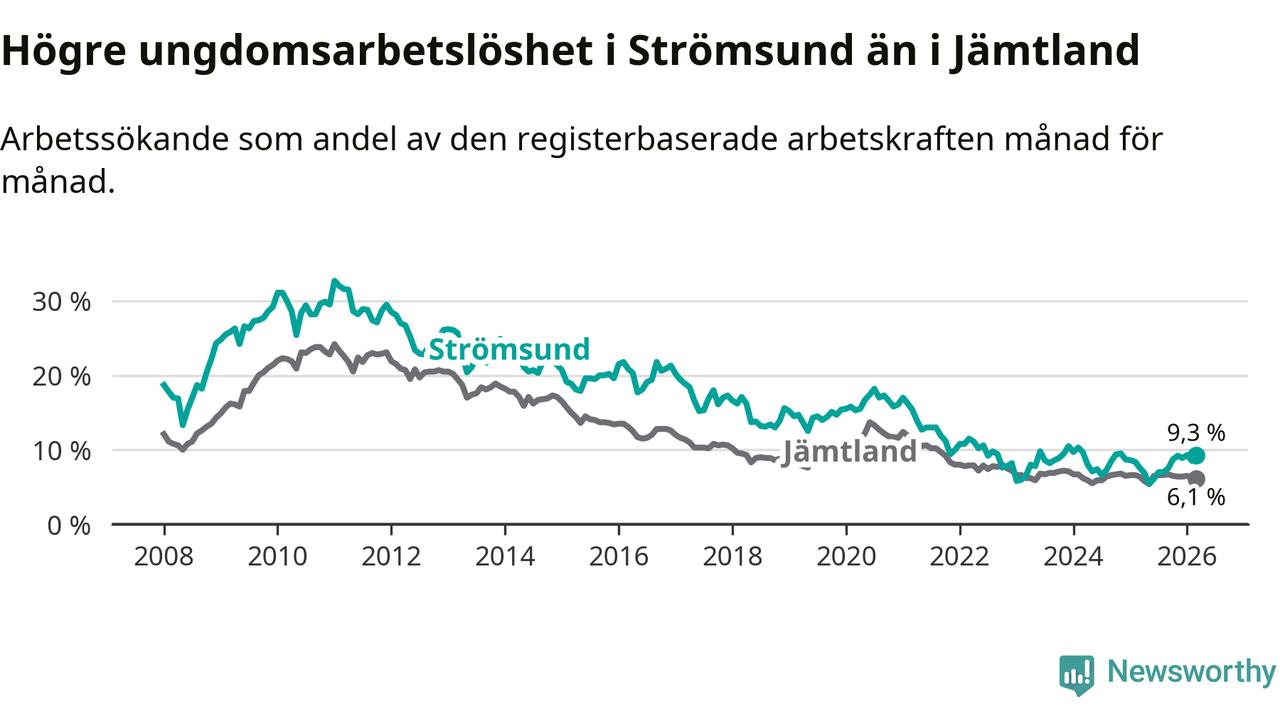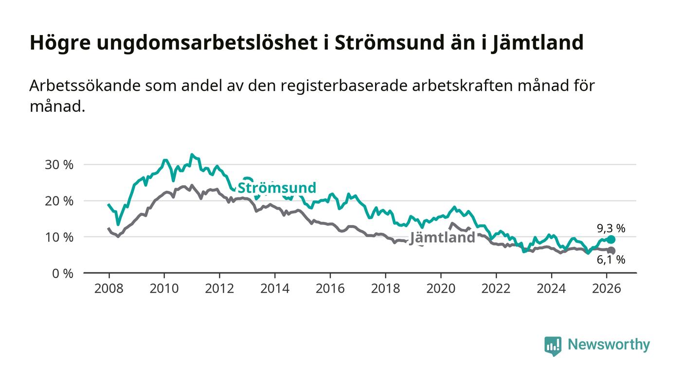 Precis som den totala arbetslösheten ligger ungdomsarbetslösheten i Strömsund högre än i Jämtland som helhet. Skillnaden mellan kommunen och länet är 3,2 procentenheter.