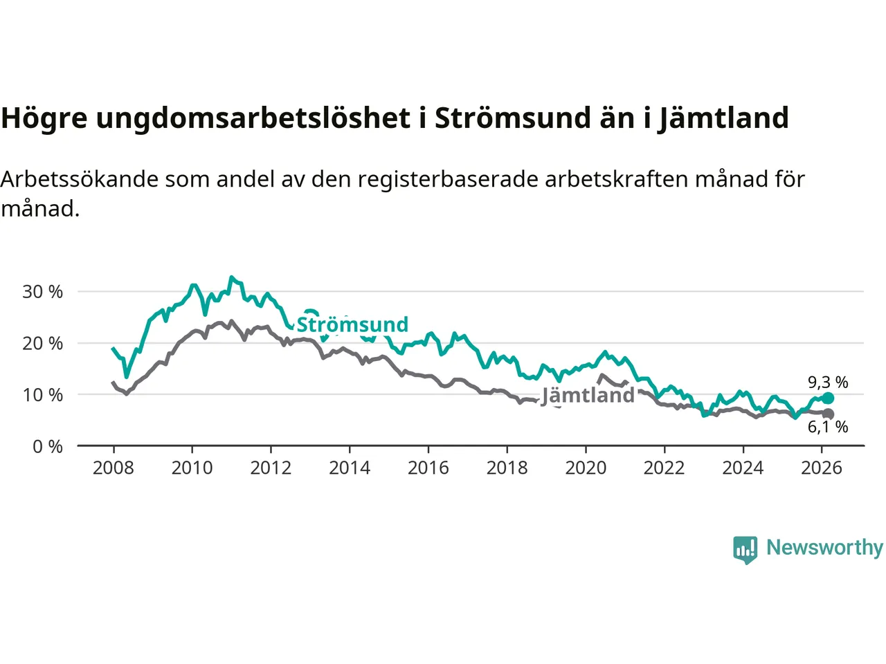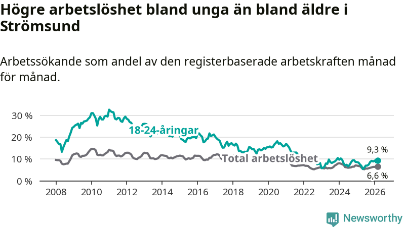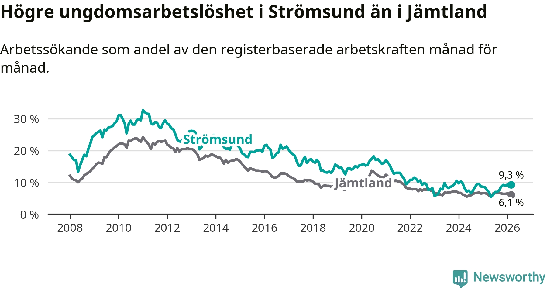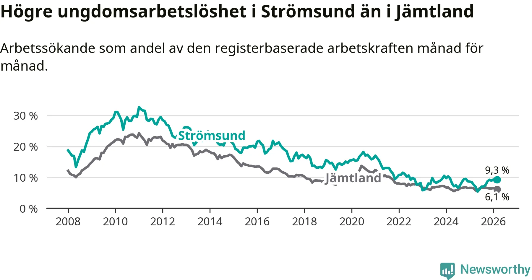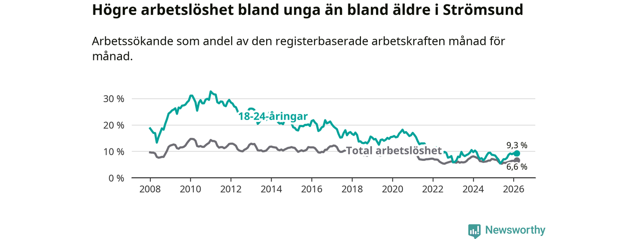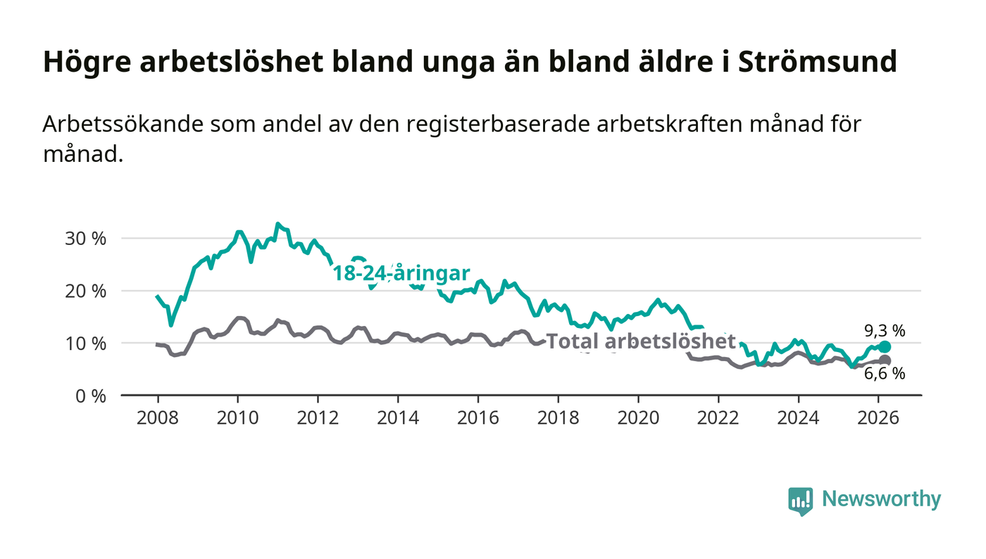Precis som den totala arbetslösheten ligger ungdomsarbetslösheten i Strömsund högre än i Jämtland som helhet. Skillnaden mellan kommunen och länet är 3,2 procentenheter.