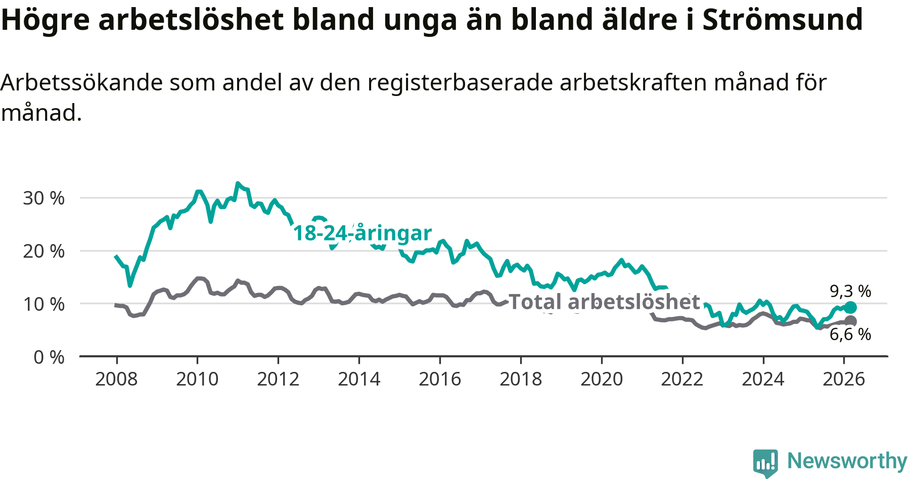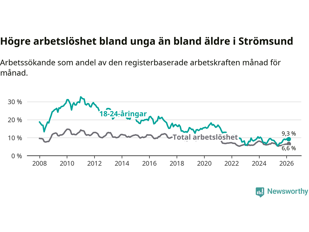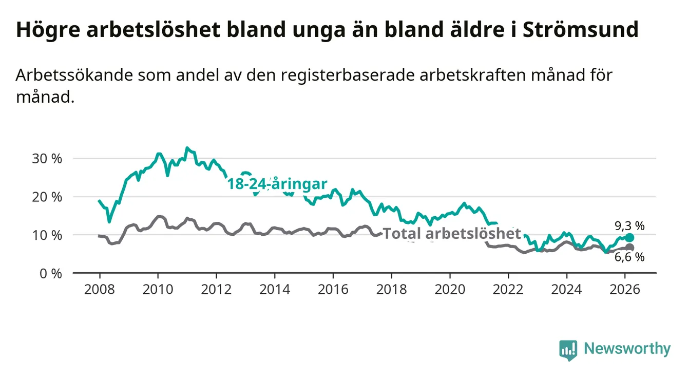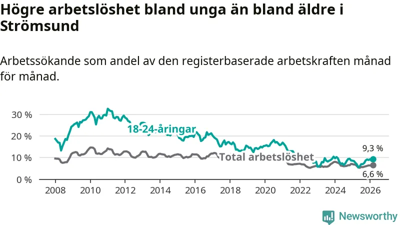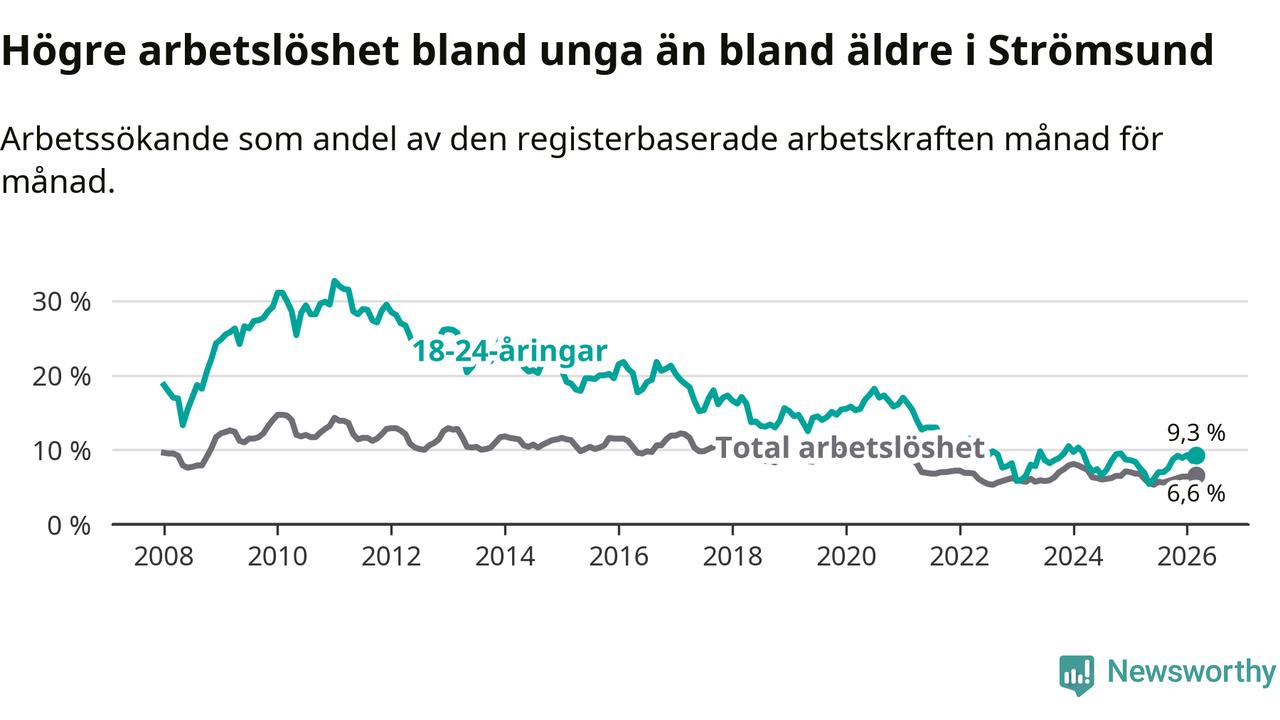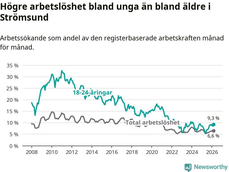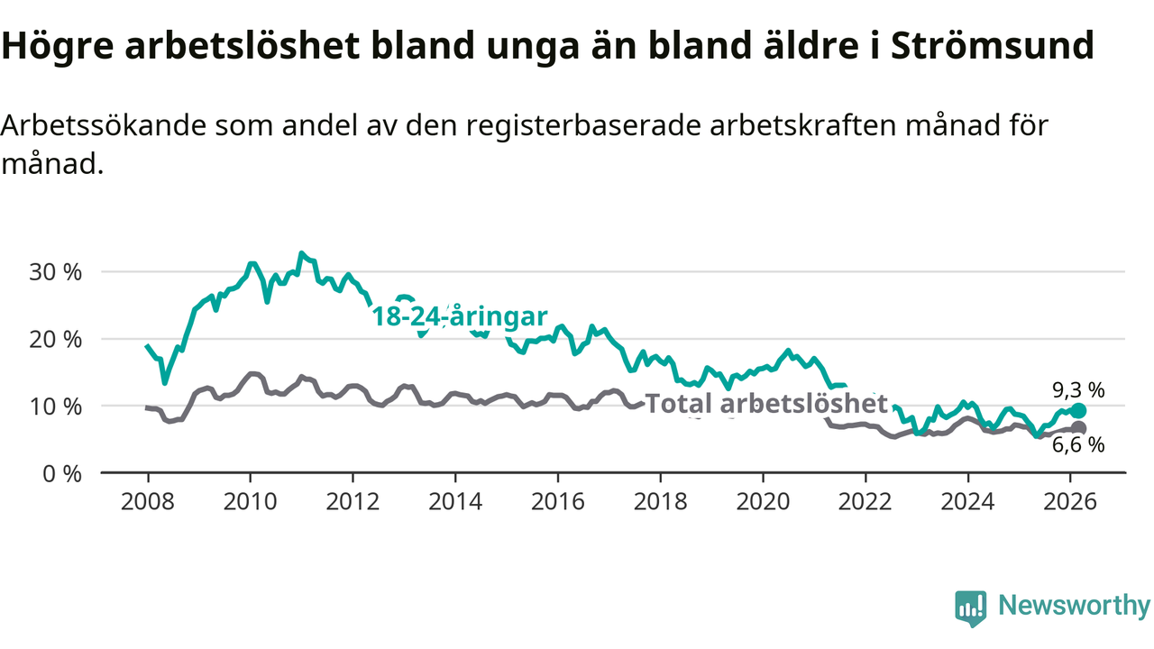 Precis som den totala arbetslösheten ligger ungdomsarbetslösheten i Strömsund högre än i Jämtland som helhet. Skillnaden mellan kommunen och länet är 3,2 procentenheter.