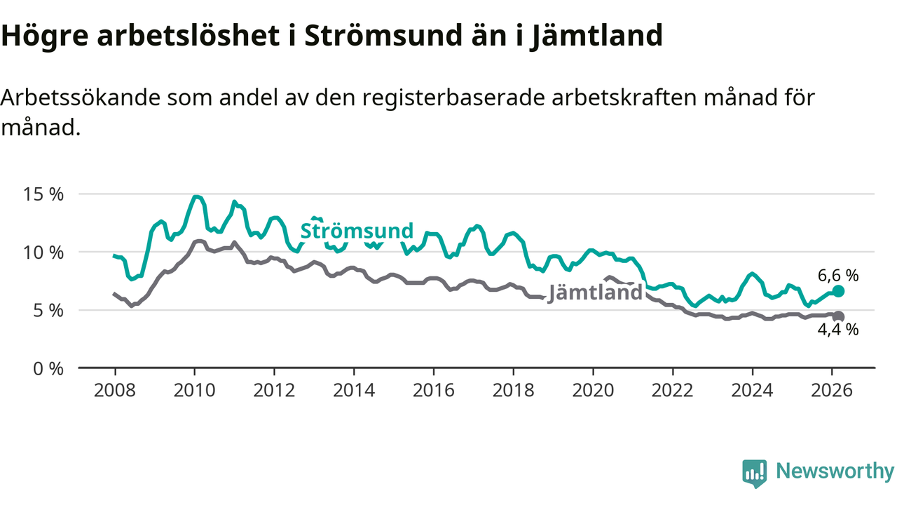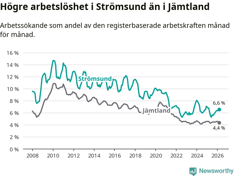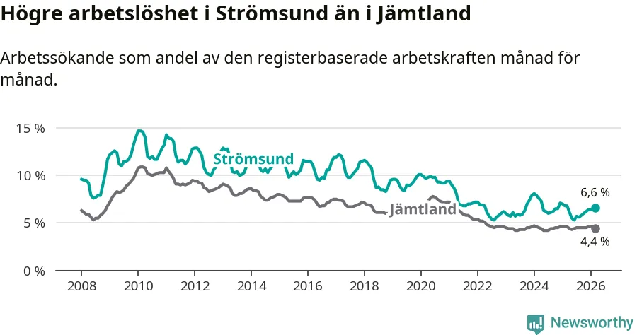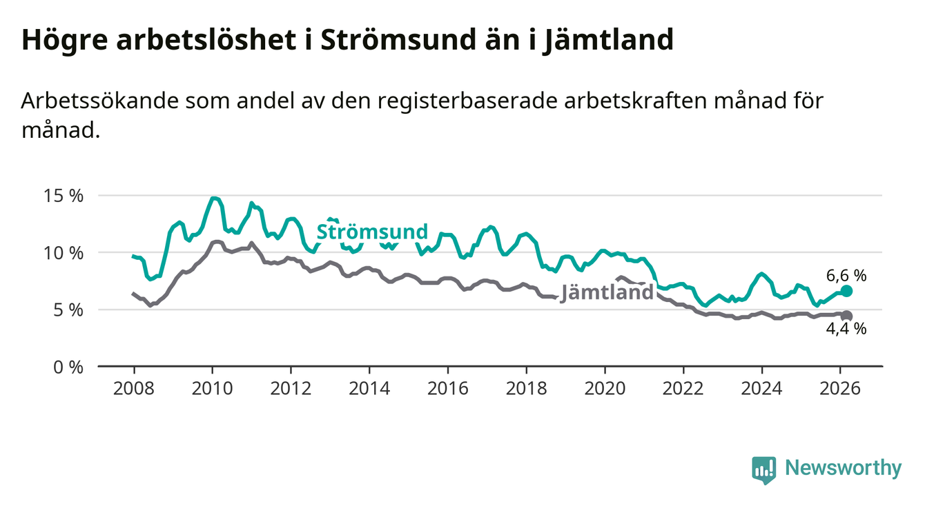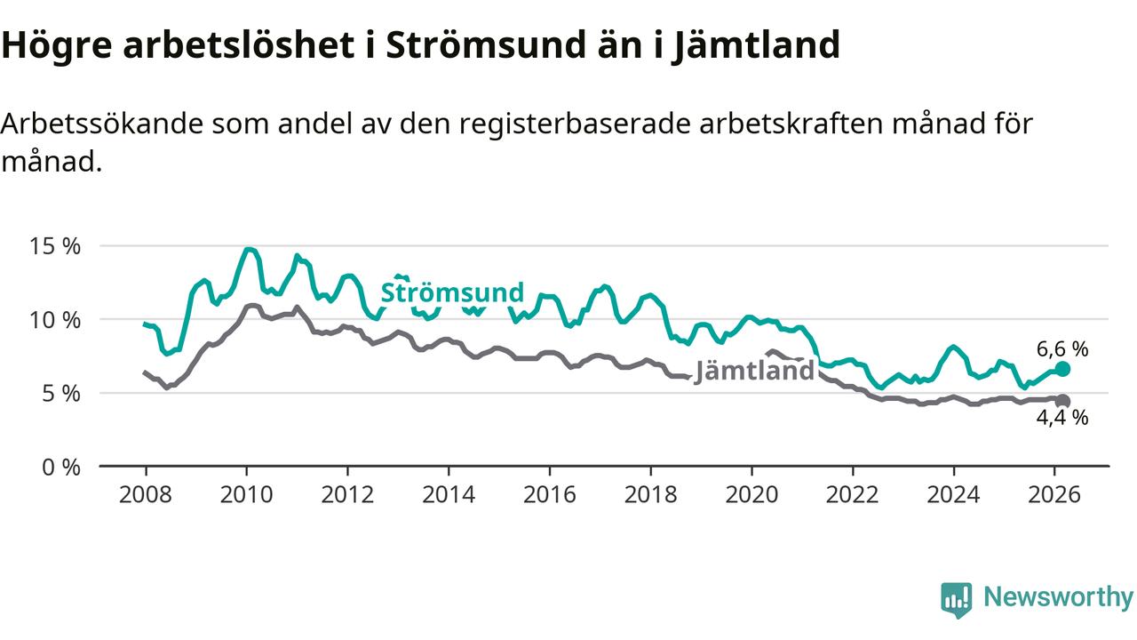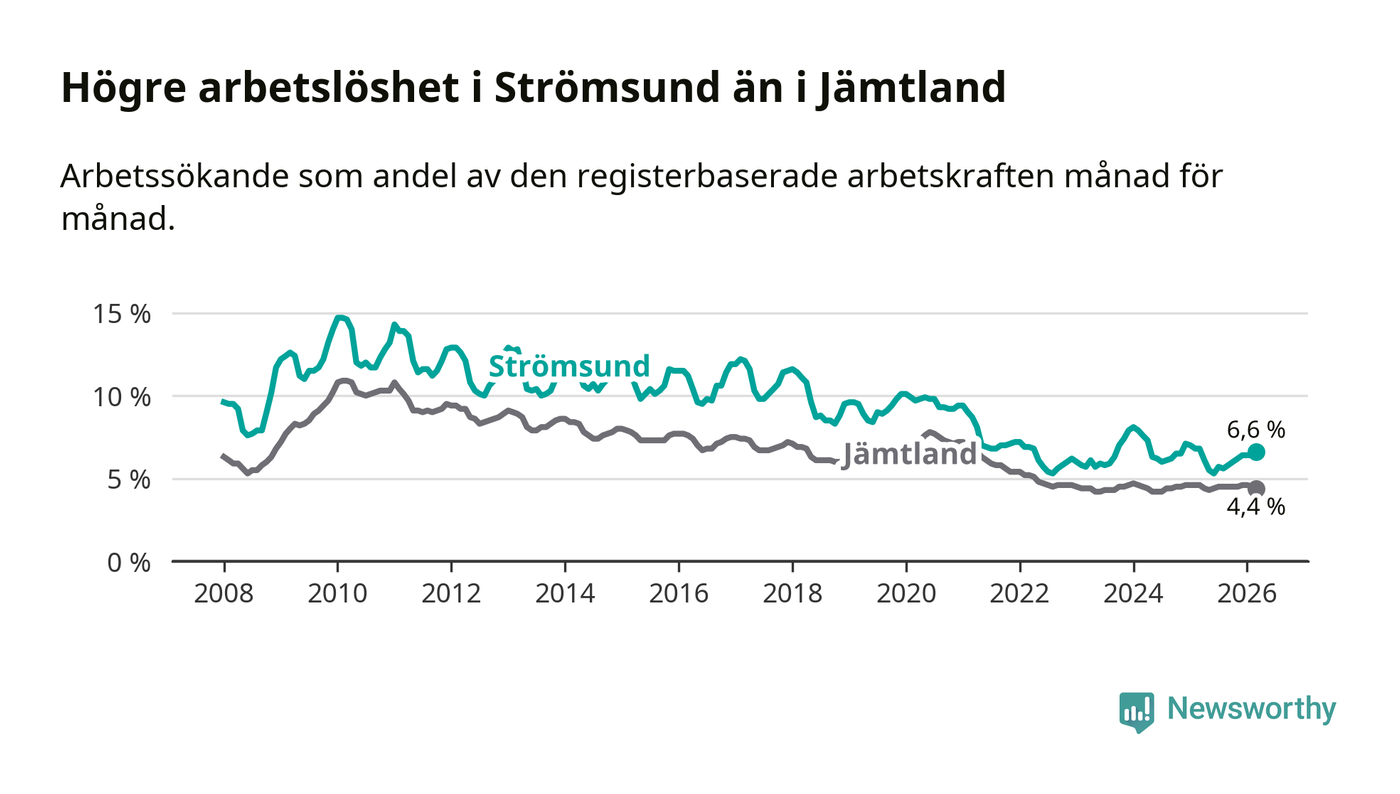 Även om arbetslösheten i Strömsund alltså minskar, så ligger den fortfarande över snittet i hela Jämtlands län (6,6 procent i kommunen, jämfört med 4,4 procent i hela länet). Strömsund har därmed även den högsta arbetslöshetsnivån i länet. Krokom har den lägsta (3,0 procent). För att Strömsund skulle komma ner i samma arbetslöshetsnivå som Krokom skulle 175 personer behöva sysselsättas.