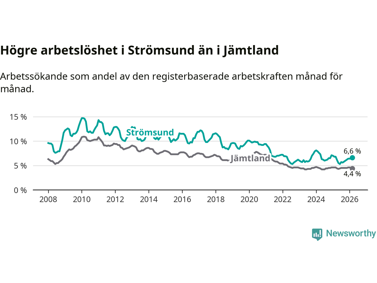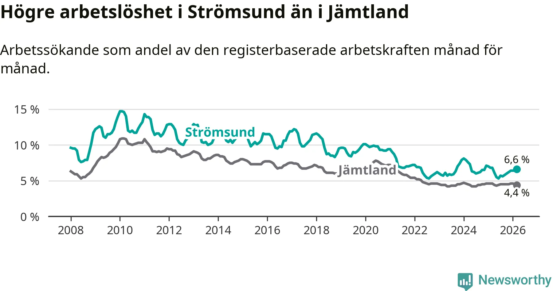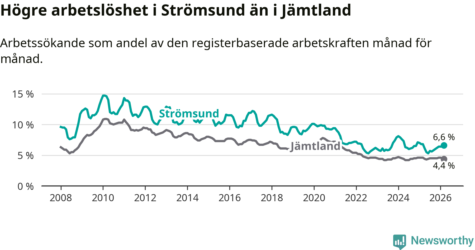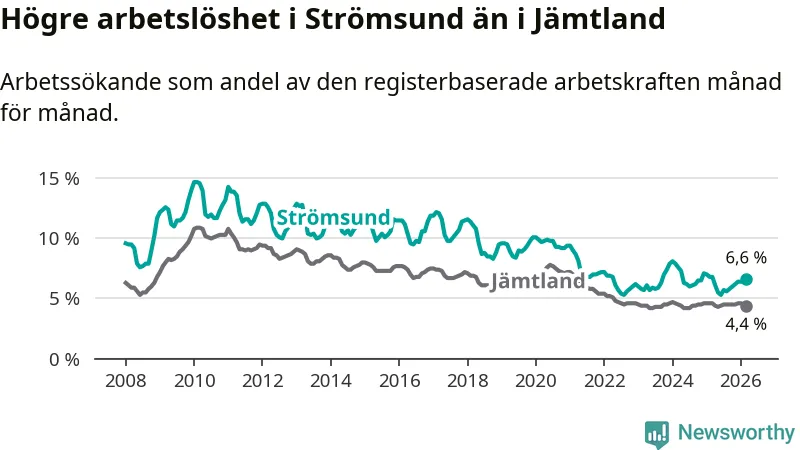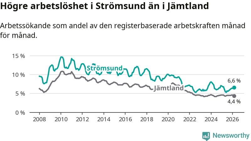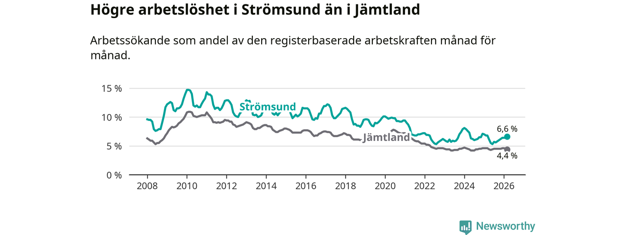 Även om arbetslösheten i Strömsund alltså minskar, så ligger den fortfarande över snittet i hela Jämtlands län (6,6 procent i kommunen, jämfört med 4,4 procent i hela länet). Strömsund har därmed även den högsta arbetslöshetsnivån i länet. Krokom har den lägsta (3,0 procent). För att Strömsund skulle komma ner i samma arbetslöshetsnivå som Krokom skulle 175 personer behöva sysselsättas.