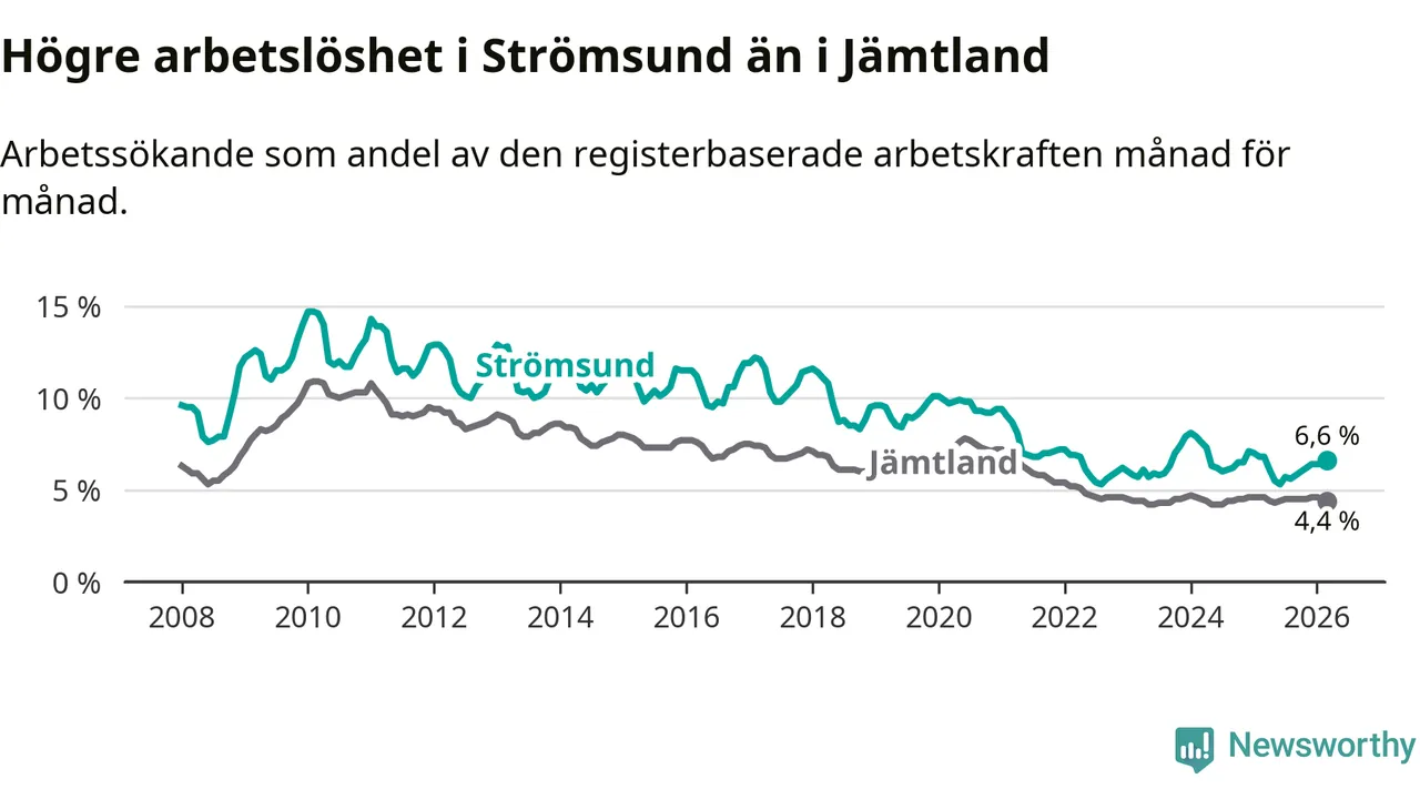 Under mars månad rapporterade Strömsunds kommun en total arbetslöshet på 6,6 procent. Det är en minskning jämfört med samma tidpunkt i fjol (−0,2 procentenheter). Även i Jämtlands län sjunker arbetslösheten .