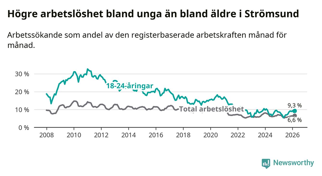 Till skillnad från den totala arbetslösheten stiger arbetslösheten bland unga (+1,7 procentenheter). I mars var 9,3 procent av 18–24-åringarna inskrivna som arbetssökande (motsvarande 44 personer). Mäter vi antalet inskrivna ser vi en ökning med sju personer på ett års sikt.