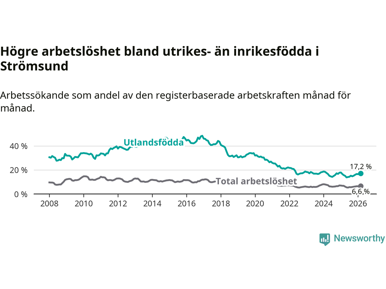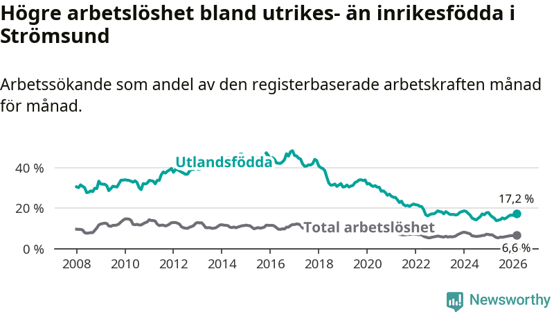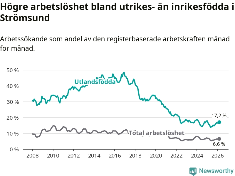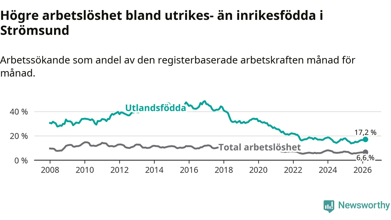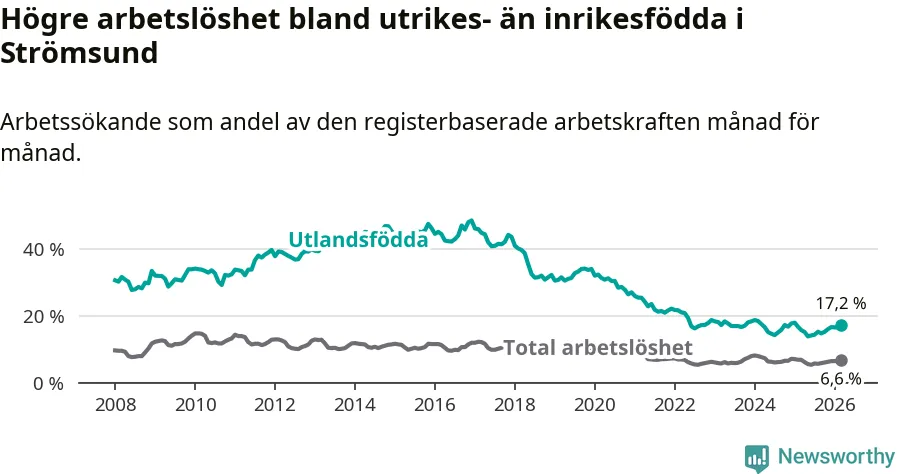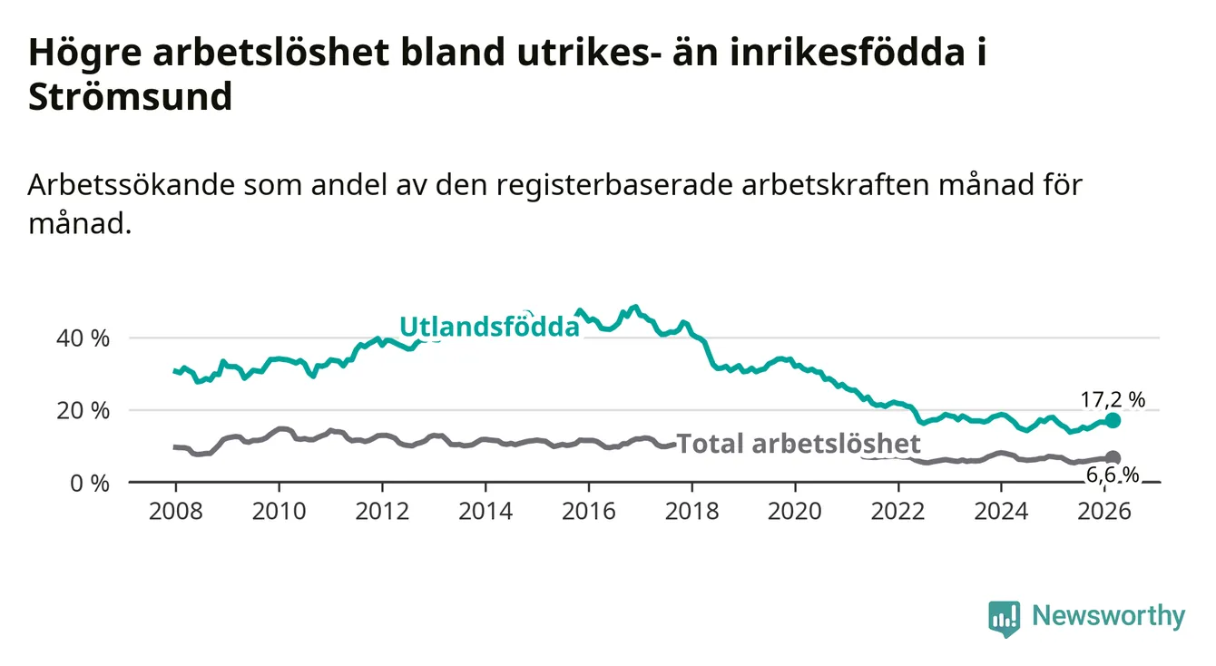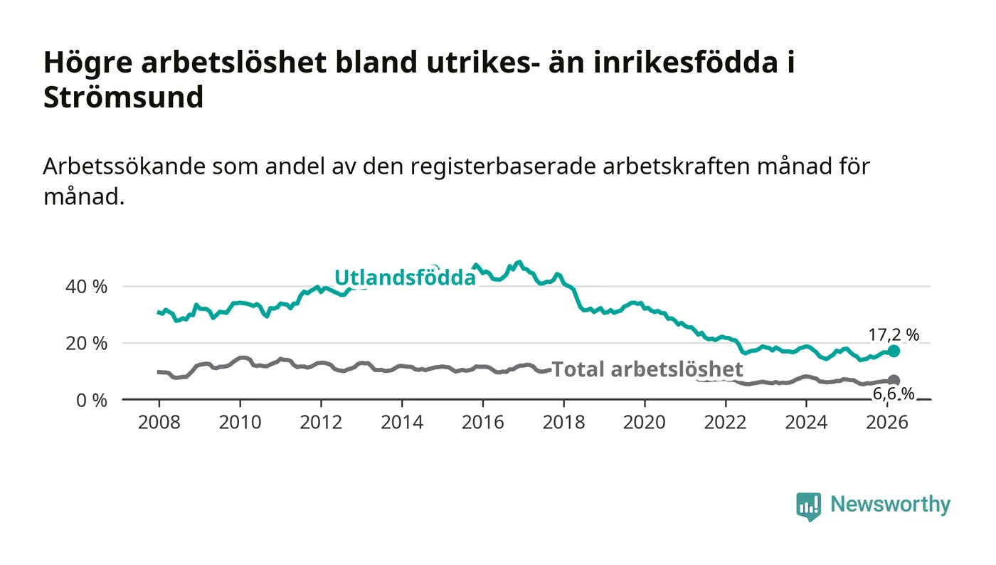 Skillnaden i arbetslöshet mellan utrikesfödda och hela befolkningen är 10,6 procentenheter i Strömsund. Det är en betydligt större skillnad än för ett år sedan (+1,7 procentenheter).