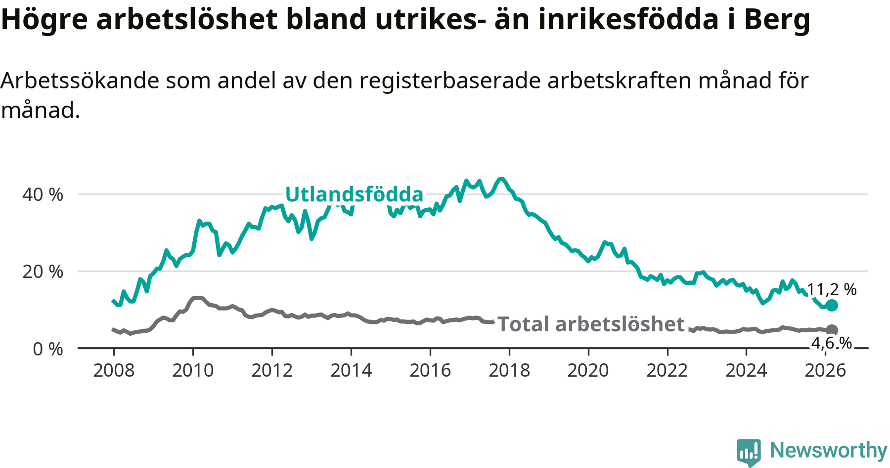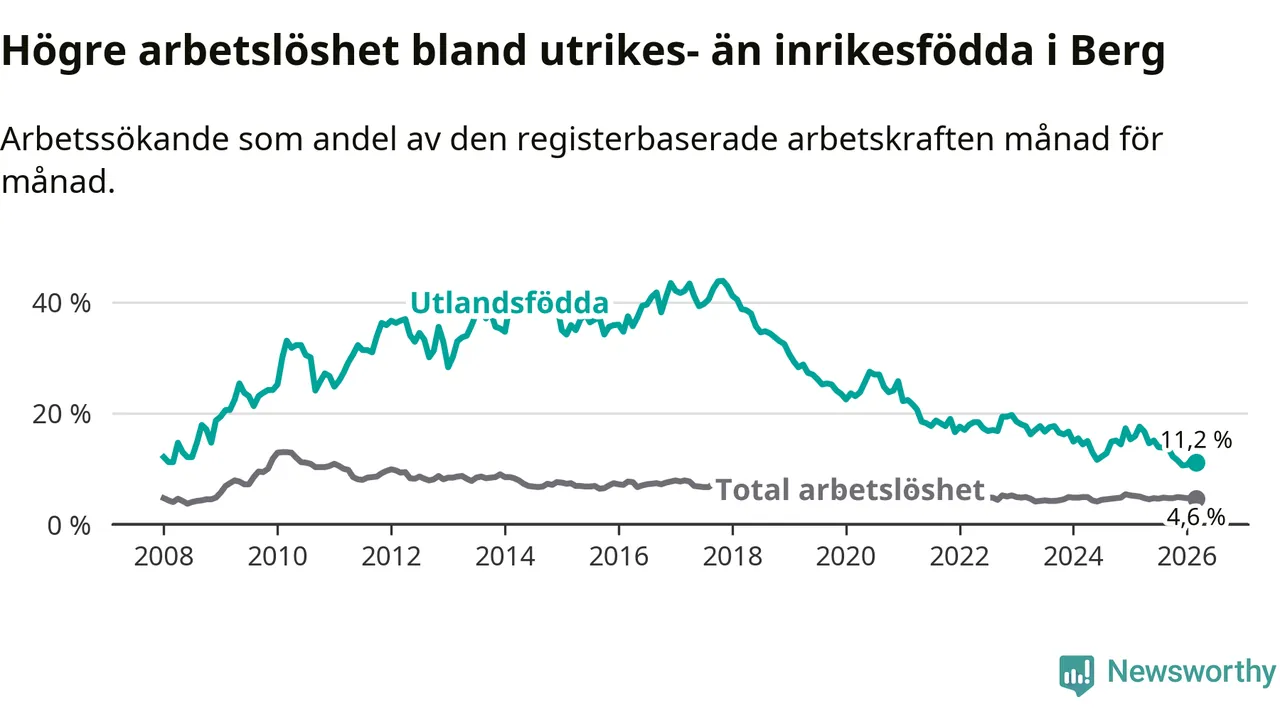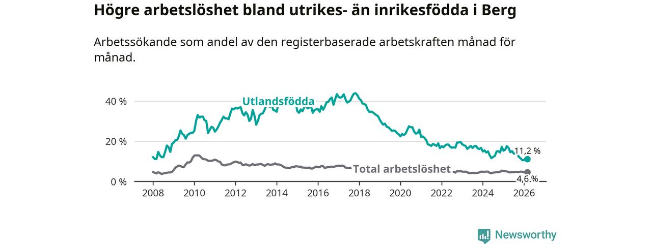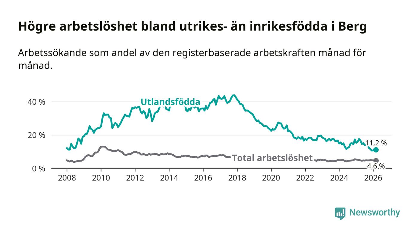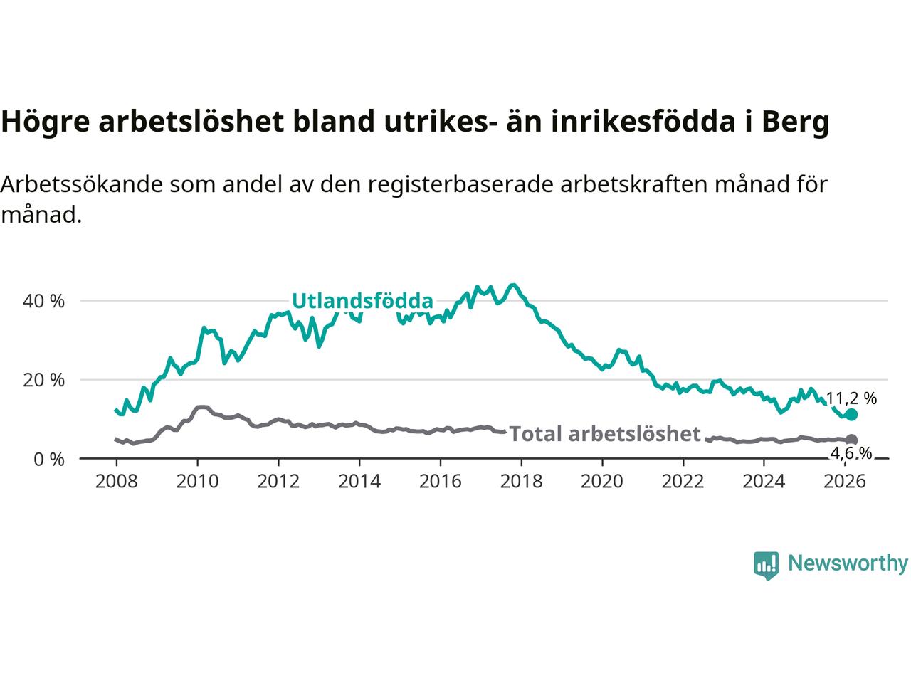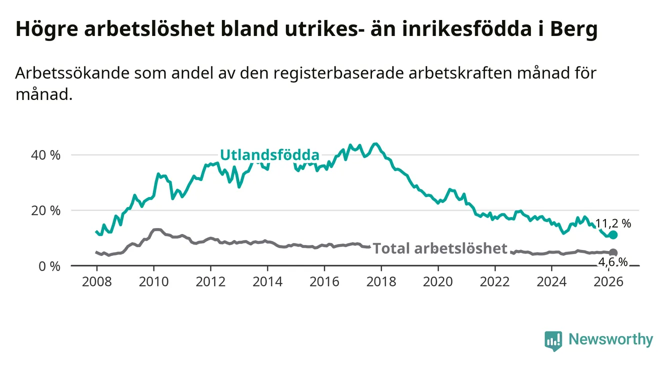 Arbetslösheten bland utlandsfödda var 11,2 procent i Berg under mars månad, motsvarande 41 av 366 personer. Det är 6,4 procentenheter färre än vid samma tidpunkt i fjol (−19 om man räknar personer). Därmed är de utlandsföddas arbetslöshet lägre än vid samma tidpunkt i fjol för sjunde månaden i följd. Sedan augusti 2025 har arbetslösheten bland utlandsfödda minskat från 13,8 till 11,2 procent.