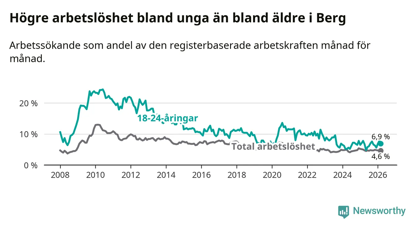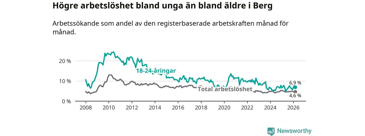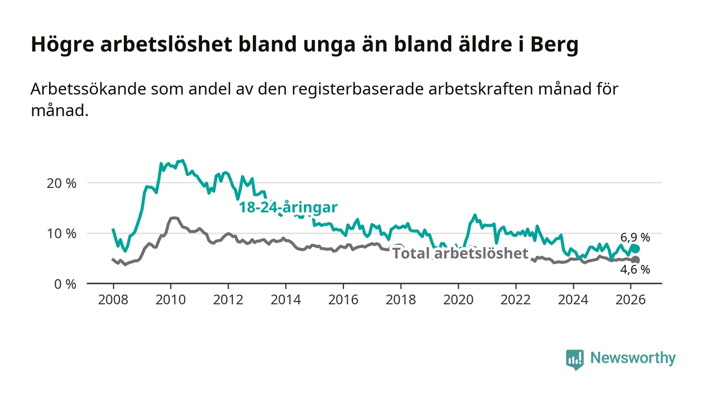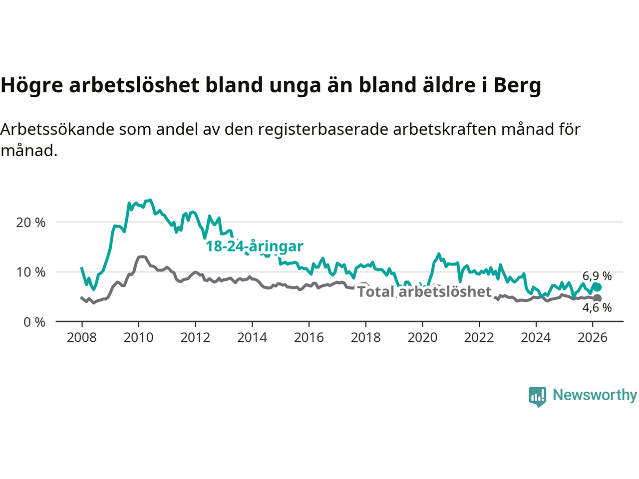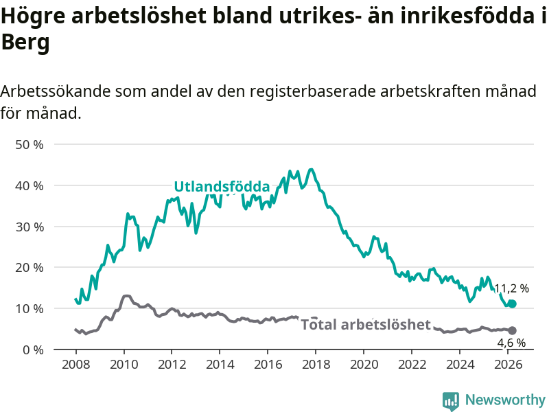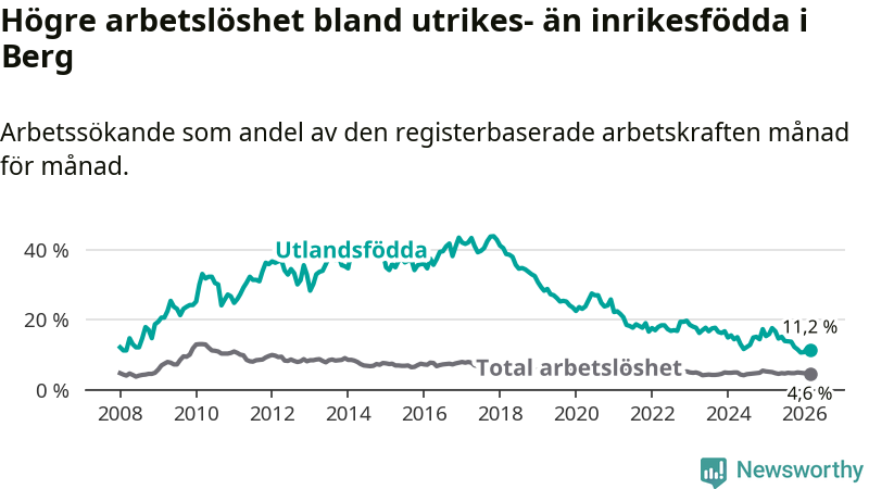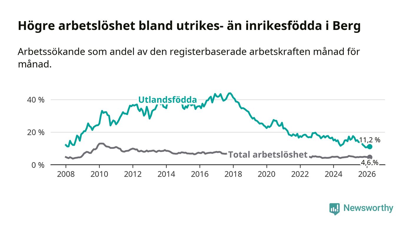 Arbetslösheten bland utlandsfödda var 11,2 procent i Berg under mars månad, motsvarande 41 av 366 personer. Det är 6,4 procentenheter färre än vid samma tidpunkt i fjol (−19 om man räknar personer). Därmed är de utlandsföddas arbetslöshet lägre än vid samma tidpunkt i fjol för sjunde månaden i följd. Sedan augusti 2025 har arbetslösheten bland utlandsfödda minskat från 13,8 till 11,2 procent.