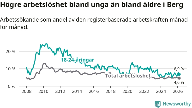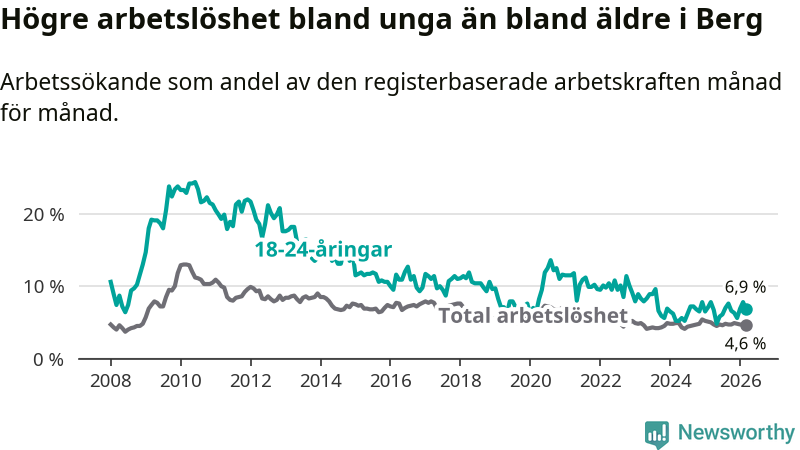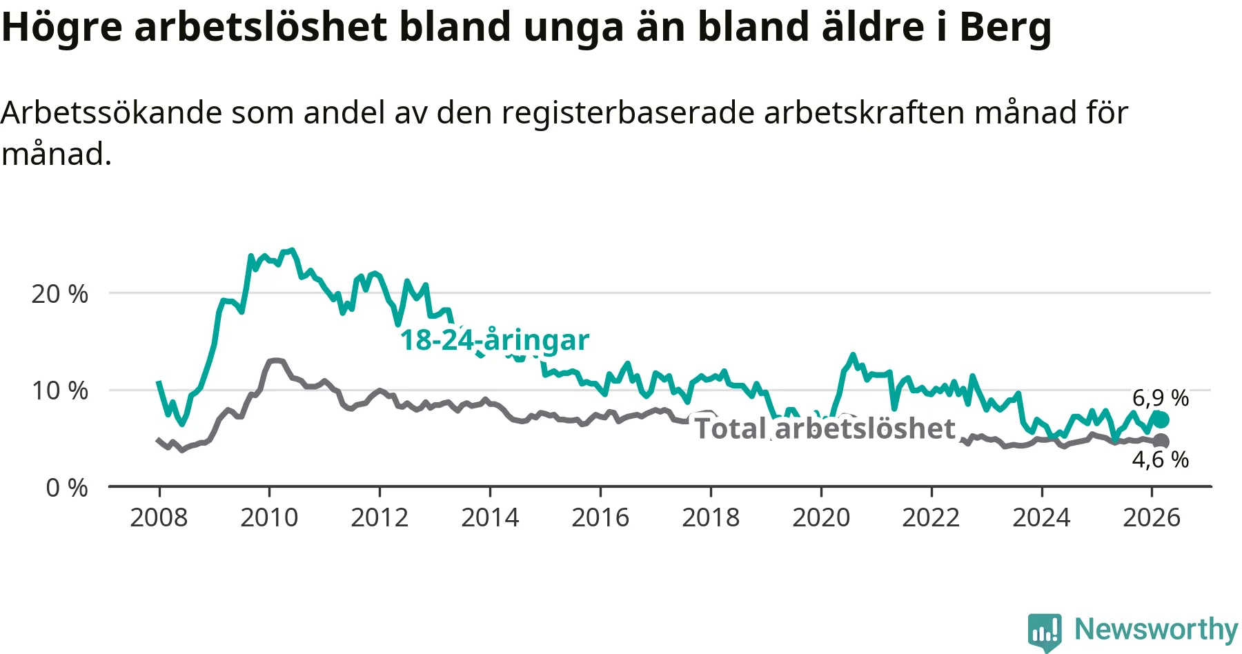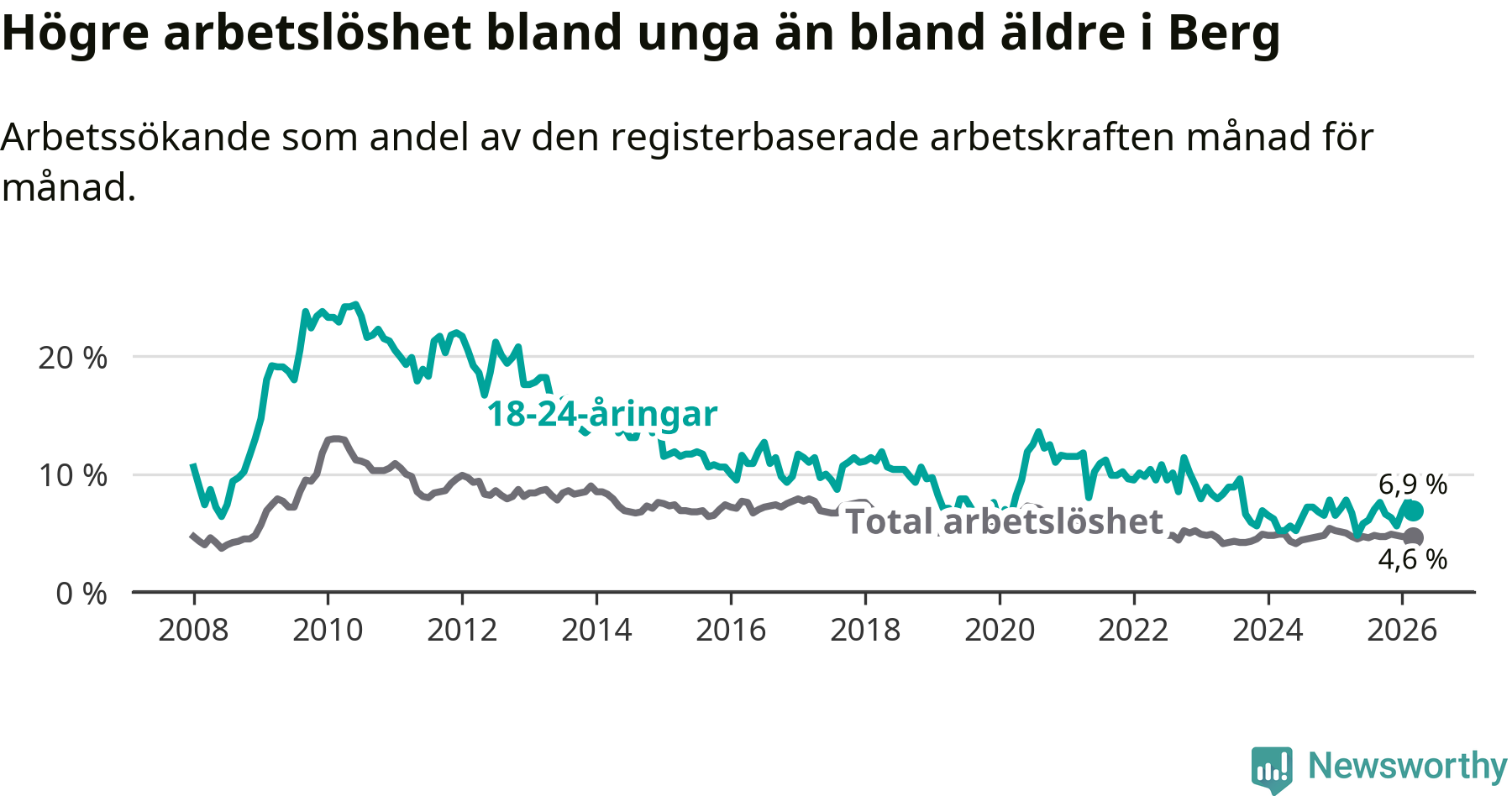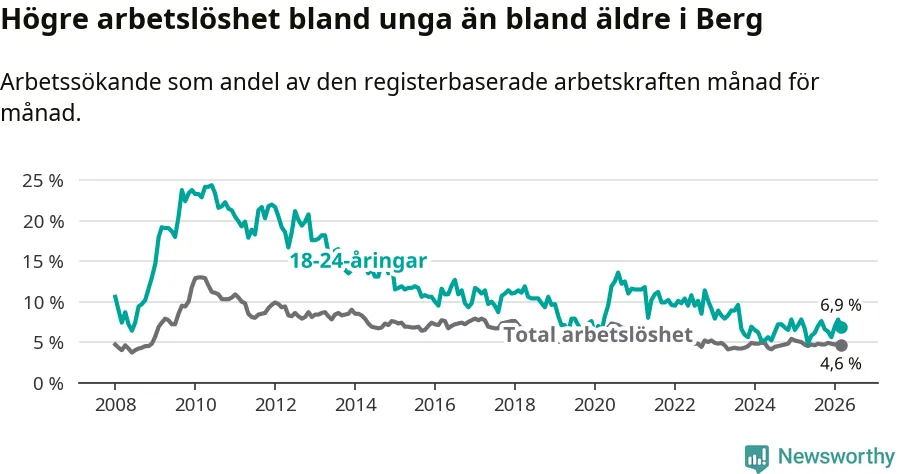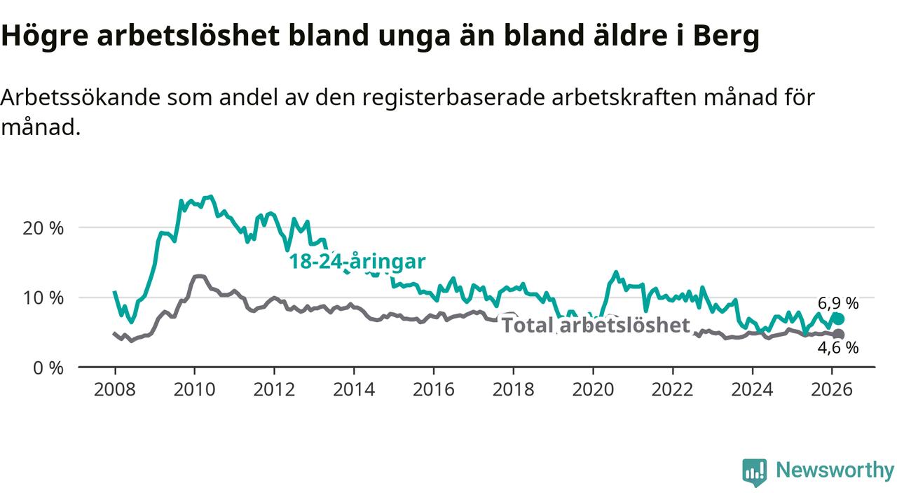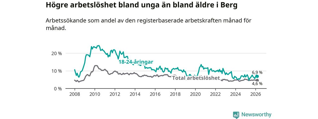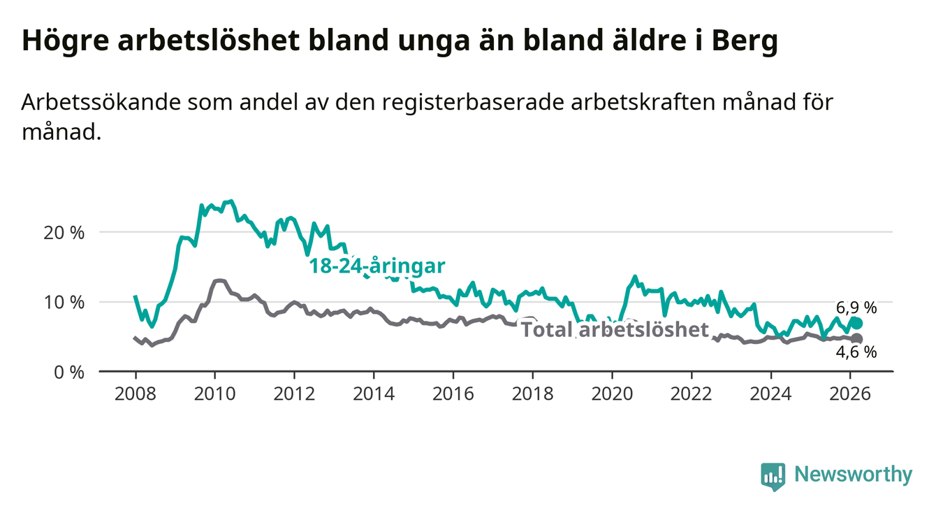Arbetslösheten bland utlandsfödda var 11,2 procent i Berg under mars månad, motsvarande 41 av 366 personer. Det är 6,4 procentenheter färre än vid samma tidpunkt i fjol (−19 om man räknar personer). Därmed är de utlandsföddas arbetslöshet lägre än vid samma tidpunkt i fjol för sjunde månaden i följd. Sedan augusti 2025 har arbetslösheten bland utlandsfödda minskat från 13,8 till 11,2 procent.