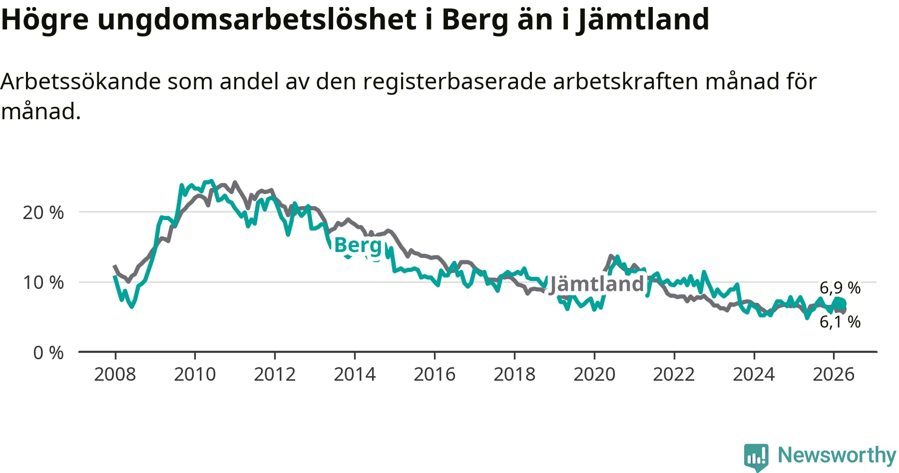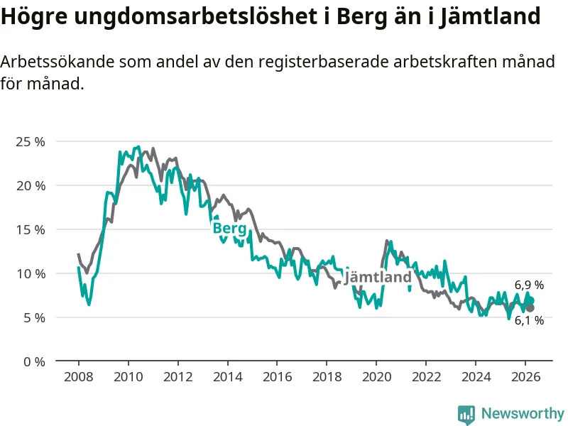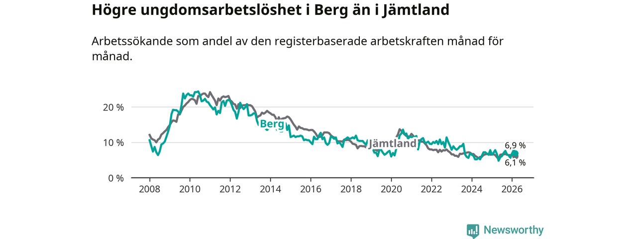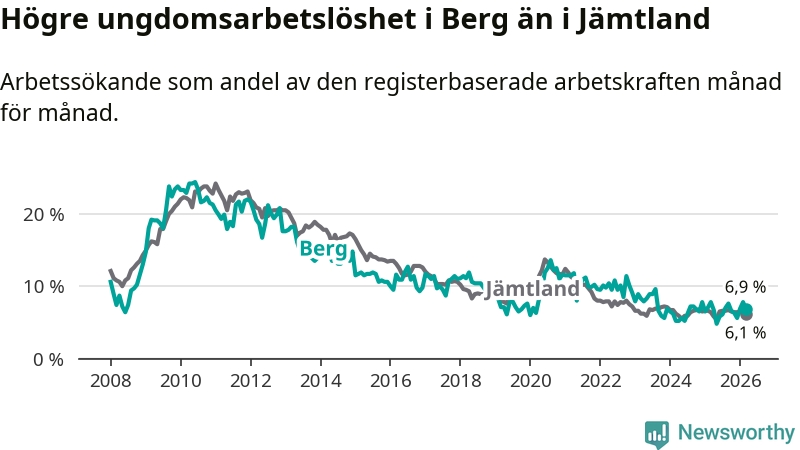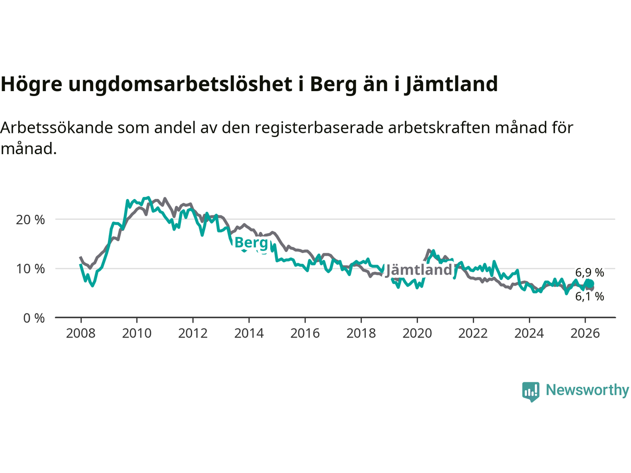 Precis som den totala arbetslösheten ligger ungdomsarbetslösheten i Berg högre än i Jämtland som helhet. Skillnaden mellan kommunen och länet är 0,8 procentenheter.