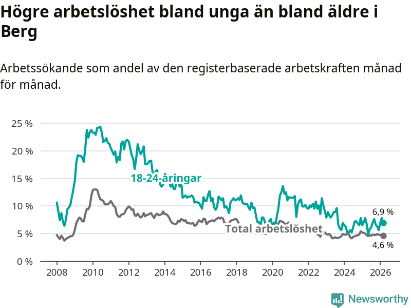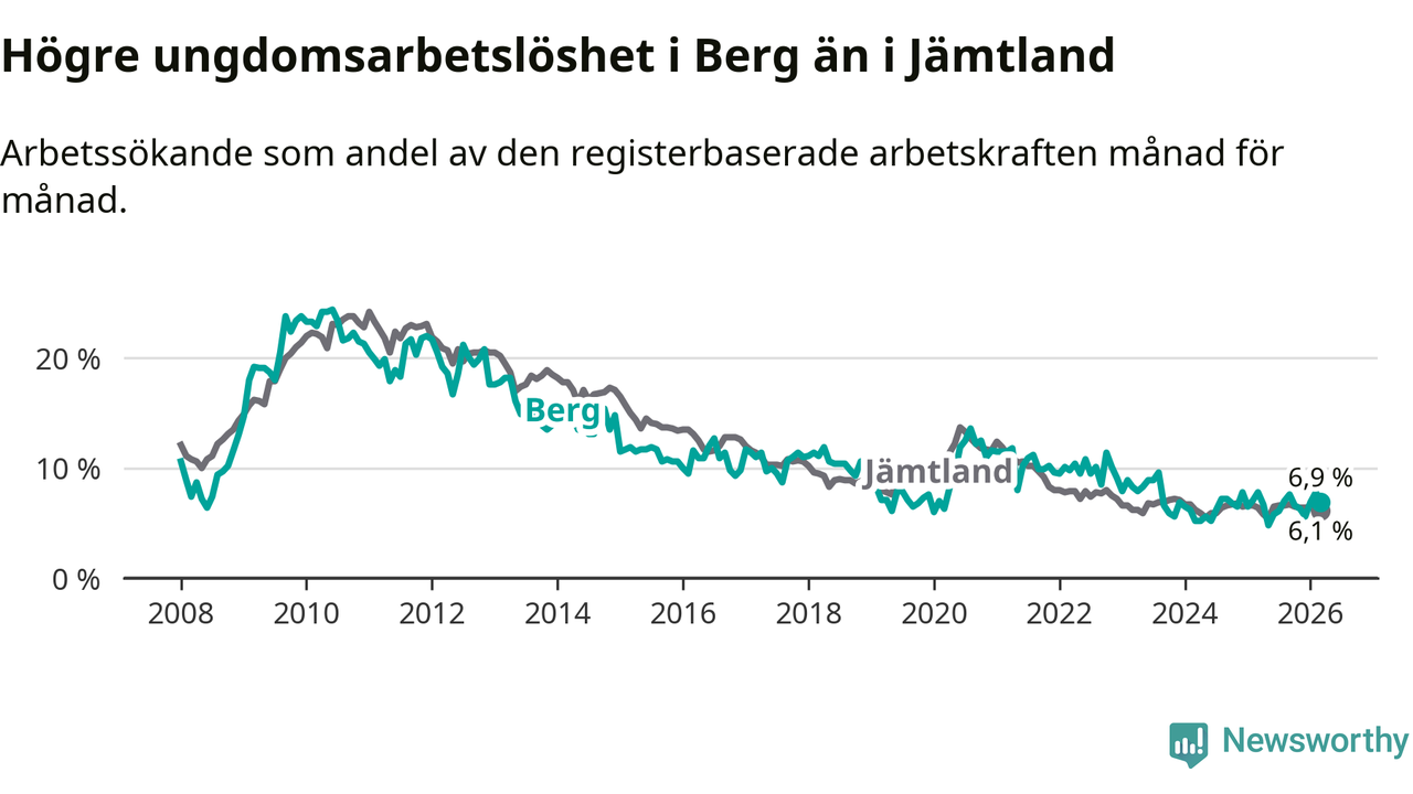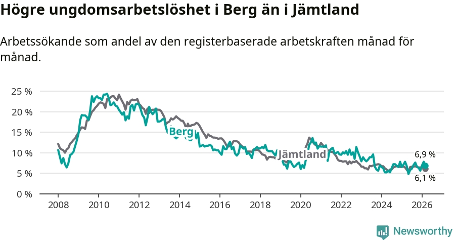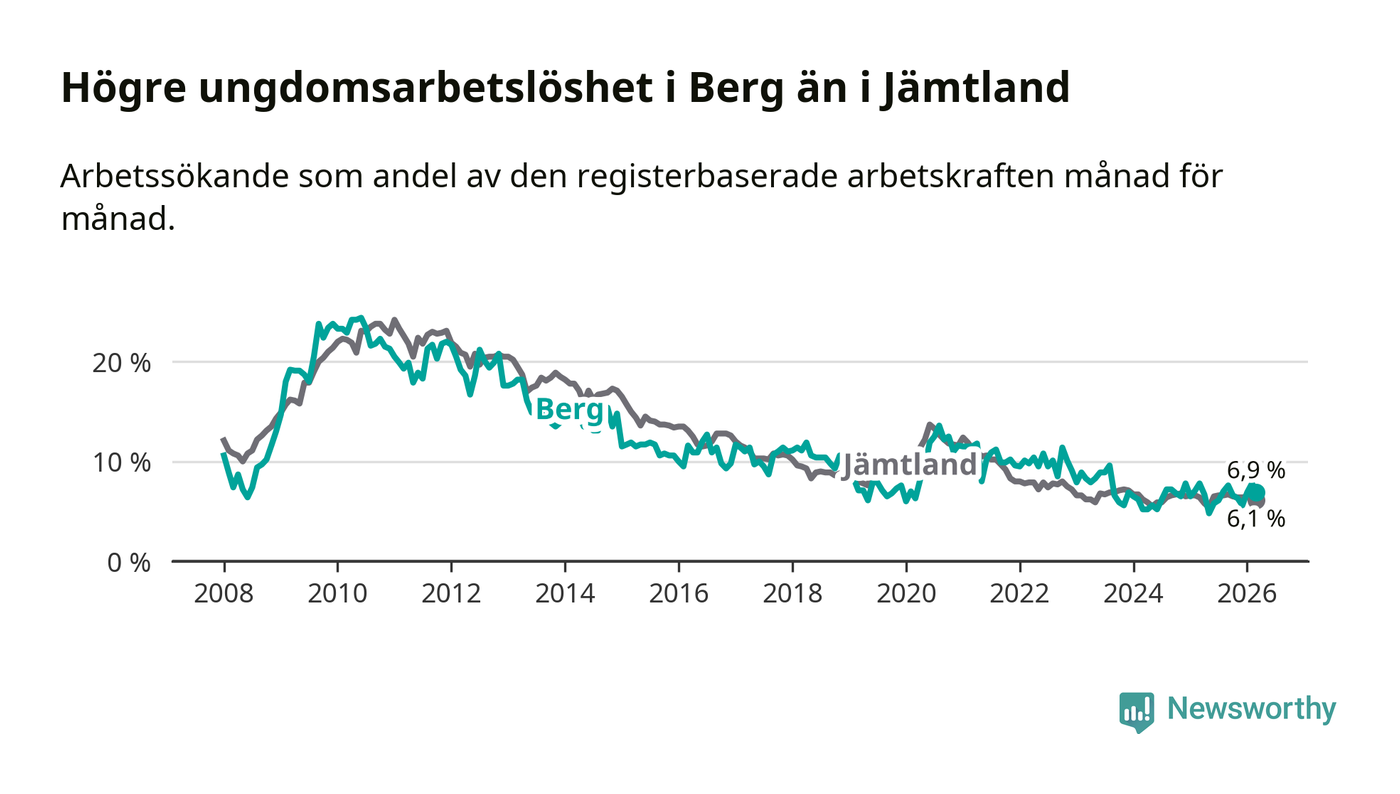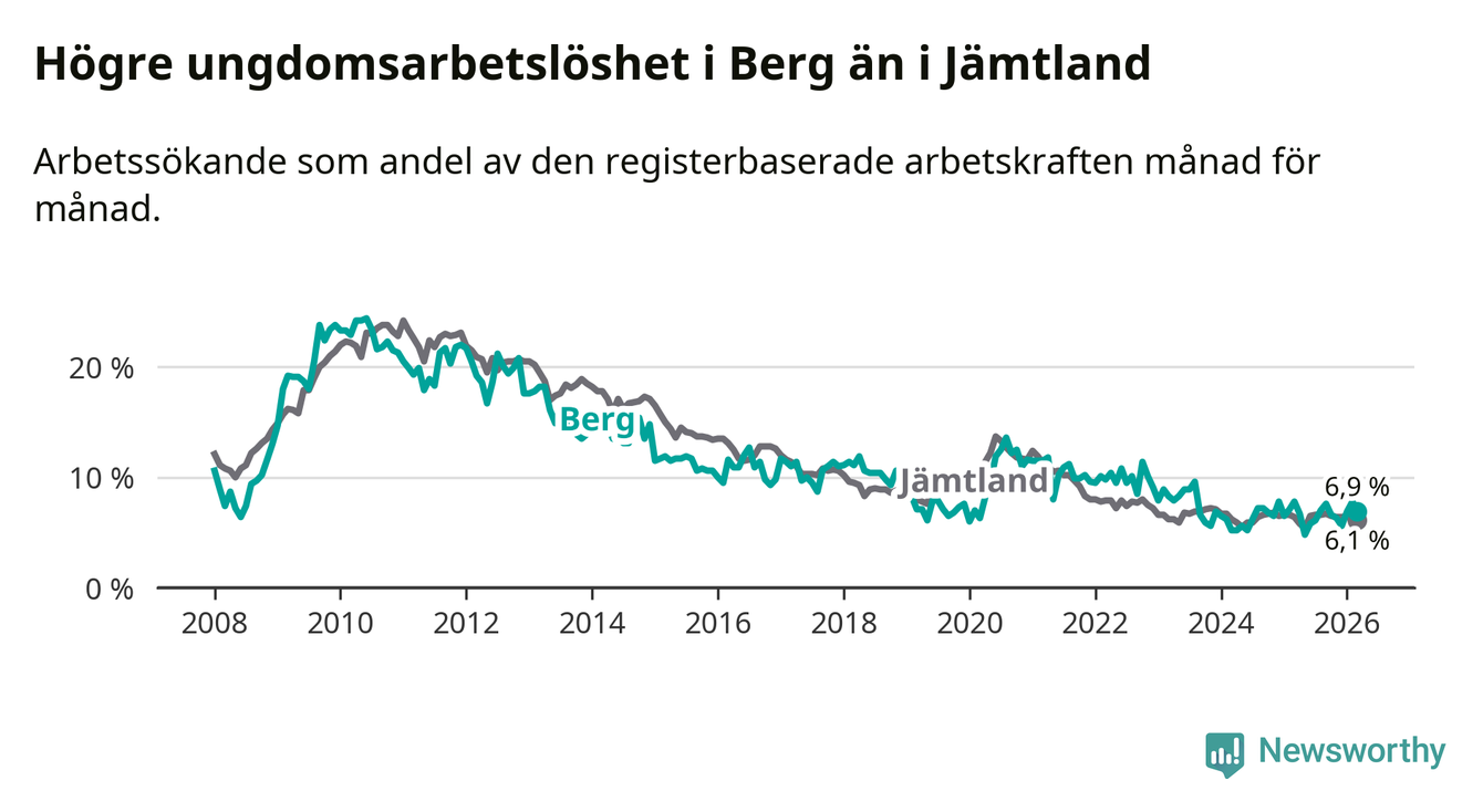 Precis som den totala arbetslösheten ligger ungdomsarbetslösheten i Berg högre än i Jämtland som helhet. Skillnaden mellan kommunen och länet är 0,8 procentenheter.