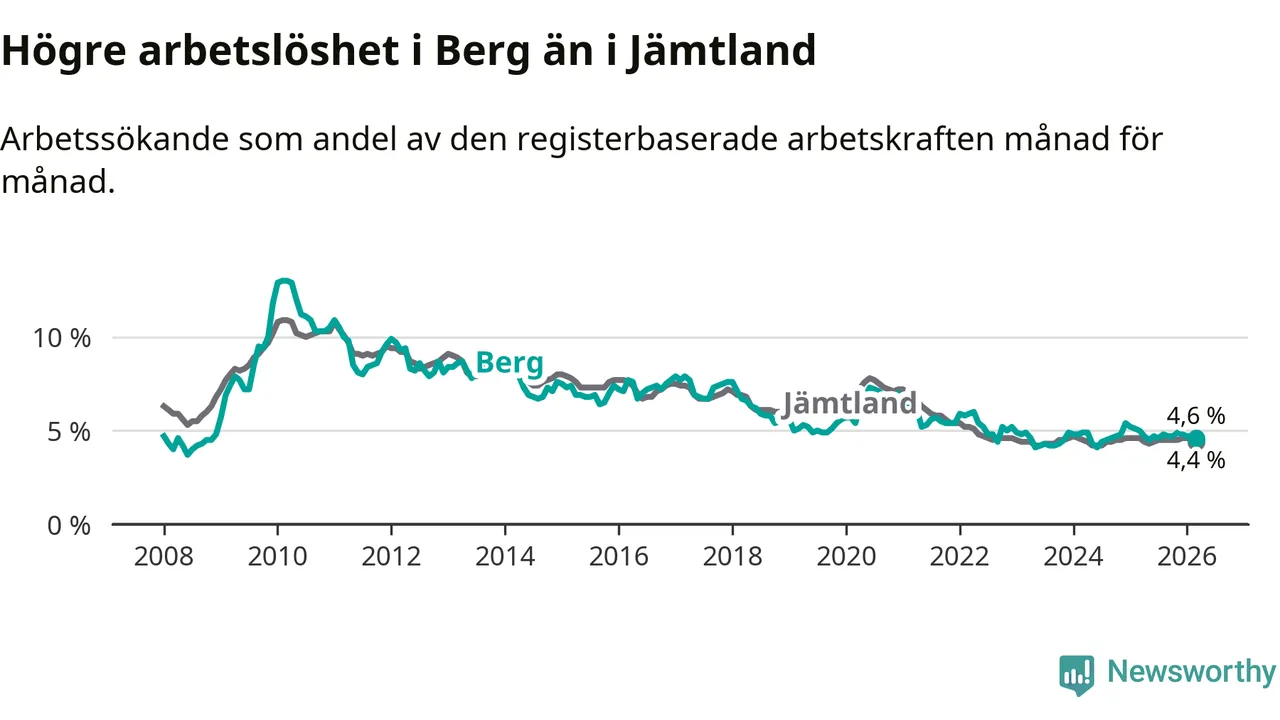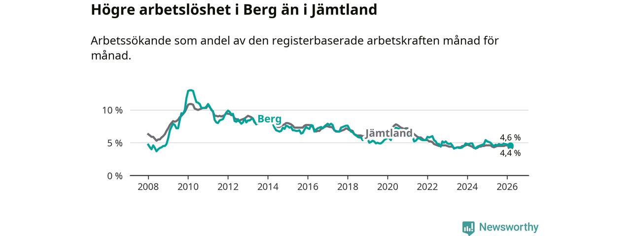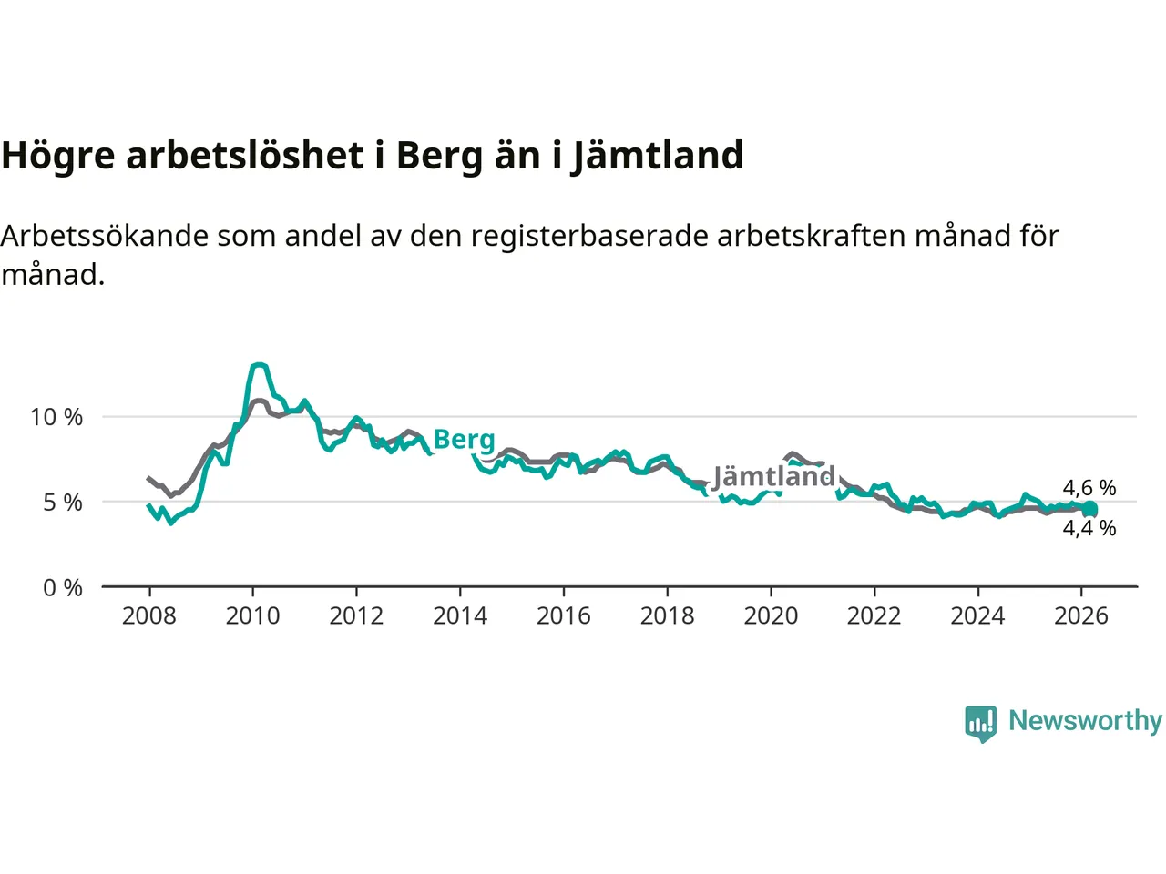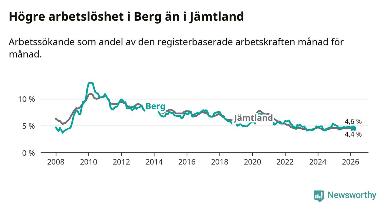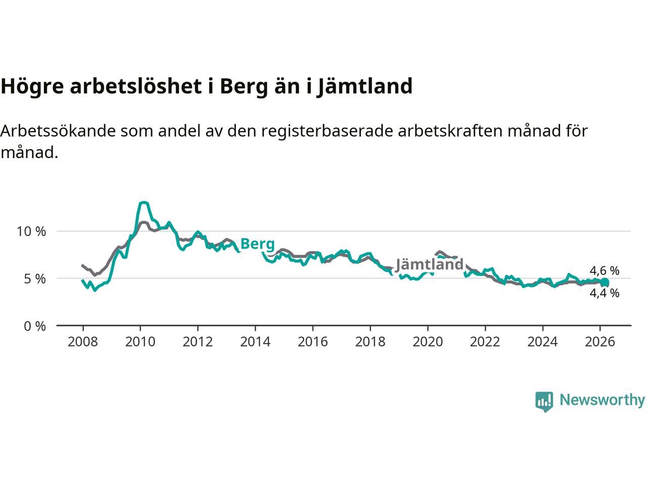 Under mars månad rapporterade Bergs kommun en total arbetslöshet på 4,6 procent. Det är en minskning jämfört med samma tidpunkt i fjol (−0,4 procentenheter). Även i Jämtlands län sjunker arbetslösheten .