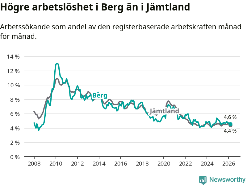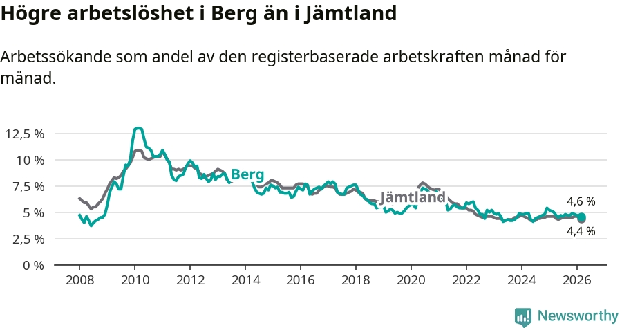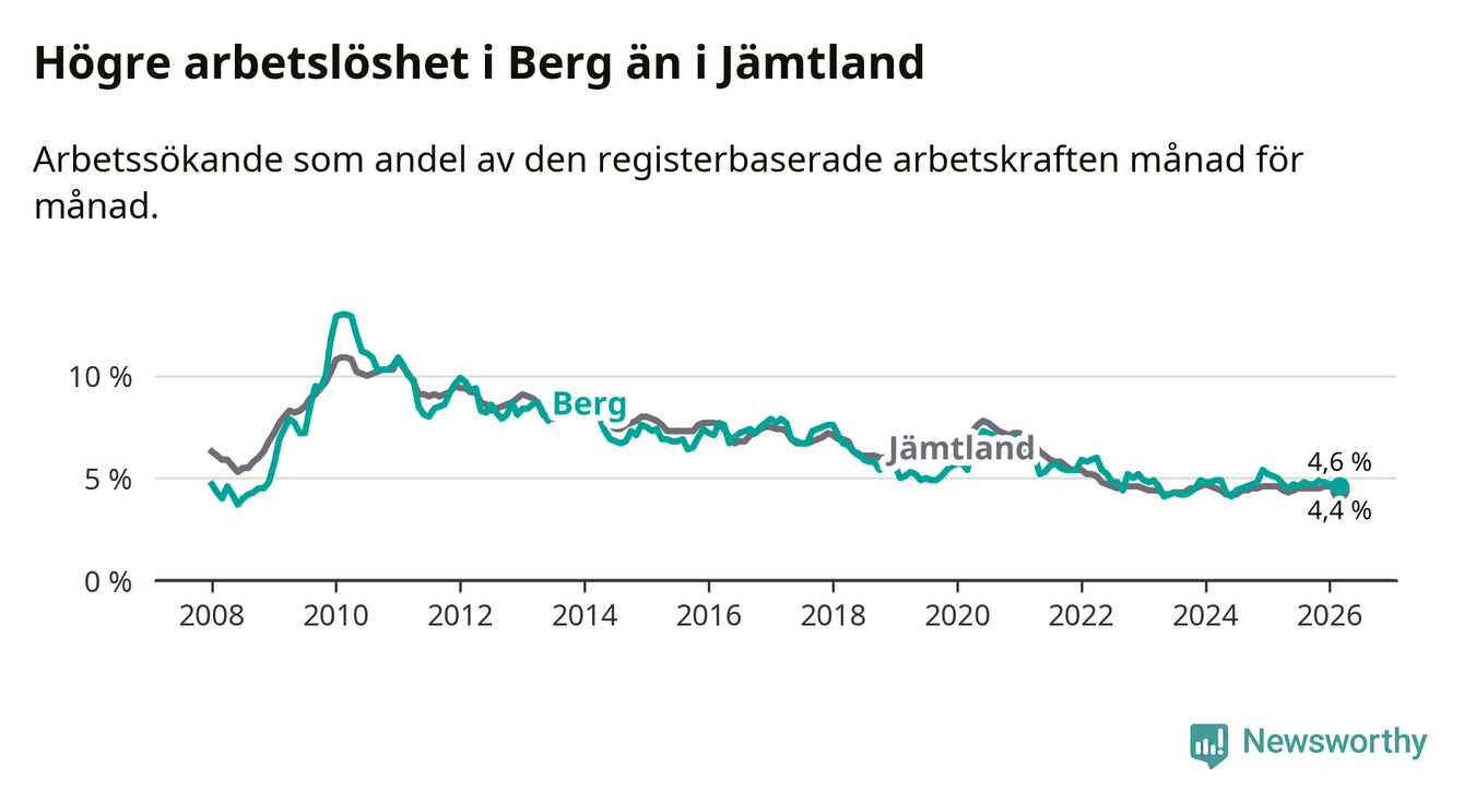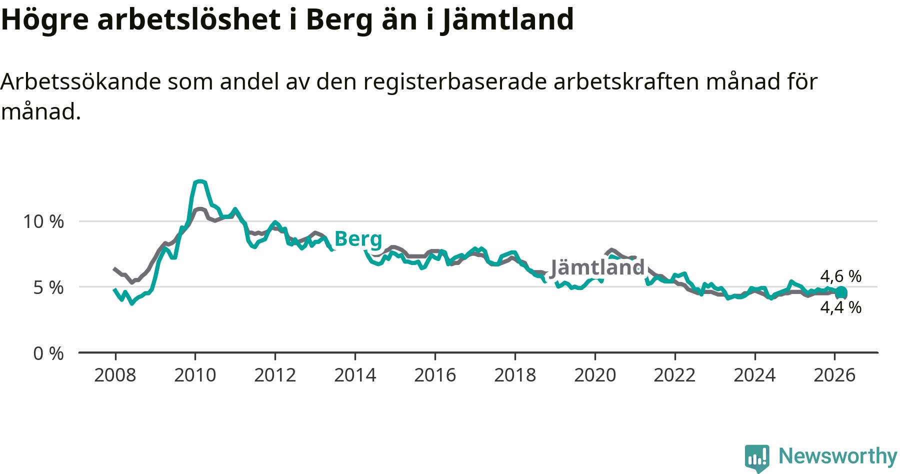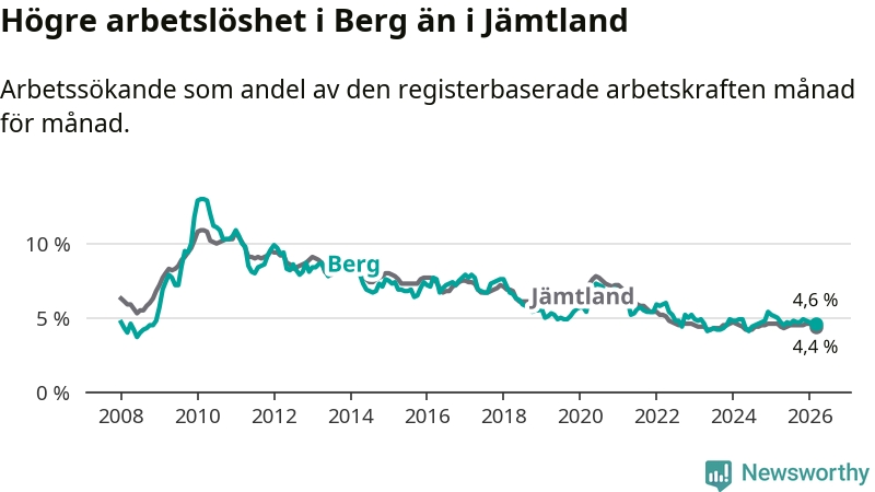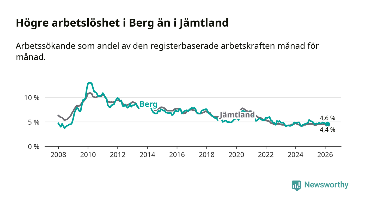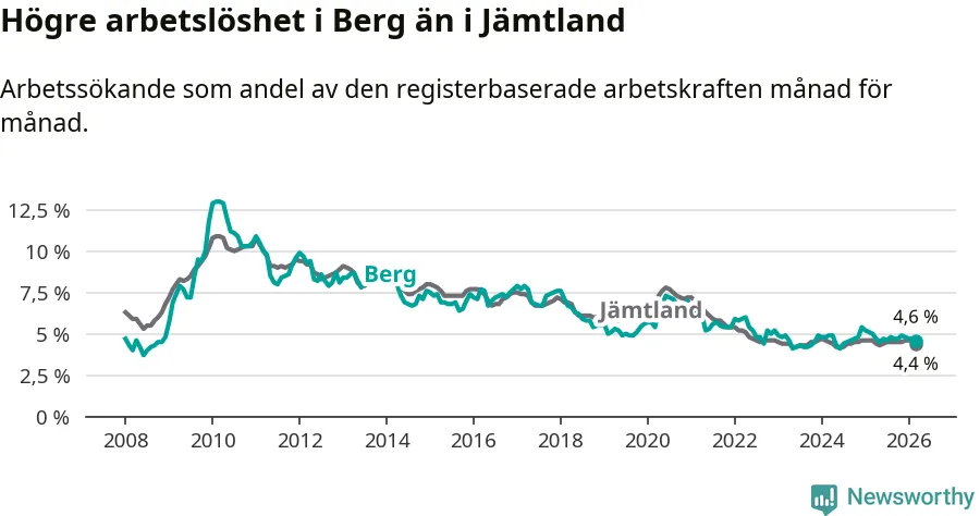 Under mars månad rapporterade Bergs kommun en total arbetslöshet på 4,6 procent. Det är en minskning jämfört med samma tidpunkt i fjol (−0,4 procentenheter). Även i Jämtlands län sjunker arbetslösheten .