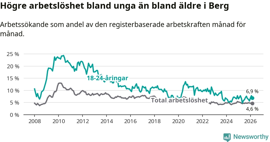 Precis som den totala arbetslösheten sjunker arbetslösheten bland unga (−0,9 procentenheter). I mars var 6,9 procent av 18–24-åringarna inskrivna som arbetssökande (motsvarande 22 personer). Mäter vi antalet inskrivna ser vi en minskning med två personer på ett års sikt.