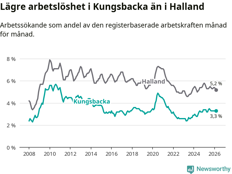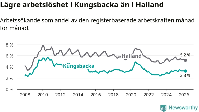 Kungsbacka hade redan tidigare lägre arbetslöshet än snittet i hela Hallands län och nu växer klyftan (3,3 procent i kommunen, jämfört med 5,2 procent i hela länet). Kungsbacka har därmed även den lägsta arbetslöshetsnivån i länet. Hylte har den högsta (7,9 procent).