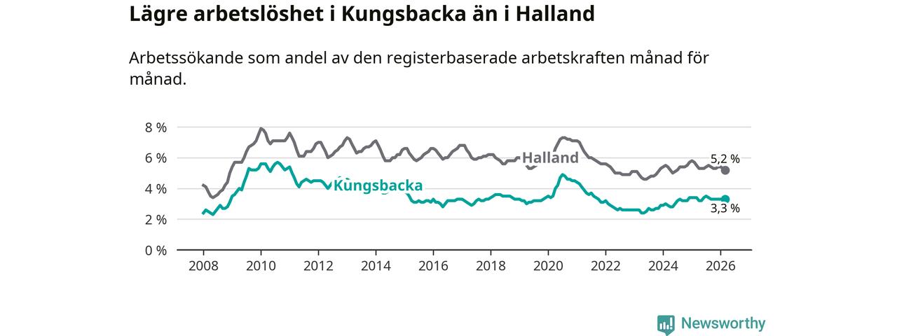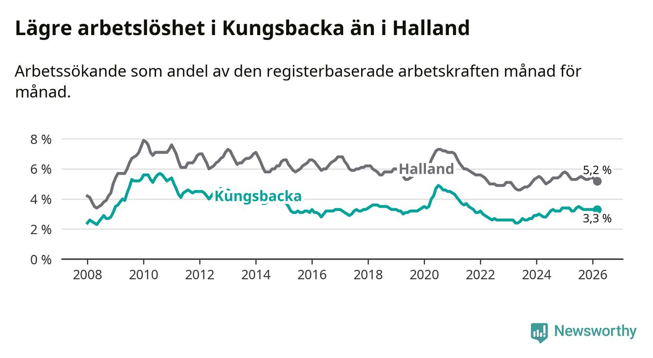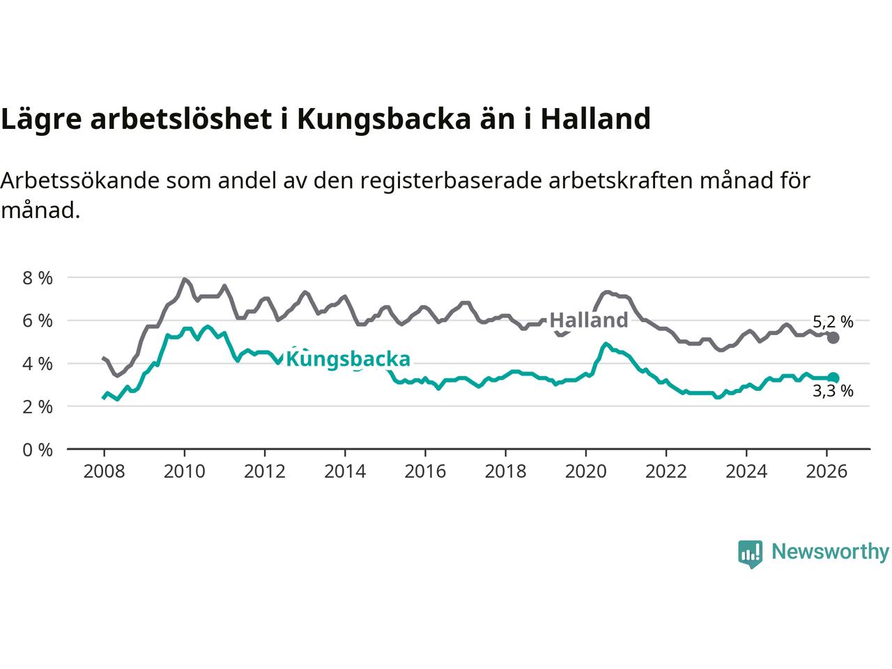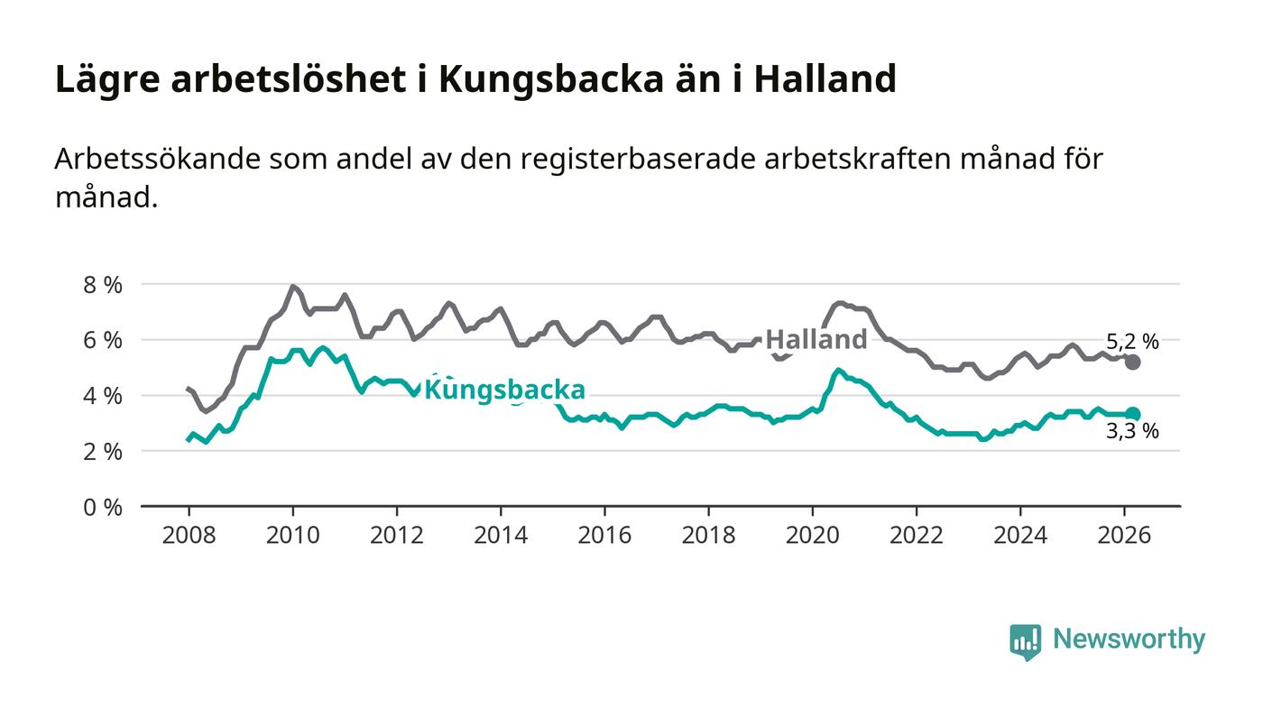 Under mars månad rapporterade Kungsbacka kommun en total arbetslöshet på 3,3 procent. Det är en minskning jämfört med samma tidpunkt i fjol (−0,1 procentenheter). Även i Hallands län sjunker arbetslösheten .