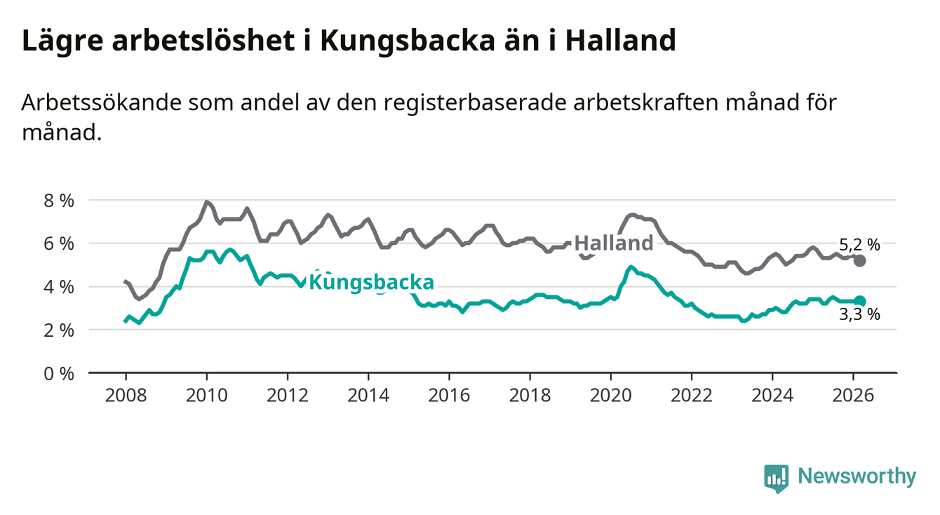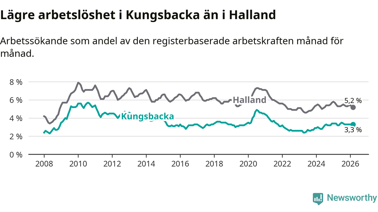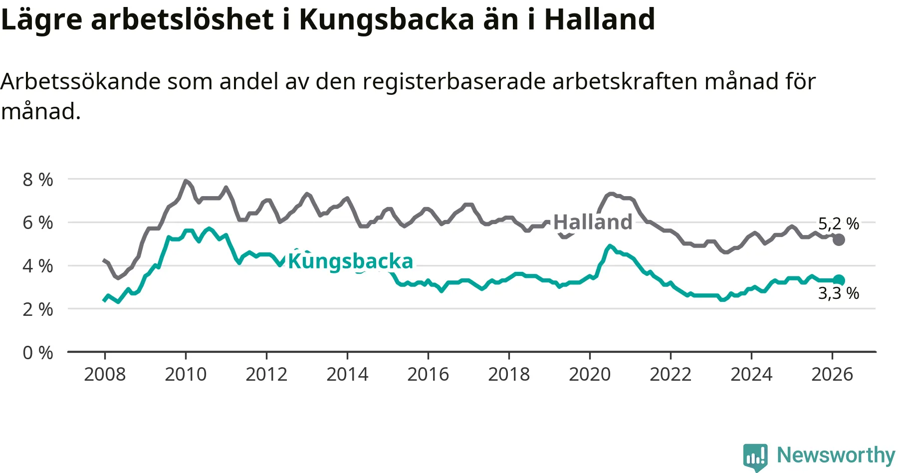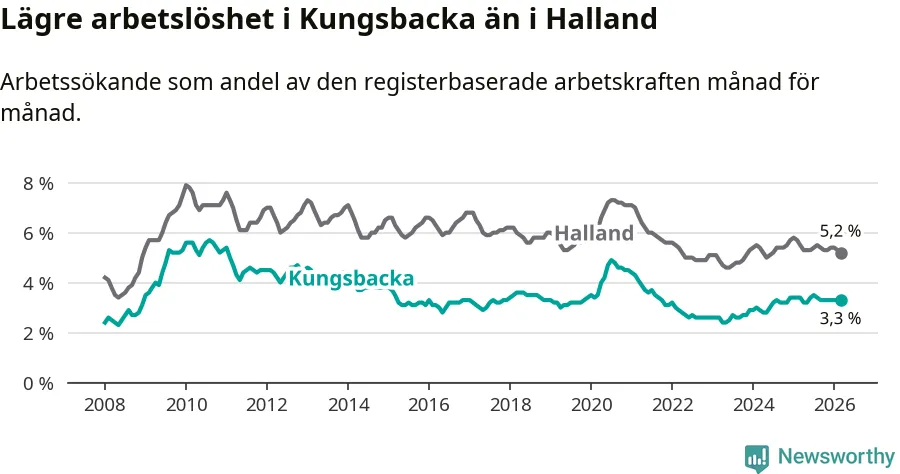 Under mars månad rapporterade Kungsbacka kommun en total arbetslöshet på 3,3 procent. Det är en minskning jämfört med samma tidpunkt i fjol (−0,1 procentenheter). Även i Hallands län sjunker arbetslösheten .