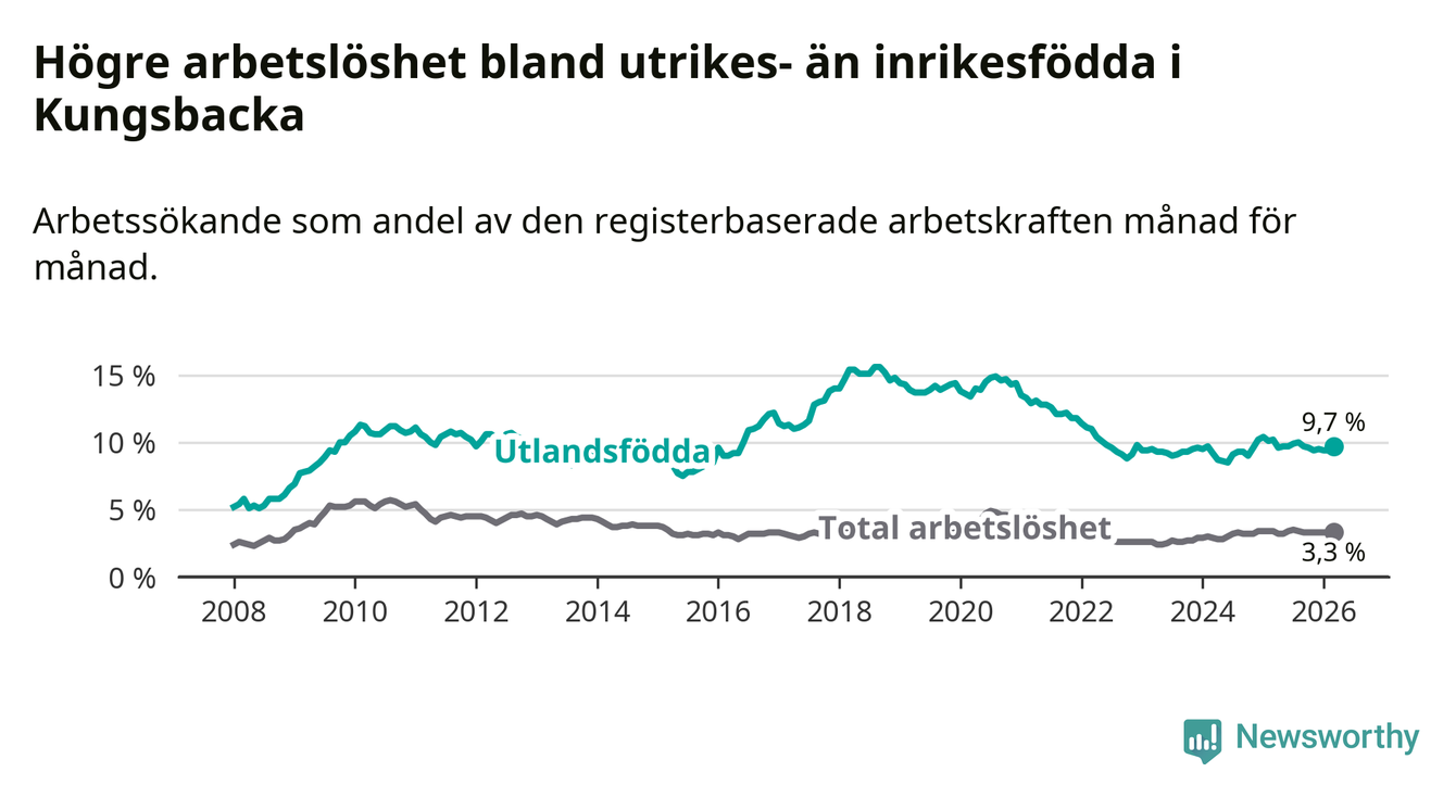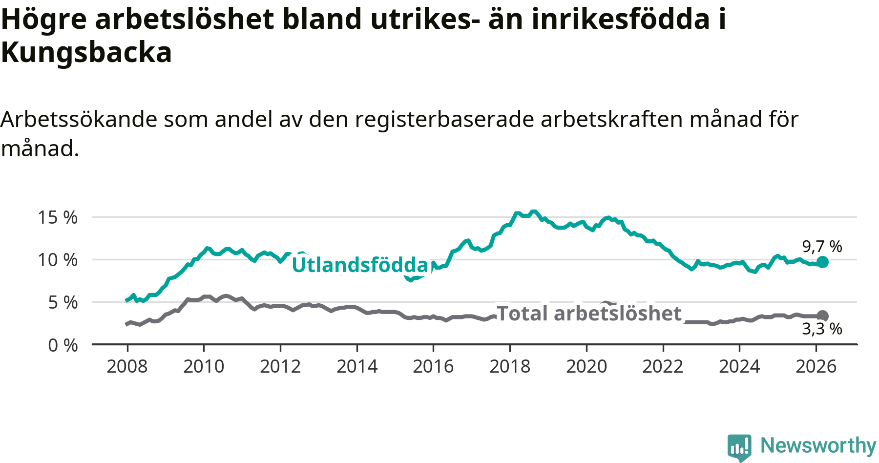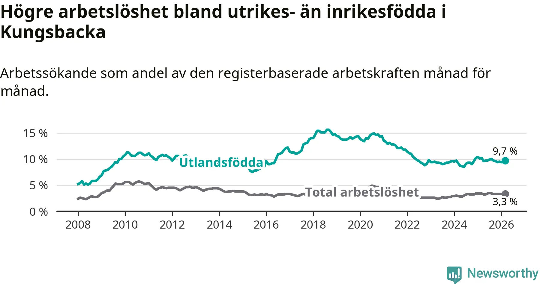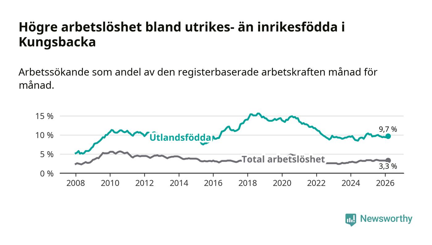Arbetslösheten bland utlandsfödda var 9,7 procent i Kungsbacka under mars månad, motsvarande 459 av 4 732 personer. Det är 0,5 procentenheter färre än vid samma tidpunkt i fjol (−12 om man räknar personer).