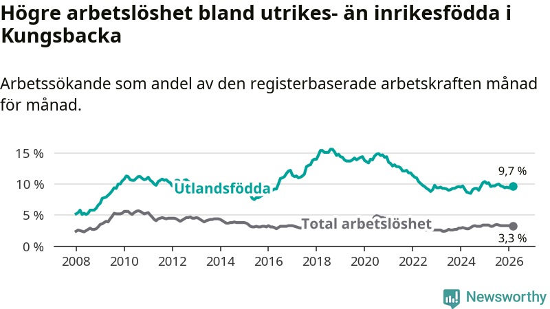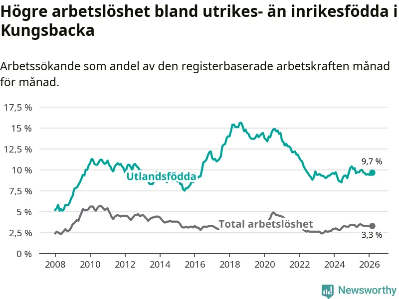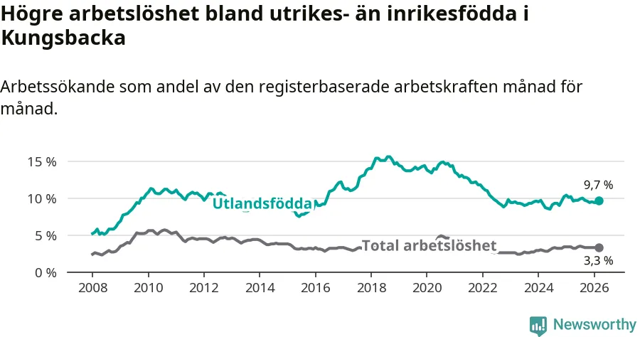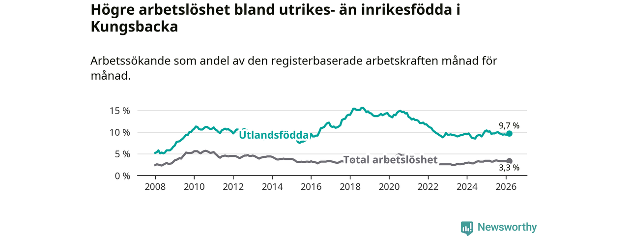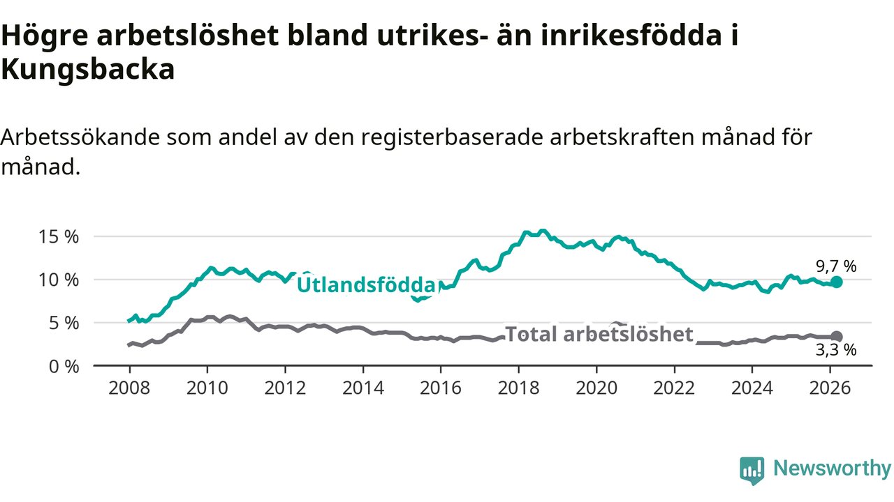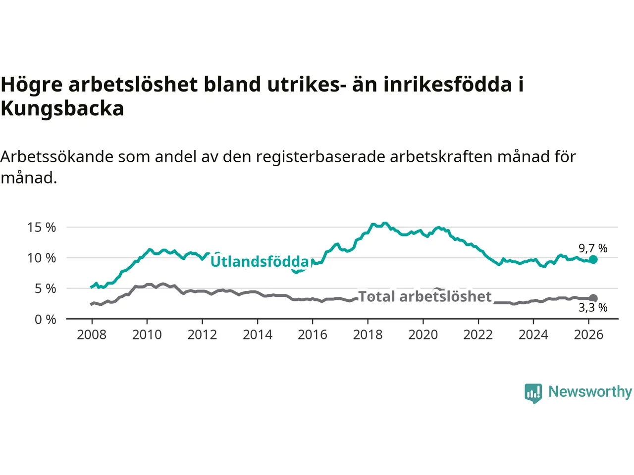 Arbetslösheten bland utlandsfödda var 9,7 procent i Kungsbacka under mars månad, motsvarande 459 av 4 732 personer. Det är 0,5 procentenheter färre än vid samma tidpunkt i fjol (−12 om man räknar personer).