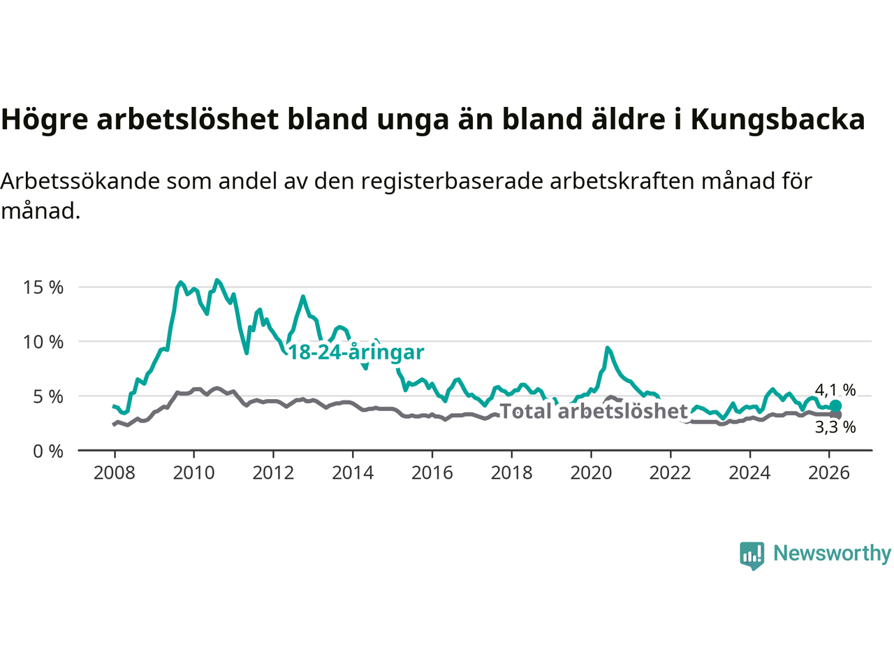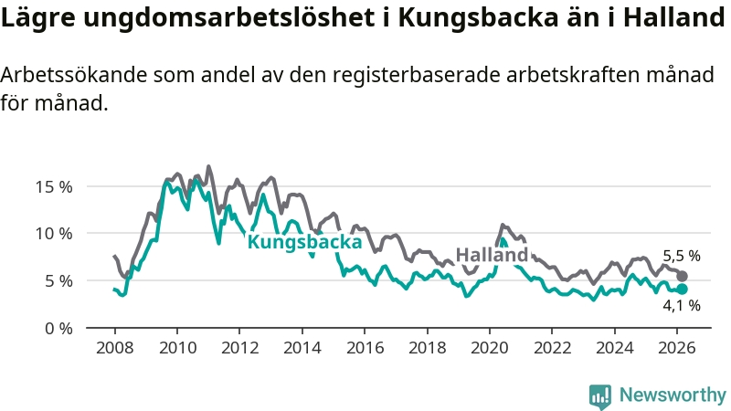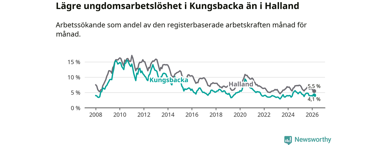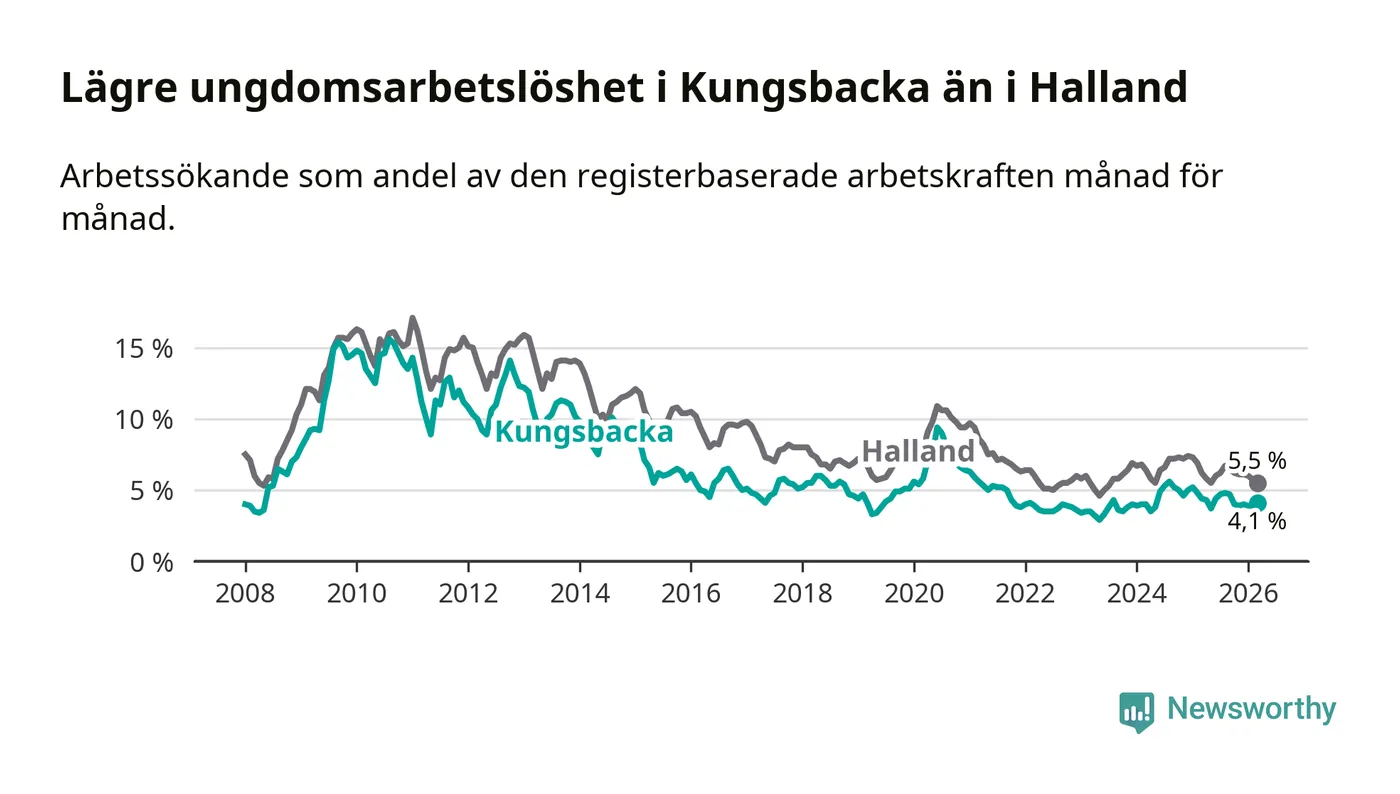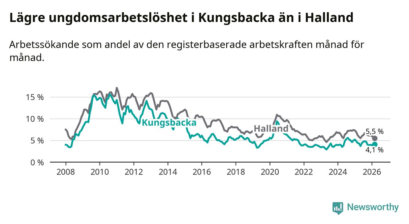 I och med den senaste månadens nedgång har de ungas arbetslöshet i Kungsbacka sjunkit elva månader i följd (ner från 4,3 procent i april 2025 till 4,1 procent nu).
