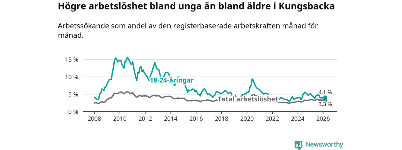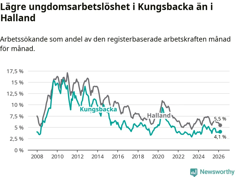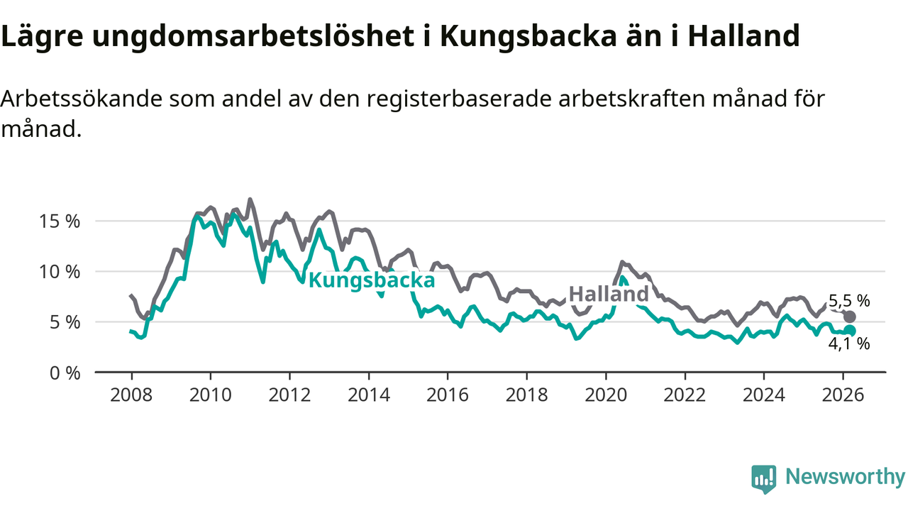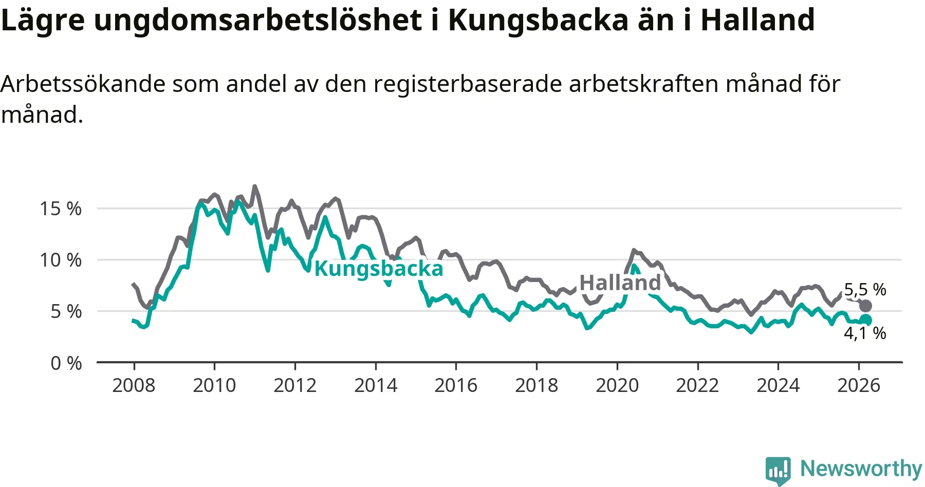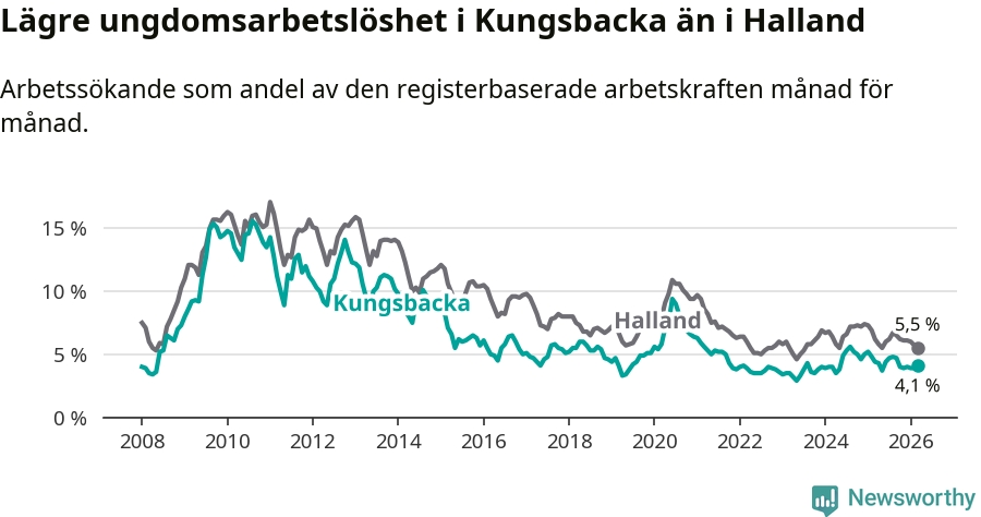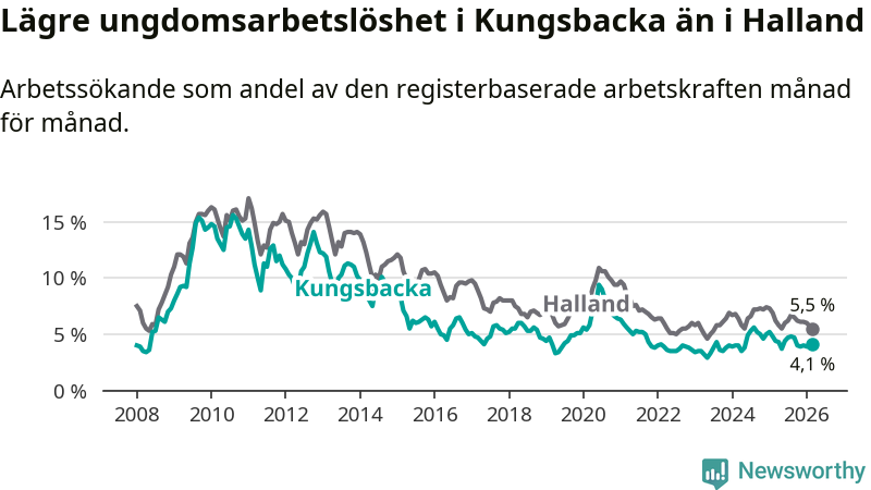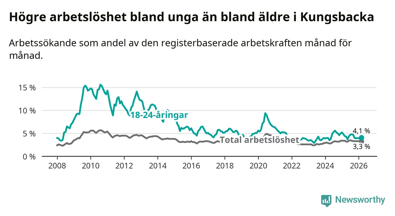 I och med den senaste månadens nedgång har de ungas arbetslöshet i Kungsbacka sjunkit elva månader i följd (ner från 4,3 procent i april 2025 till 4,1 procent nu).