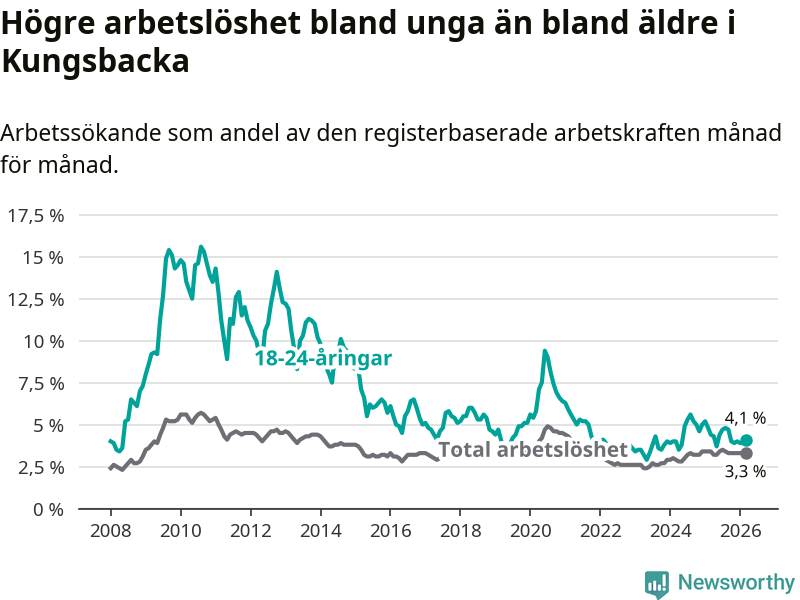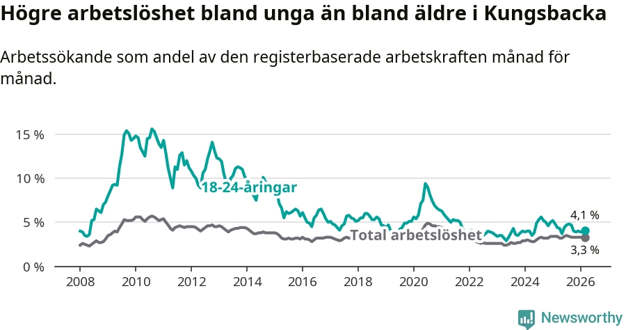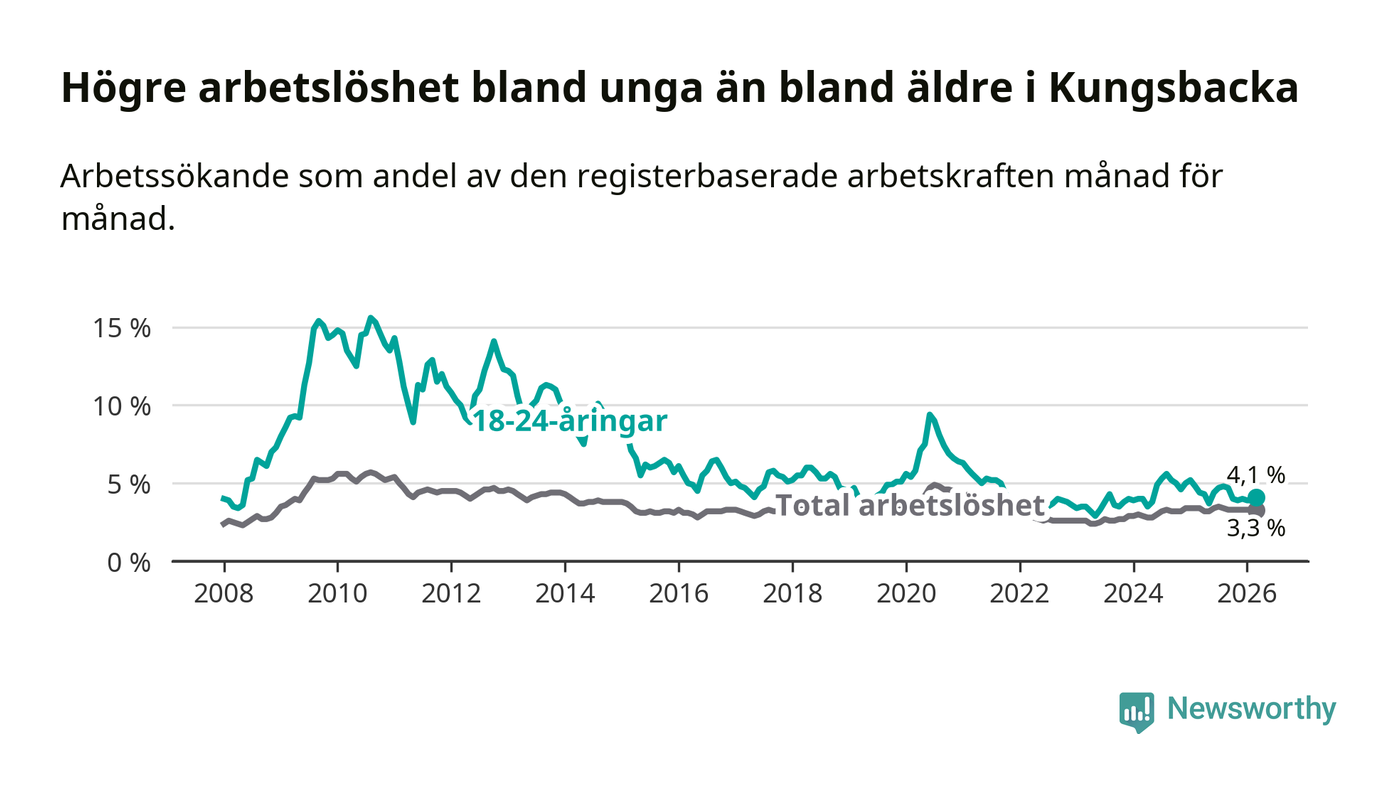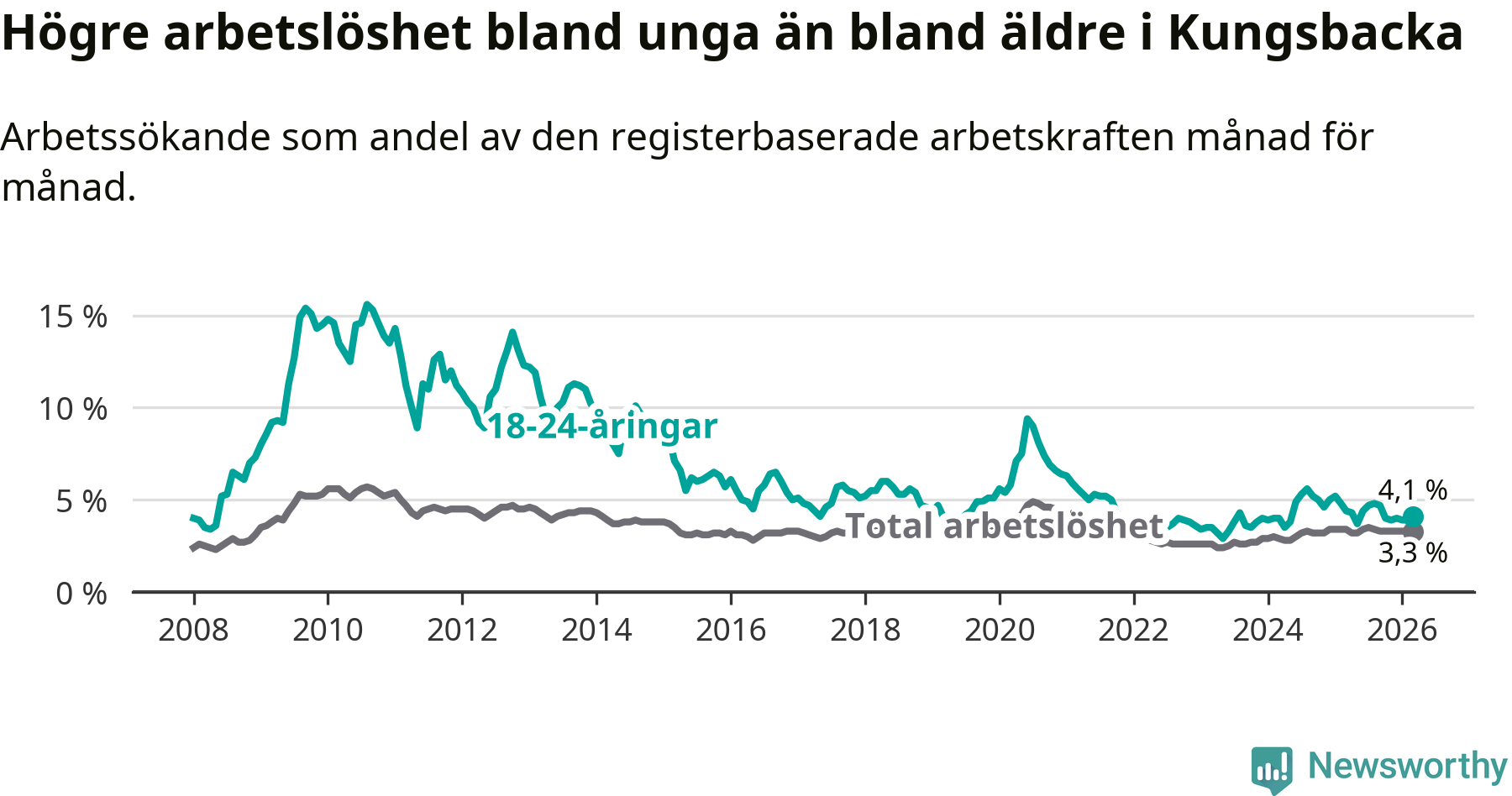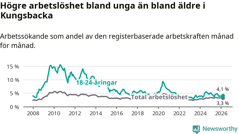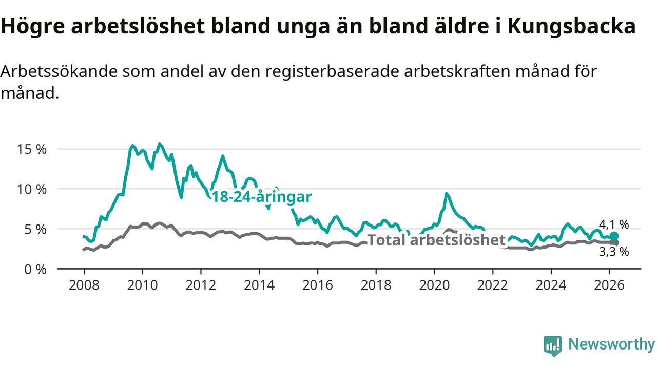 I och med den senaste månadens nedgång har de ungas arbetslöshet i Kungsbacka sjunkit elva månader i följd (ner från 4,3 procent i april 2025 till 4,1 procent nu).
